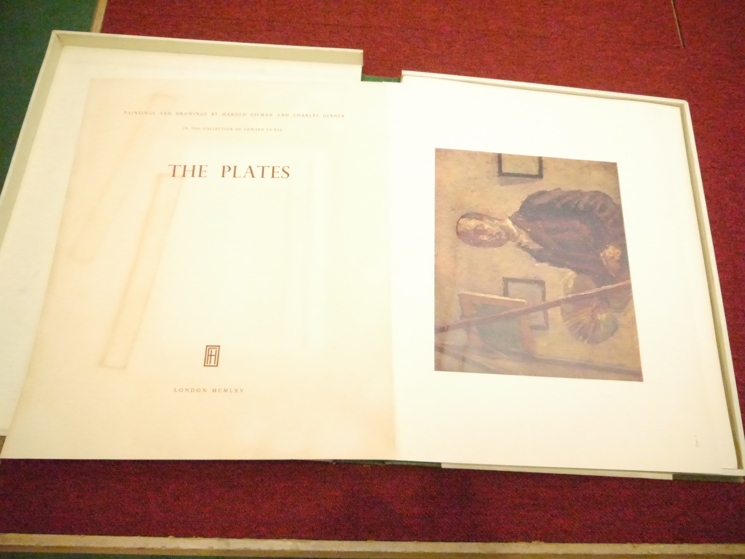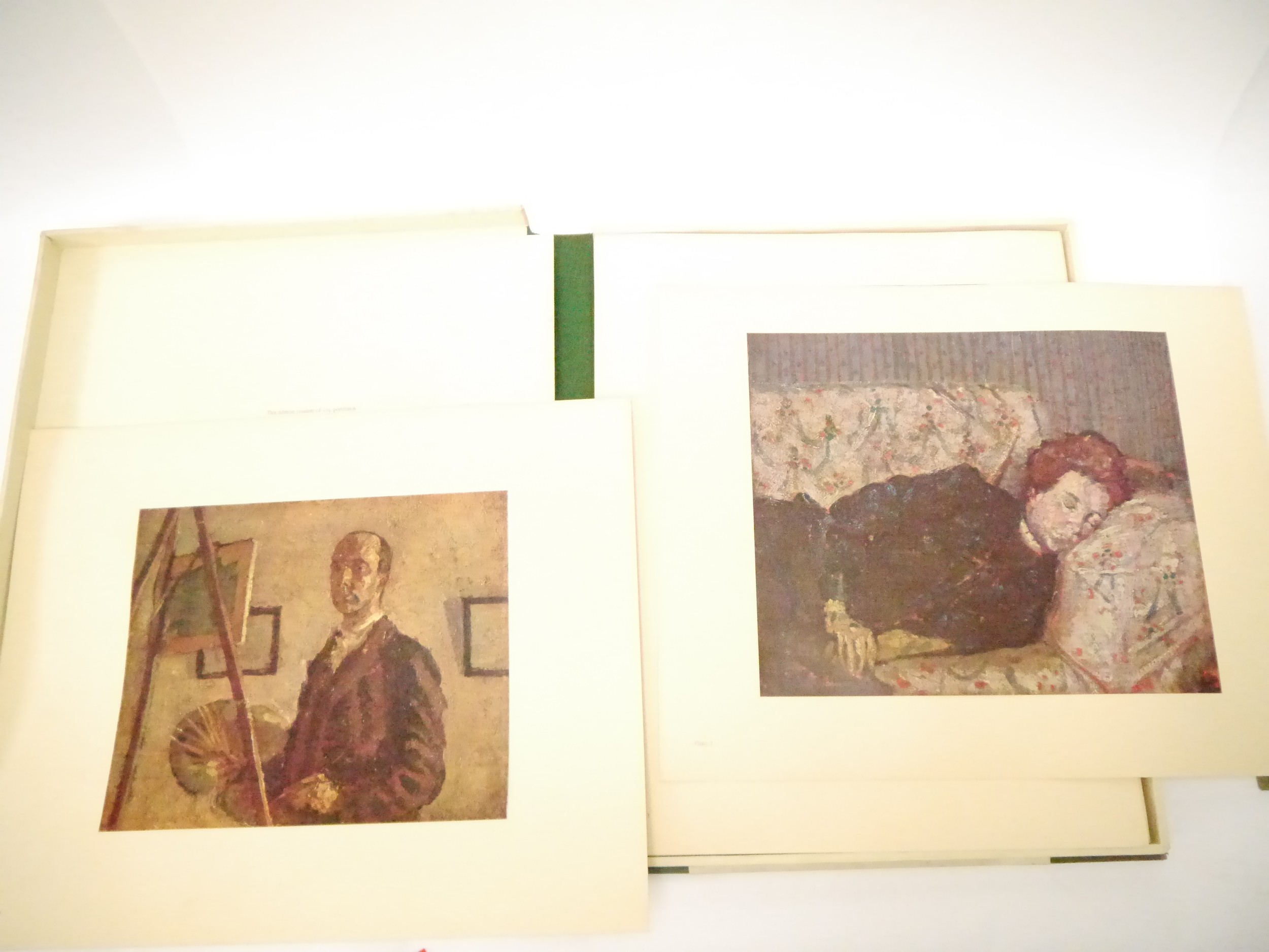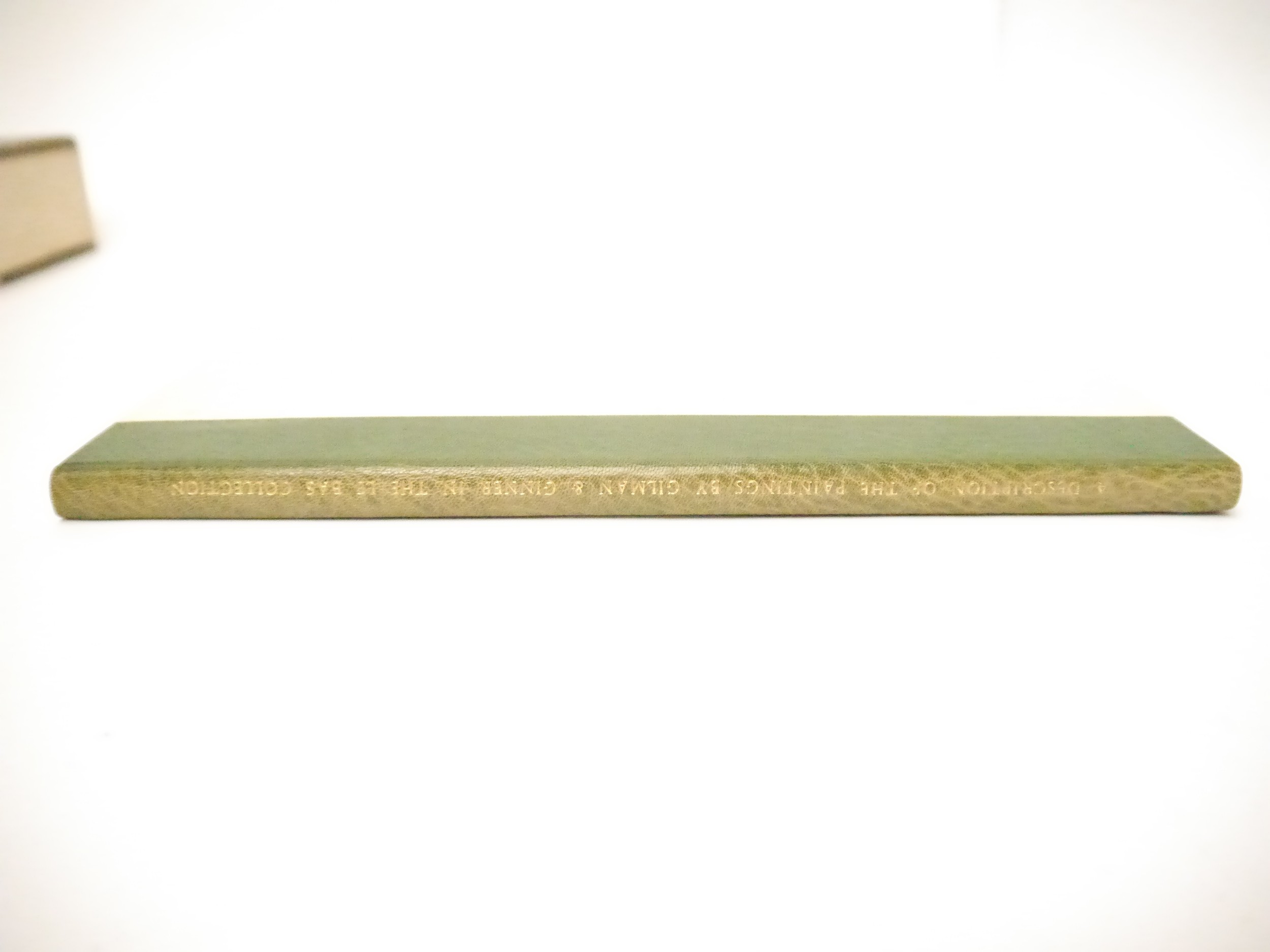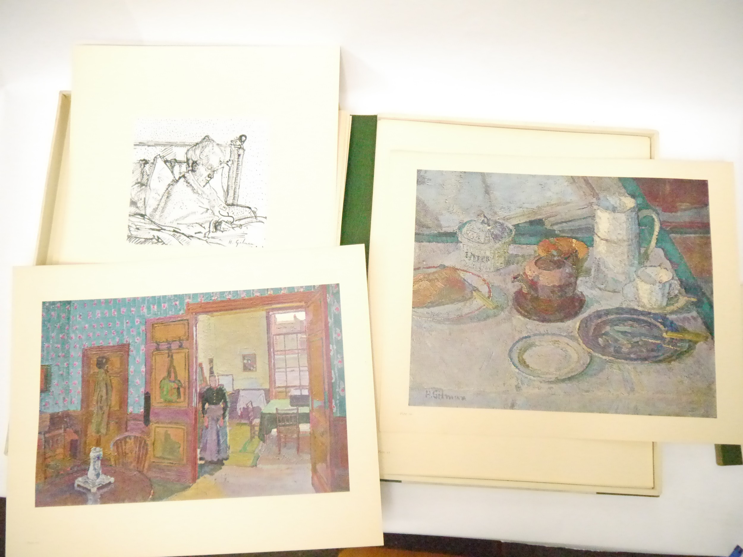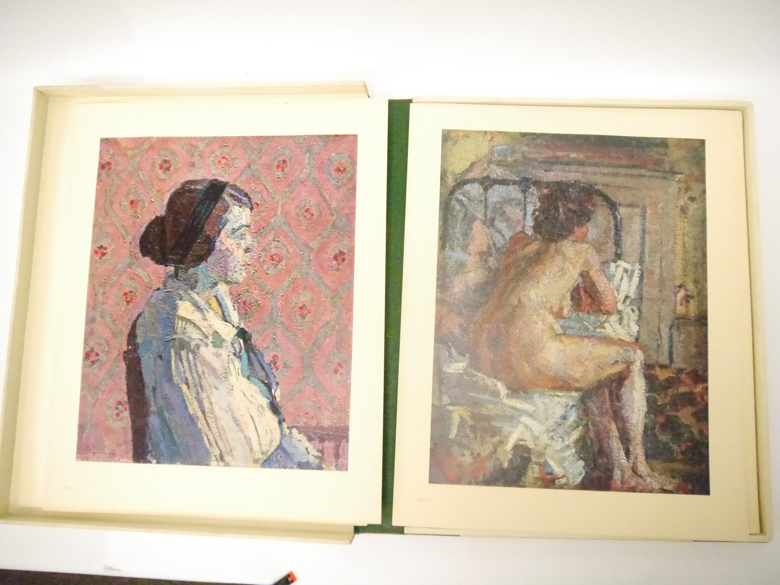 (Camden Town Group.) Harold Gilman (British 1876-1919) and Charles Ginner A.R.A. (British 1878-1952): 'Paintings and Drawings by Harold Gilman and Charles Ginner in the Collection of Edward Le Bas', London, Fairfax Hall, 1965, first edition, number 8 of 105 numbered copies only, 36 mounted colour plates after paintings by Gilman or Ginner, printed on a special making of Cowan paper, leaves approx. 51 x 41cm, with uniform title page leaf, limitation/copyright statement verso (title page with toning, leaves of plates with some very minor toning, else generally plates very clean/VGC), text volume 49,[1]pp, foreword by the publisher, essays on each of the artists, another on the Camden Town Group by Ginner, and descriptions of the plates, hand printed by the publisher on Hodgkinson hand made paper, 25 x 19cm, original quarter green morocco gilt over cream buckram, top edge gilt, all housed together in original green quarter morocco gilt portfolio, 54 x 44cm. Formerly from the collection of Denys Sutton (1917-1991), art critic and historian
