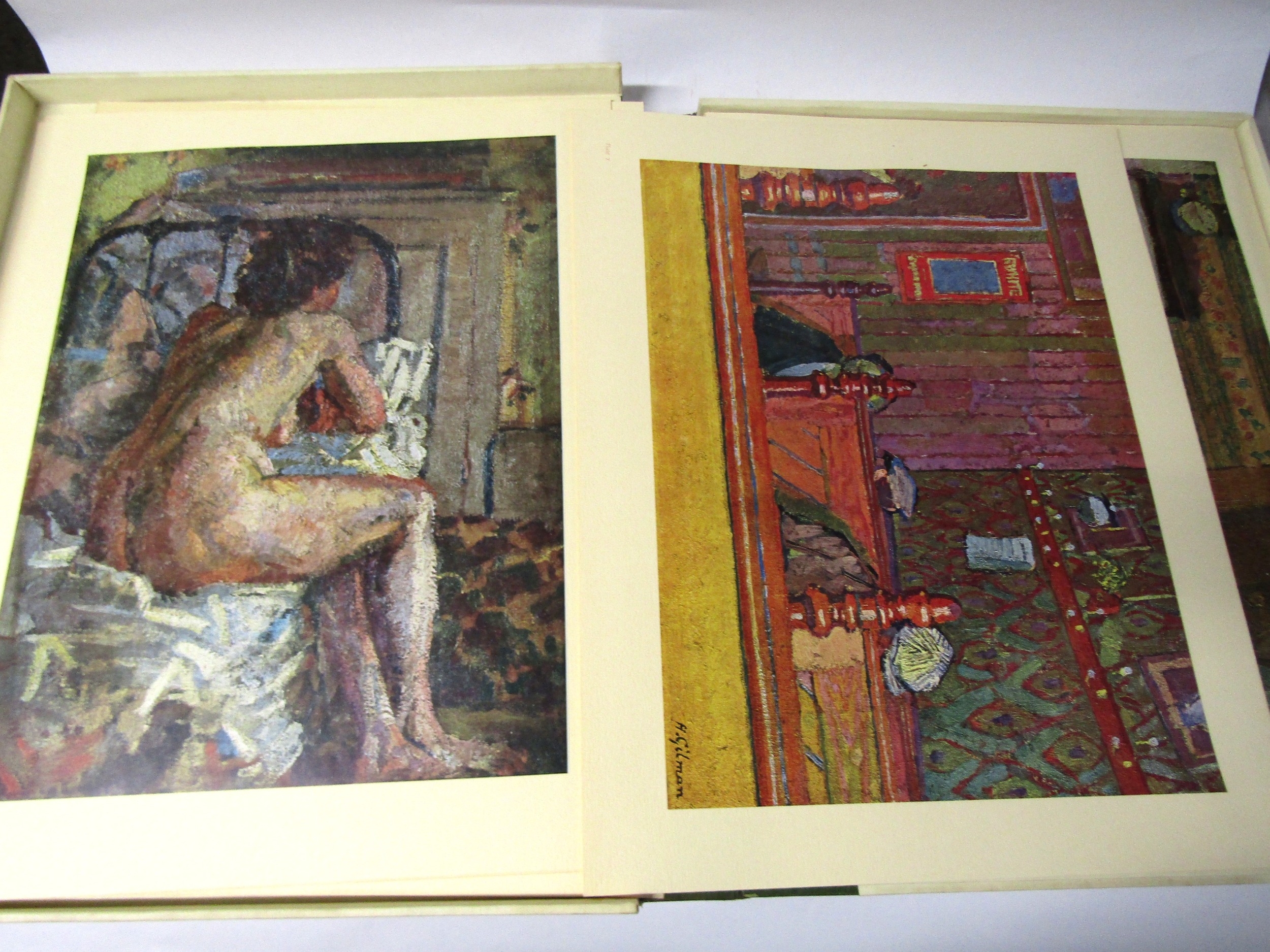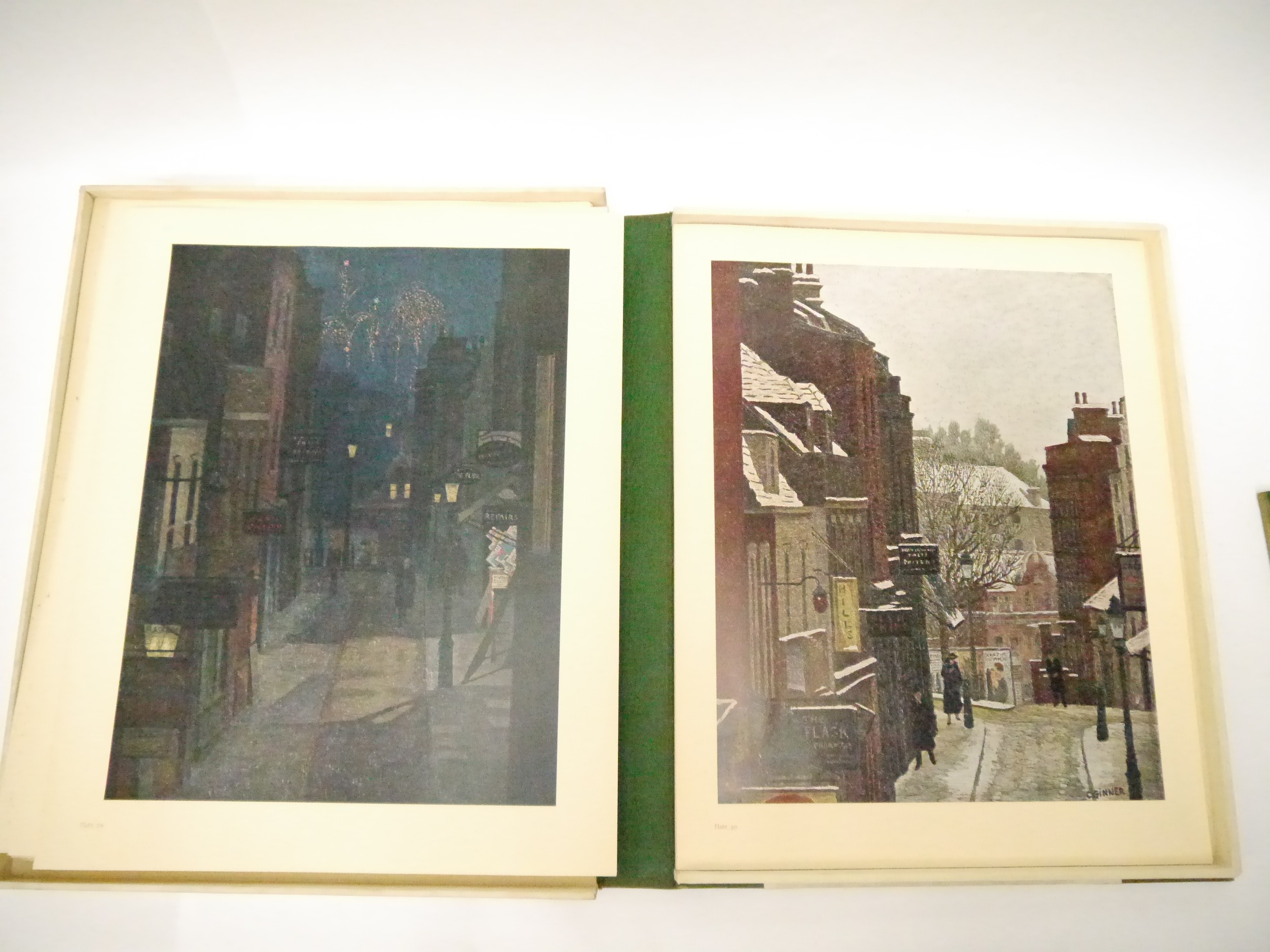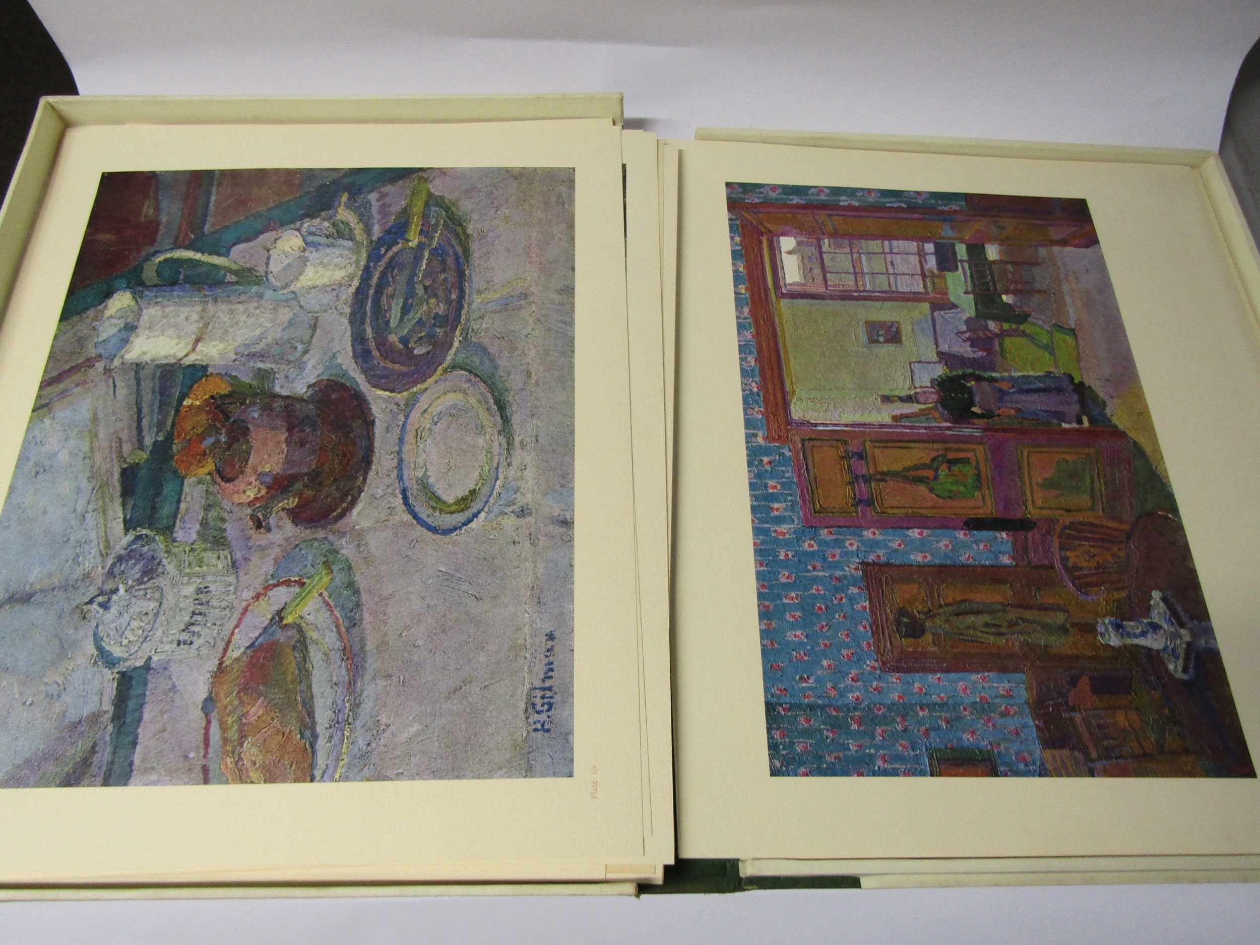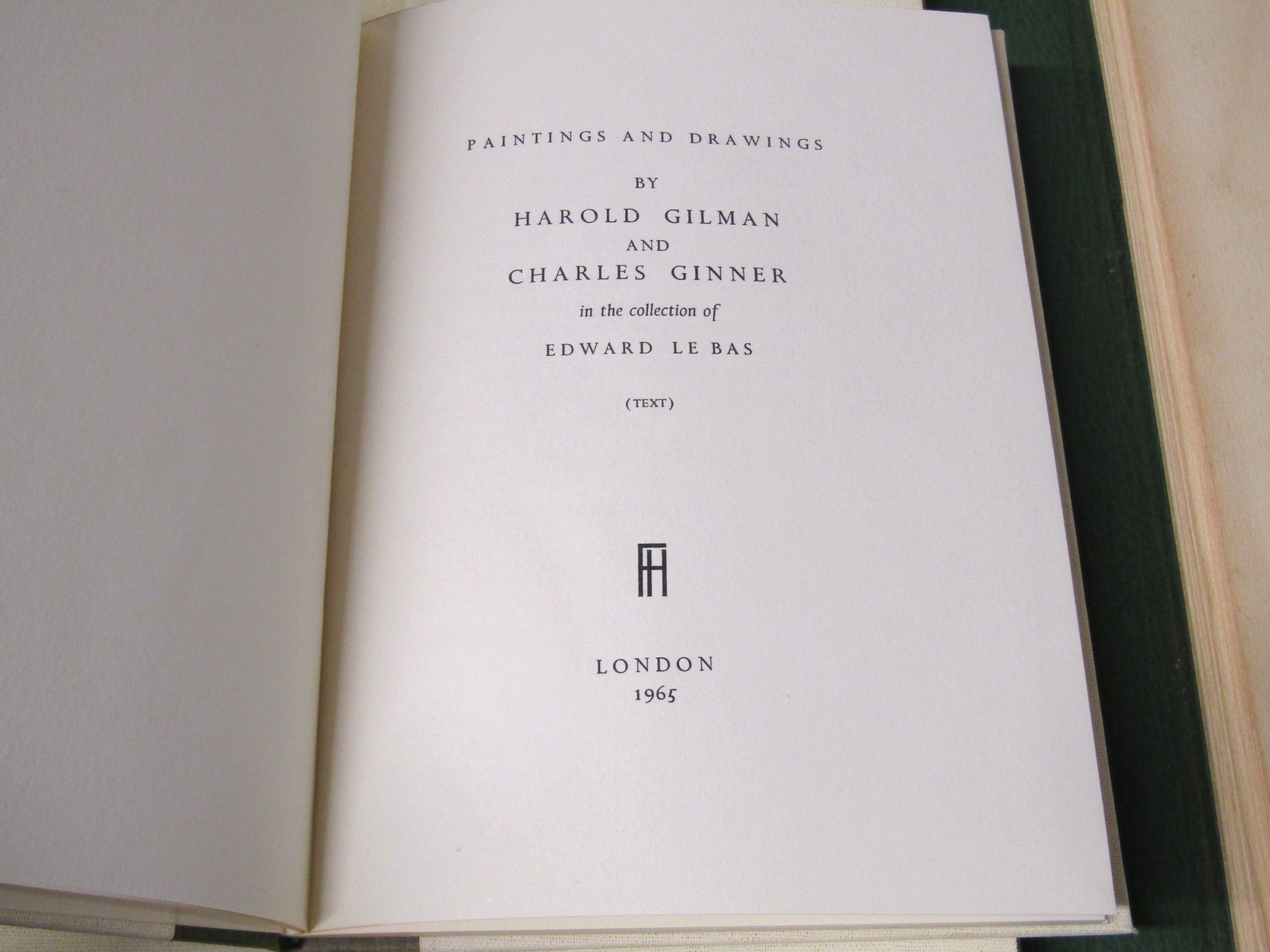 (Camden Town Group.) Harold Gilman (British 1876-1919) and Charles Ginner A.R.A. (British 1878-1952): 'Paintings and Drawings by Harold Gilman and Charles Ginner in the Collection of Edward Le Bas', London, Fairfax Hall, 1965, first edition, number 8 of 105 numbered copies only, 36 mounted colour plates after paintings by Gilman or Ginner, printed on a special making of Cowan paper, leaves approx. 51 x 41cm, with uniform title page leaf, limitation/copyright statement verso (title page with toning, leaves of plates with some very minor toning, else generally plates very clean/VGC), text volume 49,[1]pp, foreword by the publisher, essays on each of the artists, another on the Camden Town Group by Ginner, and descriptions of the plates, hand printed by the publisher on Hodgkinson hand made paper, 25 x 19cm, original quarter green morocco gilt over cream buckram, top edge gilt, all housed together in original green quarter morocco gilt portfolio, 54 x 44cm. Formerly from the collection of Denys Sutton (1917-1991), art critic and historian