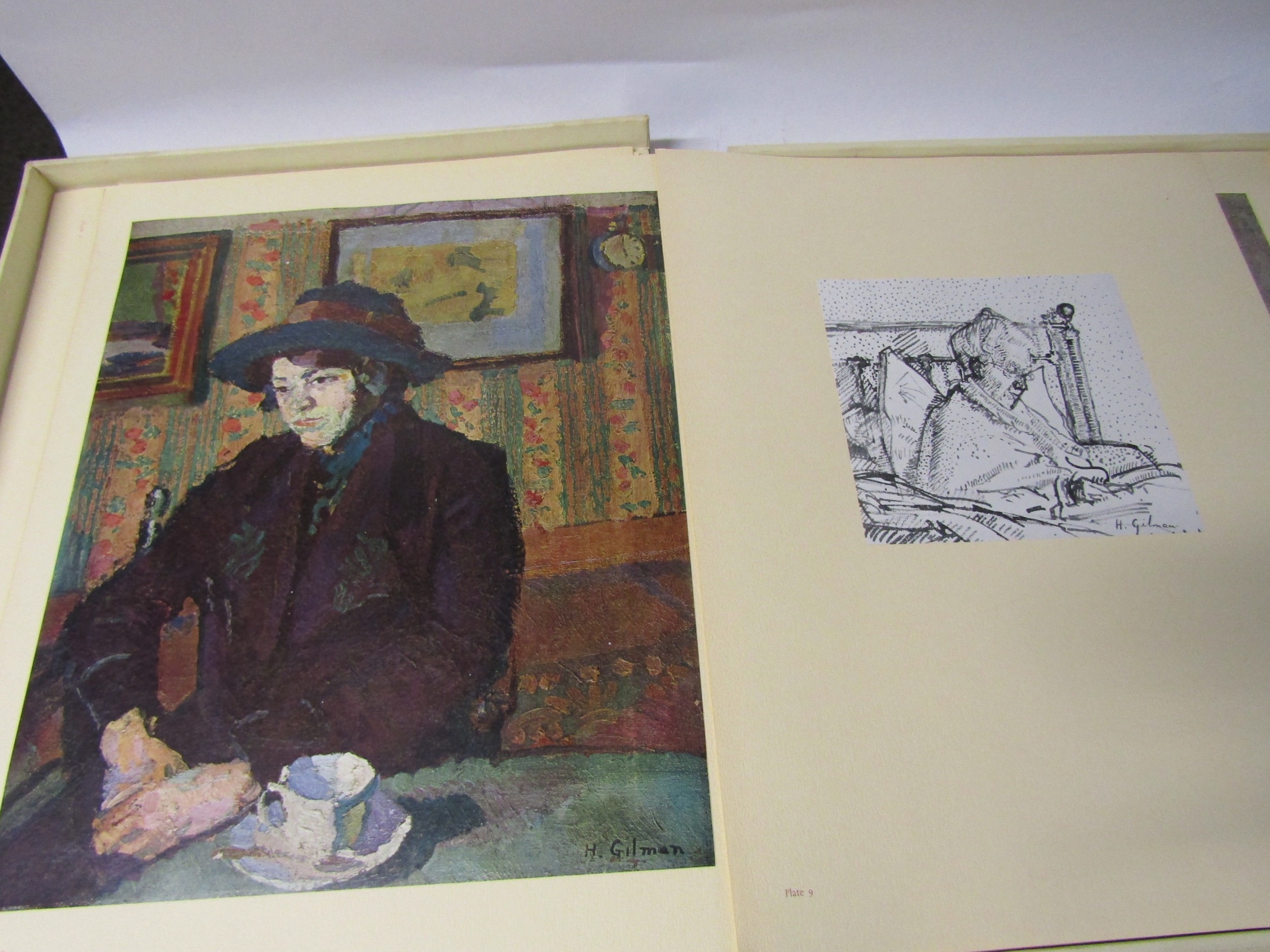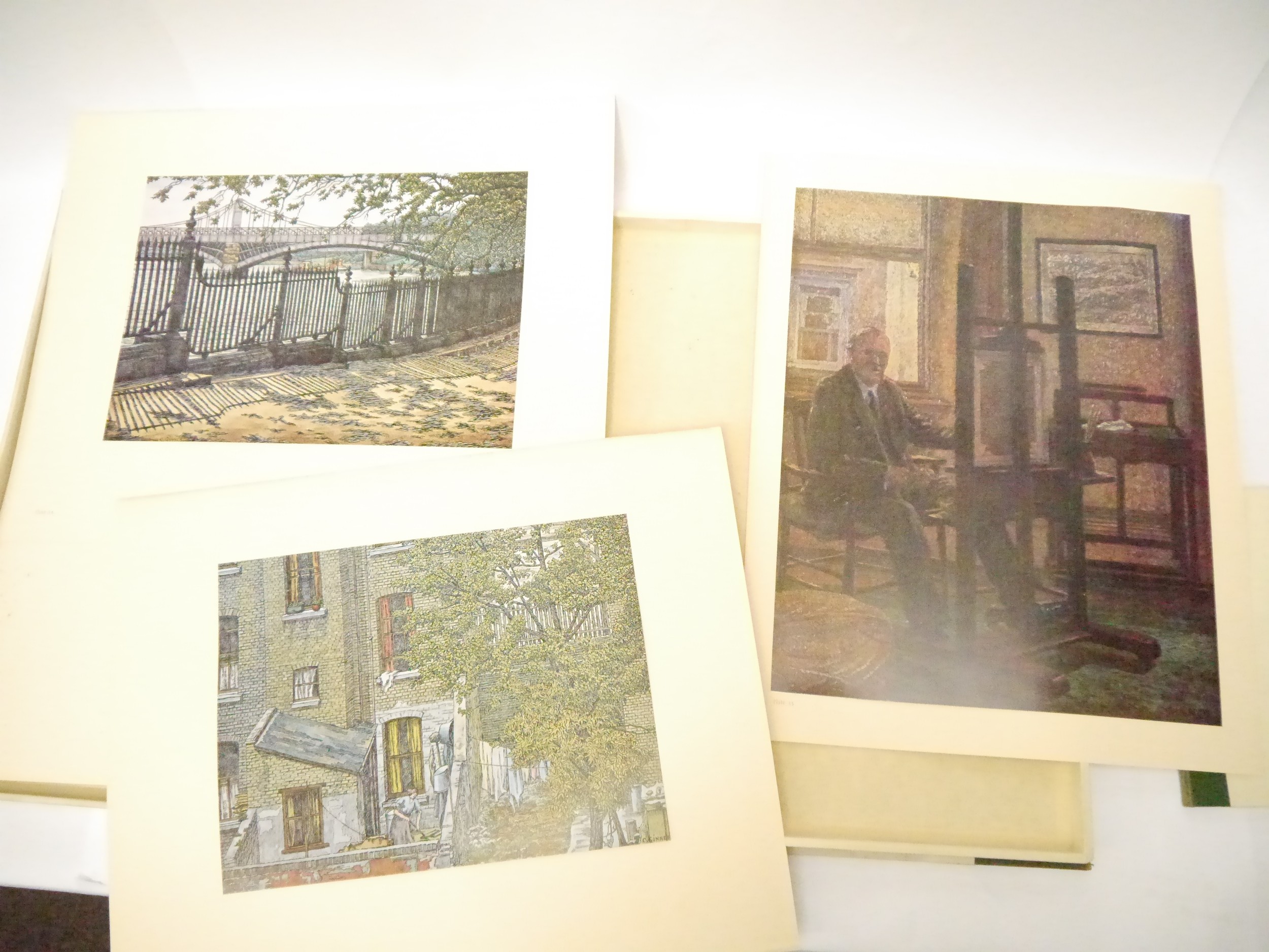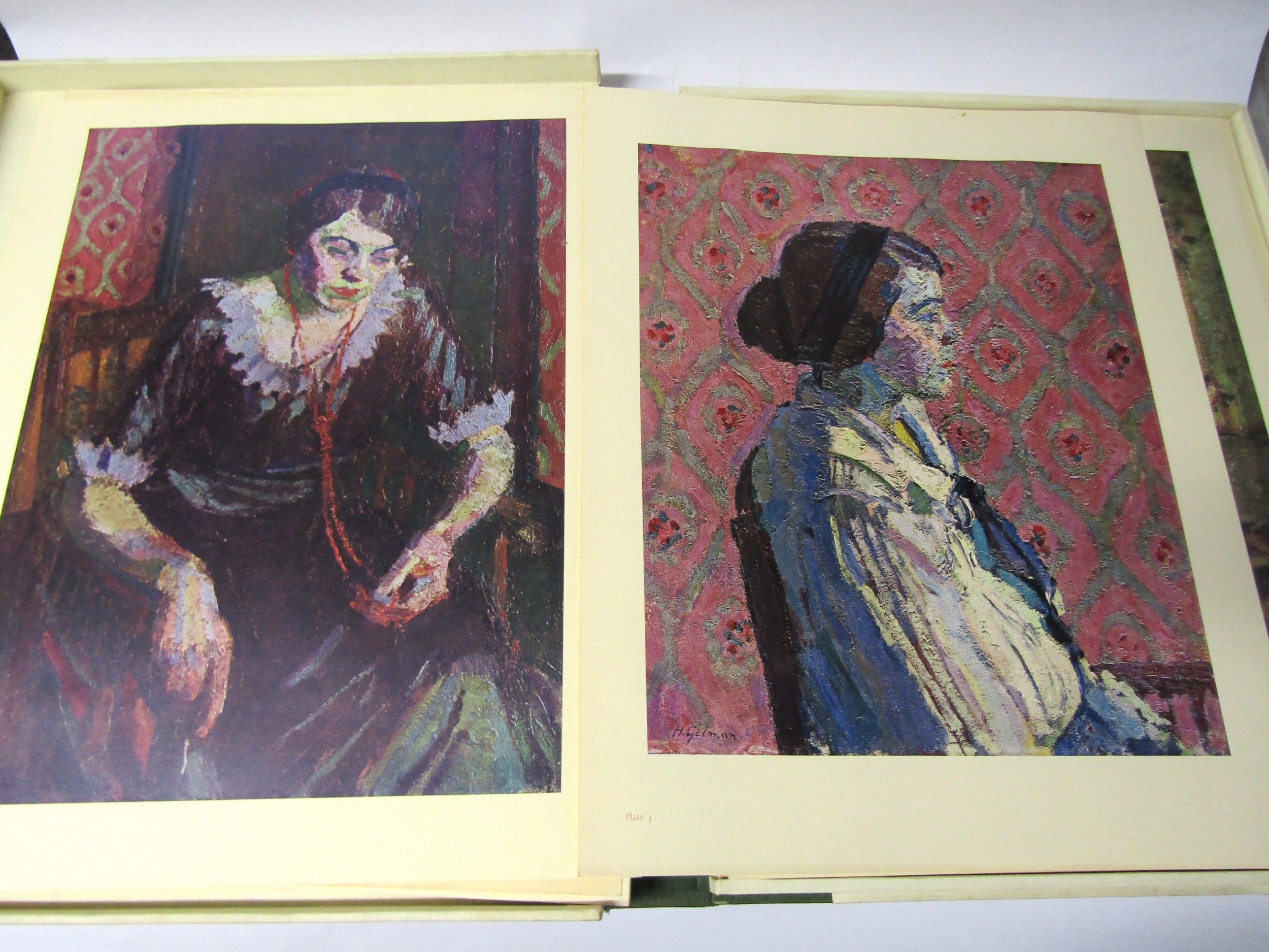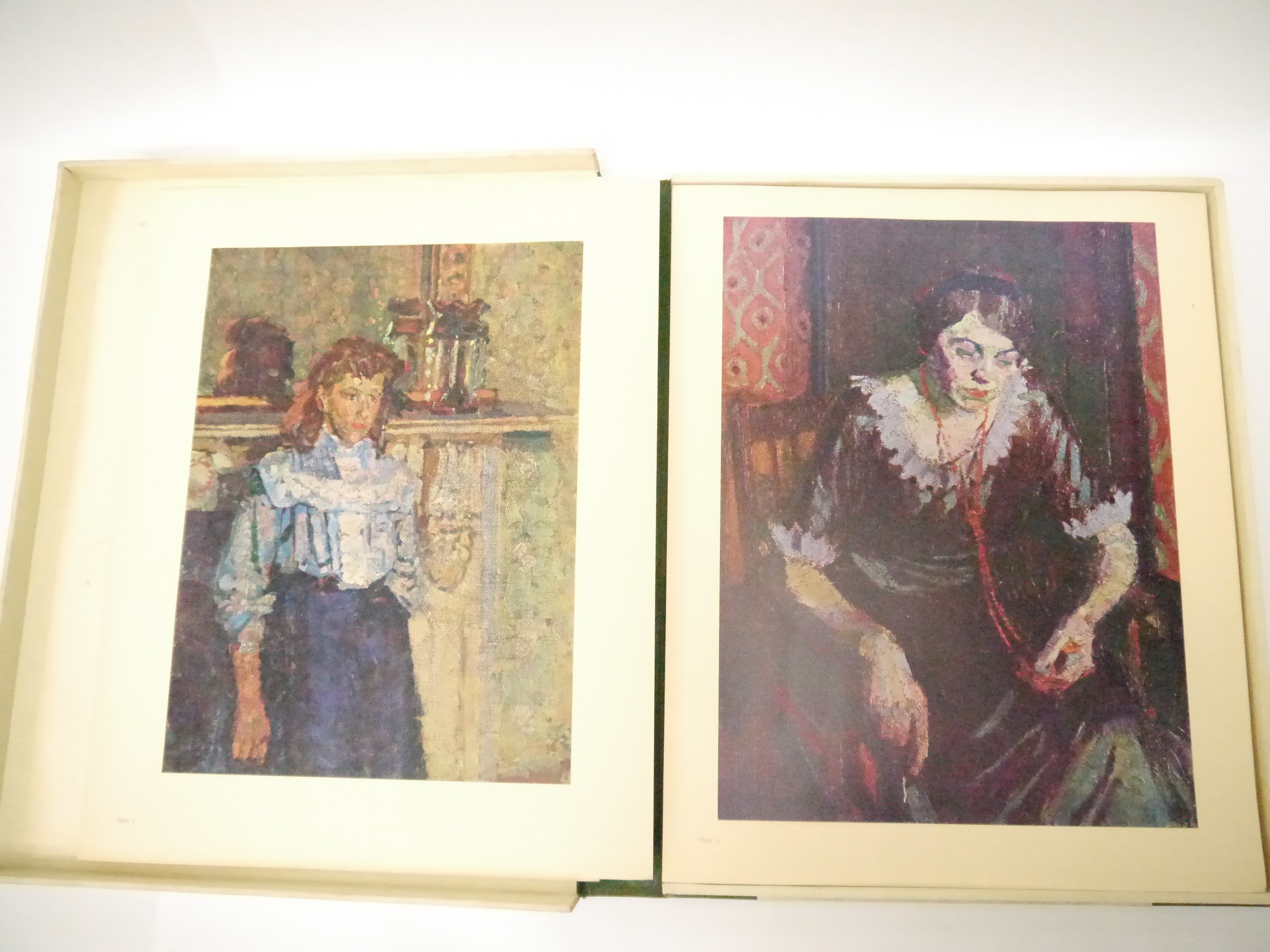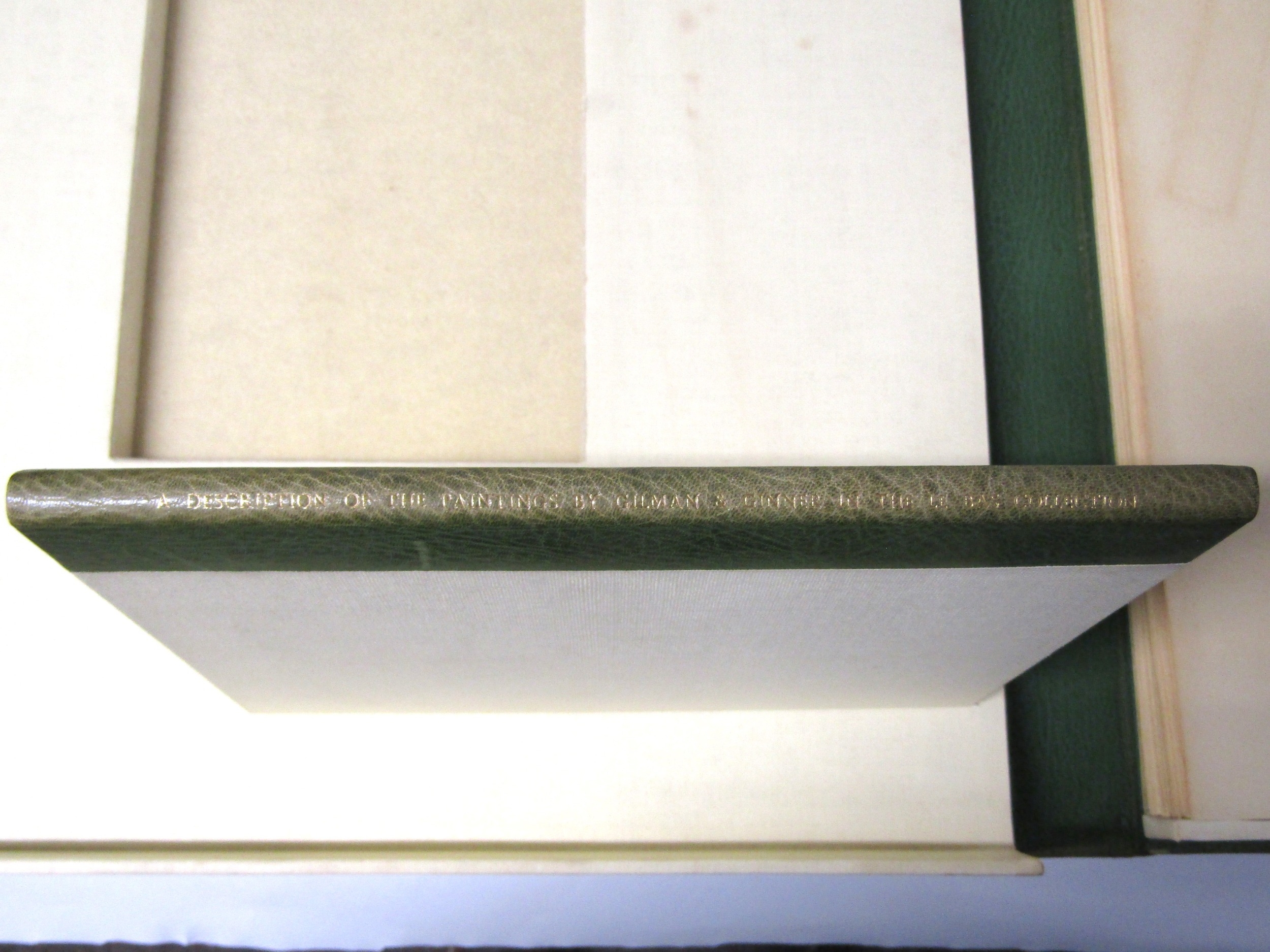 (Camden Town Group.) Harold Gilman (British 1876-1919) and Charles Ginner A.R.A. (British 1878-1952): 'Paintings and Drawings by Harold Gilman and Charles Ginner in the Collection of Edward Le Bas', London, Fairfax Hall, 1965, first edition, number 8 of 105 numbered copies only, 36 mounted colour plates after paintings by Gilman or Ginner, printed on a special making of Cowan paper, leaves approx. 51 x 41cm, with uniform title page leaf, limitation/copyright statement verso (title page with toning, leaves of plates with some very minor toning, else generally plates very clean/VGC), text volume 49,[1]pp, foreword by the publisher, essays on each of the artists, another on the Camden Town Group by Ginner, and descriptions of the plates, hand printed by the publisher on Hodgkinson hand made paper, 25 x 19cm, original quarter green morocco gilt over cream buckram, top edge gilt, all housed together in original green quarter morocco gilt portfolio, 54 x 44cm. Formerly from the collection of Denys Sutton (1917-1991), art critic and historian