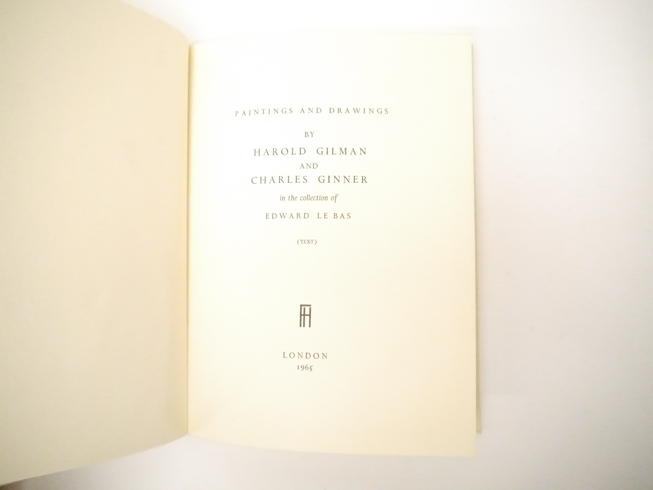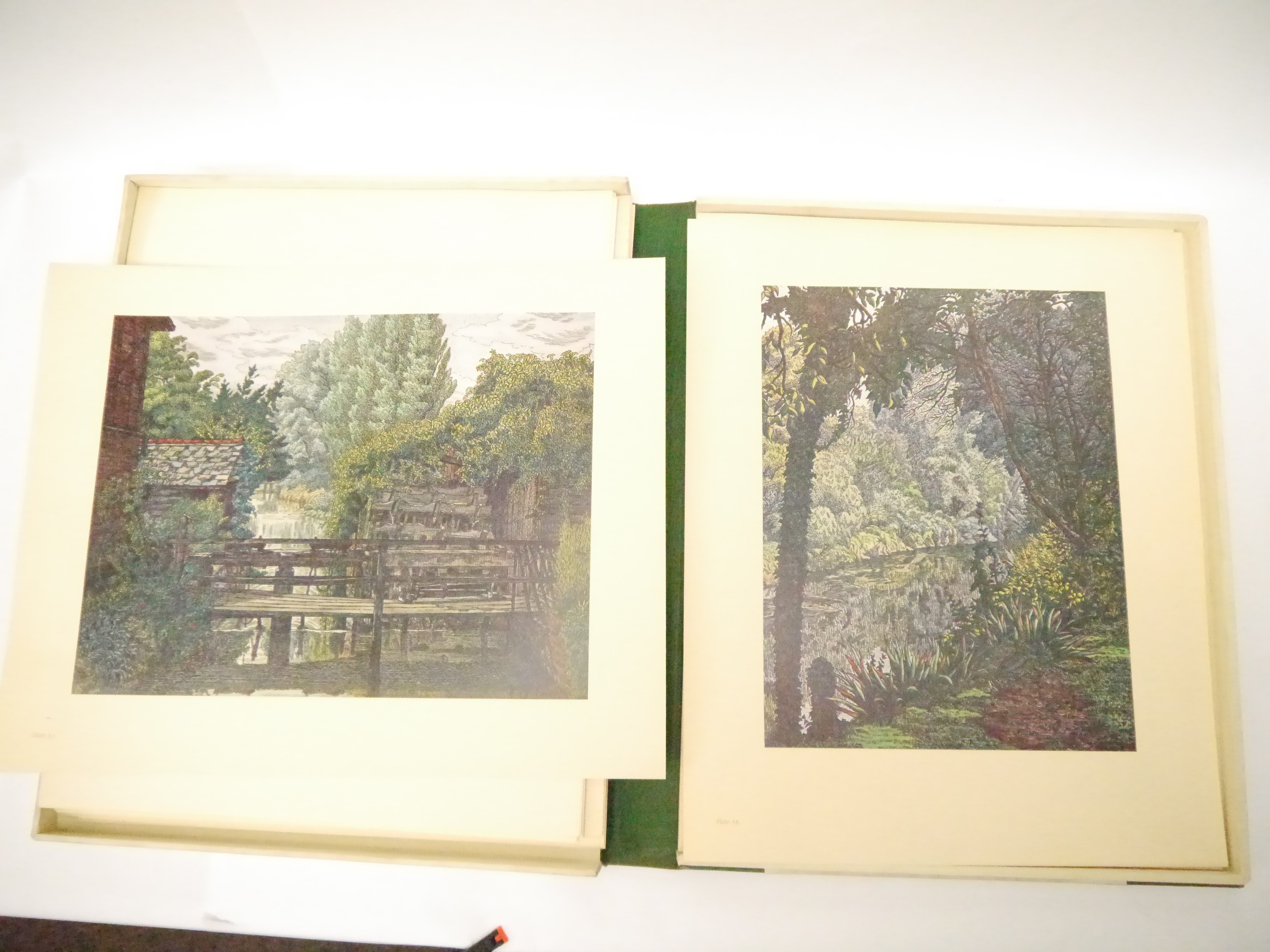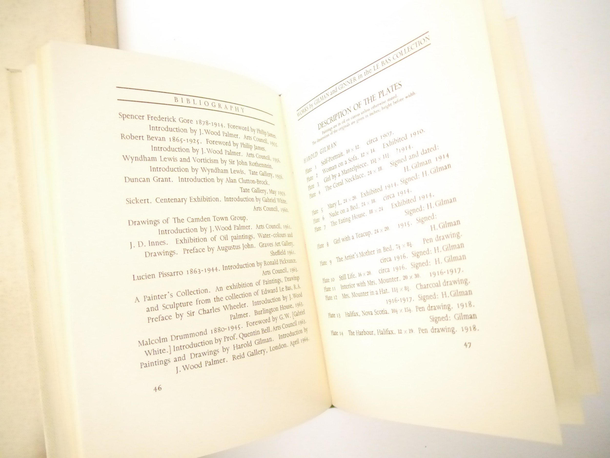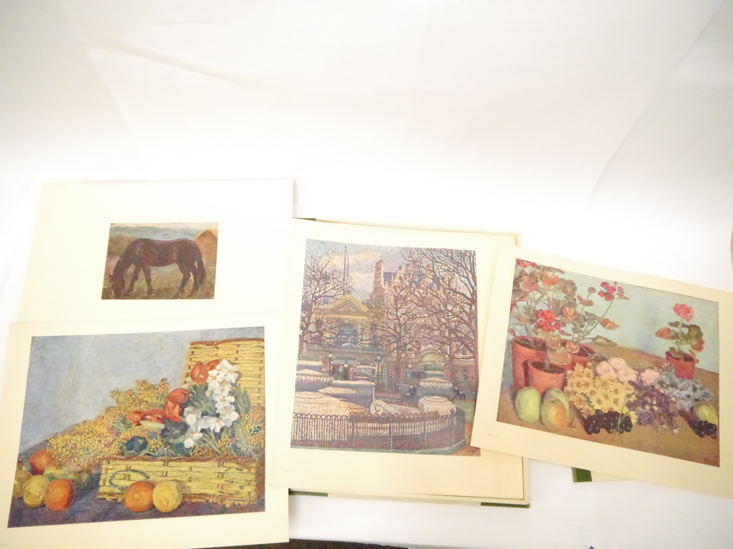 (Camden Town Group.) Harold Gilman (British 1876-1919) and Charles Ginner A.R.A. (British 1878-1952): 'Paintings and Drawings by Harold Gilman and Charles Ginner in the Collection of Edward Le Bas', London, Fairfax Hall, 1965, first edition, number 8 of 105 numbered copies only, 36 mounted colour plates after paintings by Gilman or Ginner, printed on a special making of Cowan paper, leaves approx. 51 x 41cm, with uniform title page leaf, limitation/copyright statement verso (title page with toning, leaves of plates with some very minor toning, else generally plates very clean/VGC), text volume 49,[1]pp, foreword by the publisher, essays on each of the artists, another on the Camden Town Group by Ginner, and descriptions of the plates, hand printed by the publisher on Hodgkinson hand made paper, 25 x 19cm, original quarter green morocco gilt over cream buckram, top edge gilt, all housed together in original green quarter morocco gilt portfolio, 54 x 44cm. Formerly from the collection of Denys Sutton (1917-1991), art critic and historian