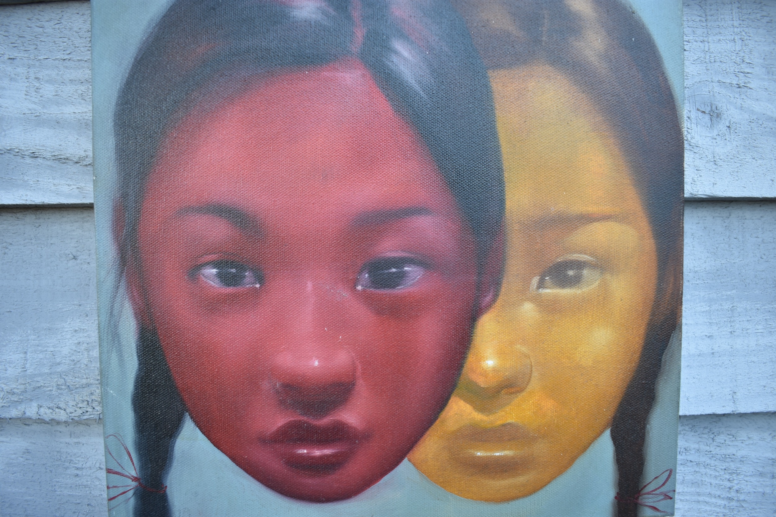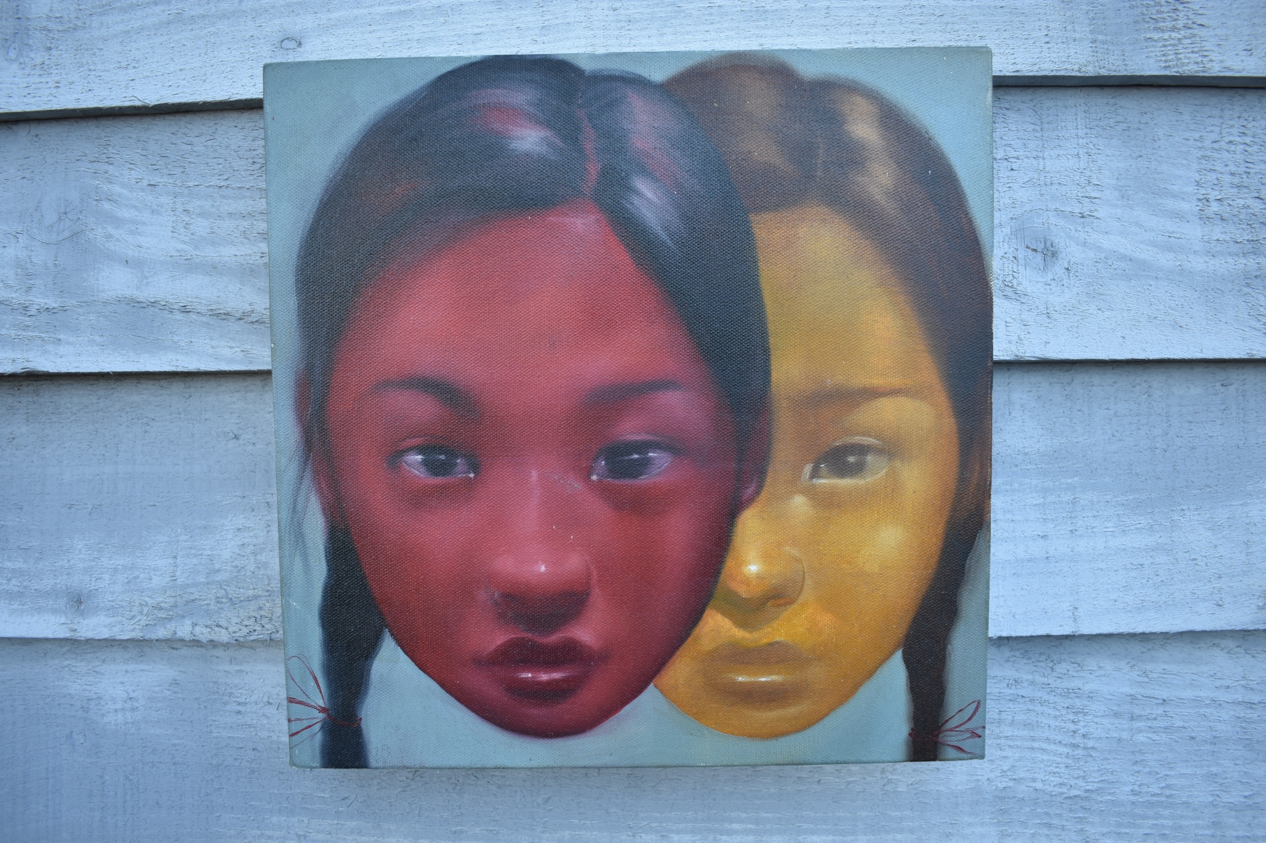 ATTAGIL POKPONG, two offset faces, acrylic on canvas, dated 2008, 30cm x 30cm