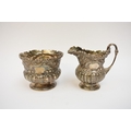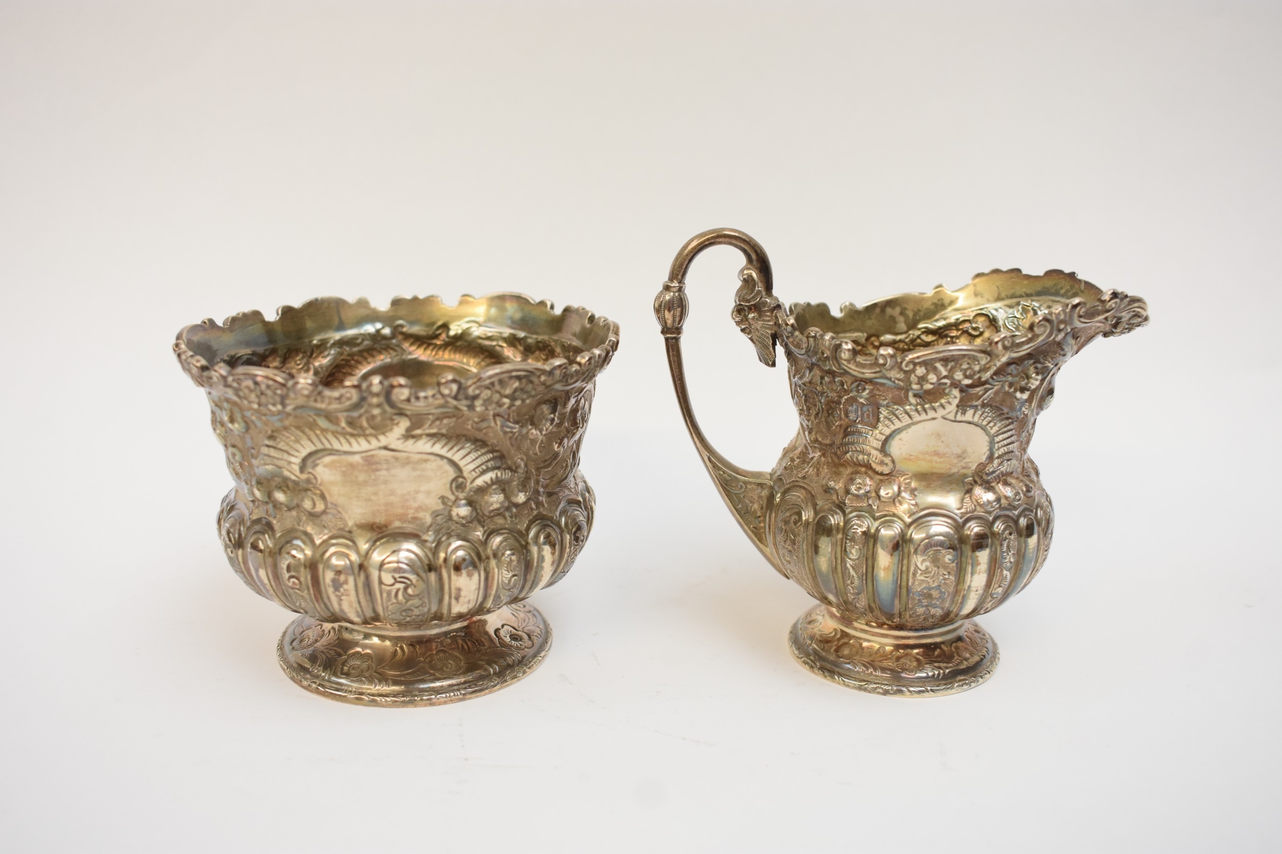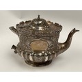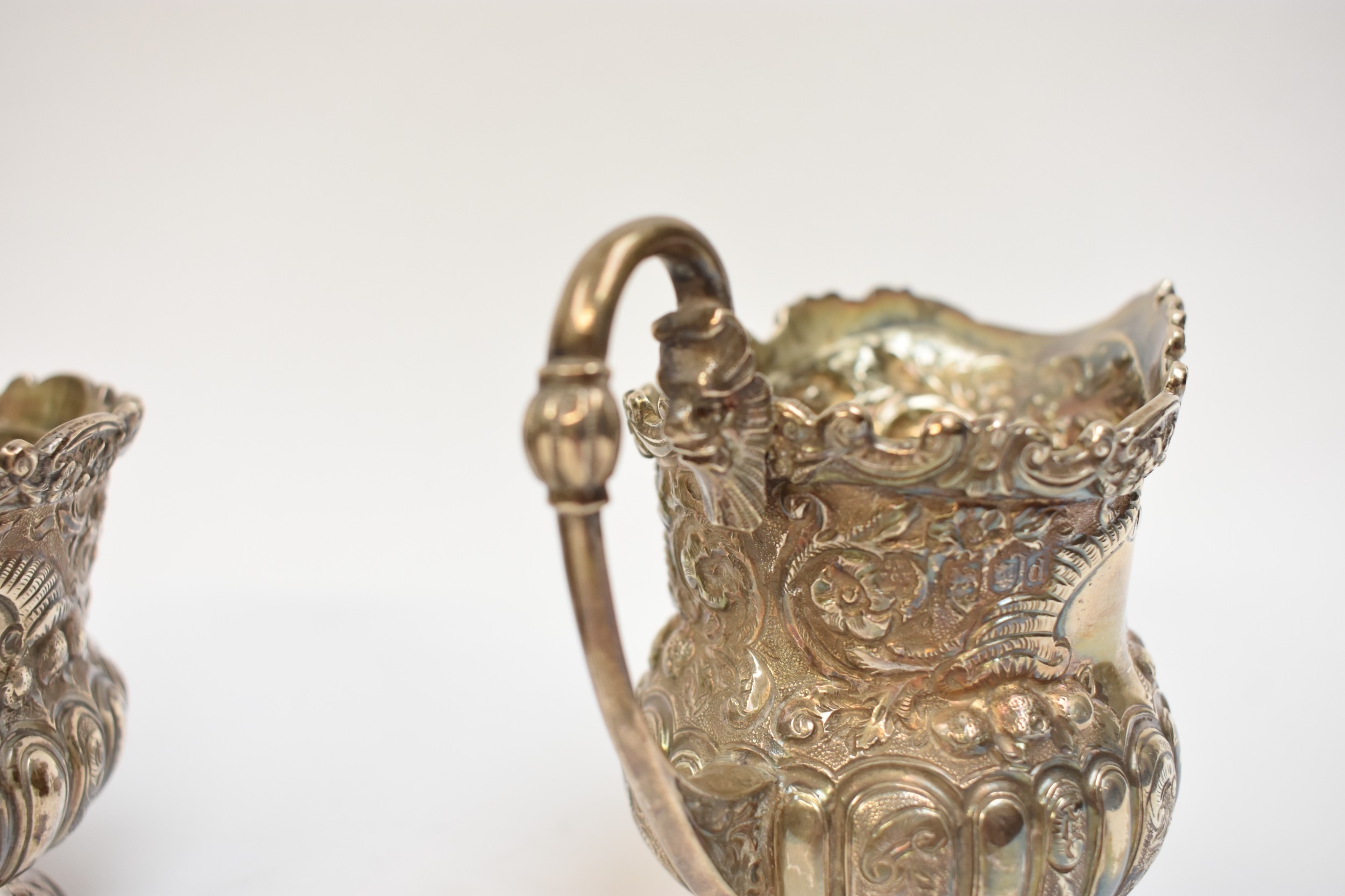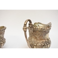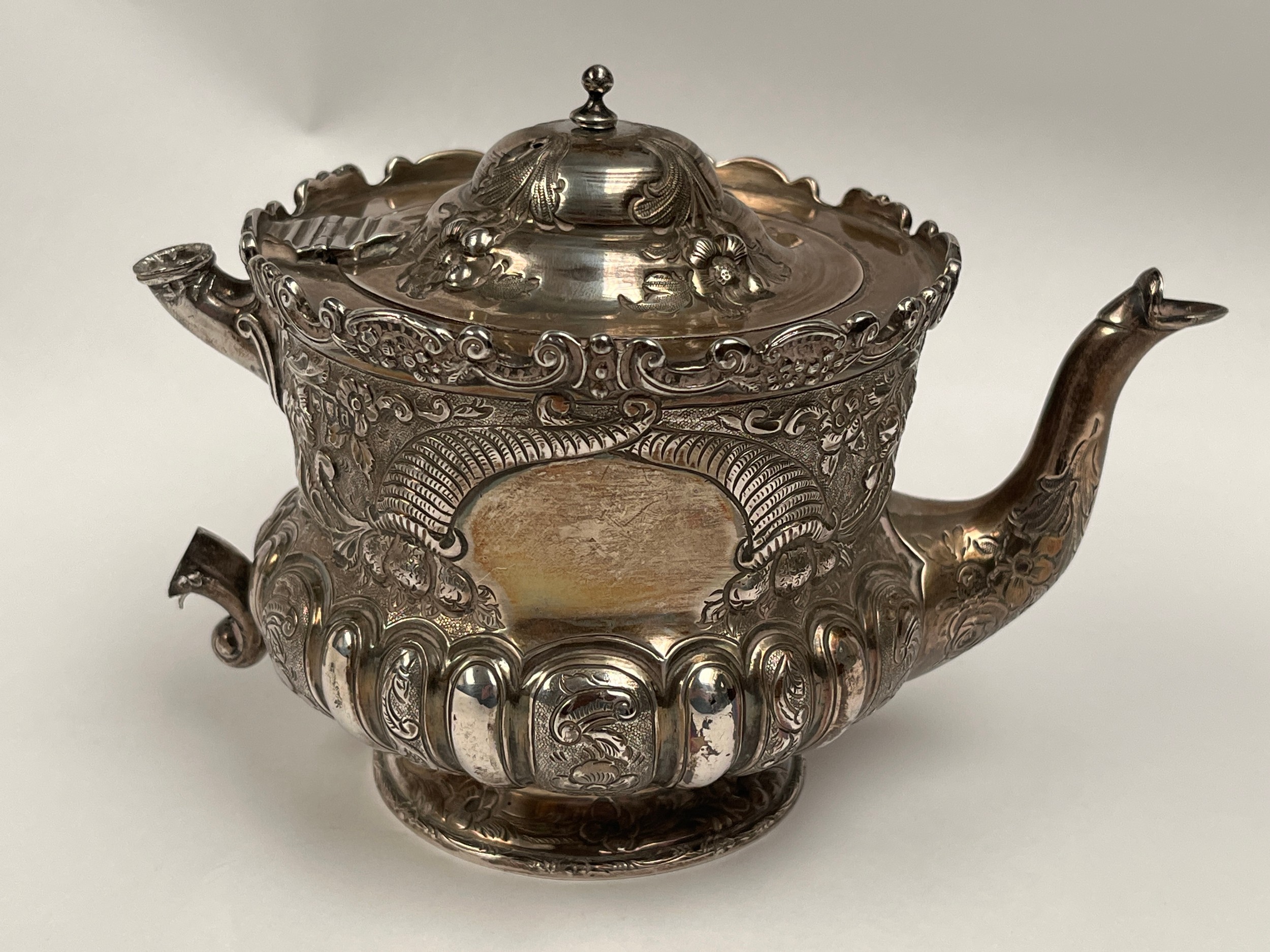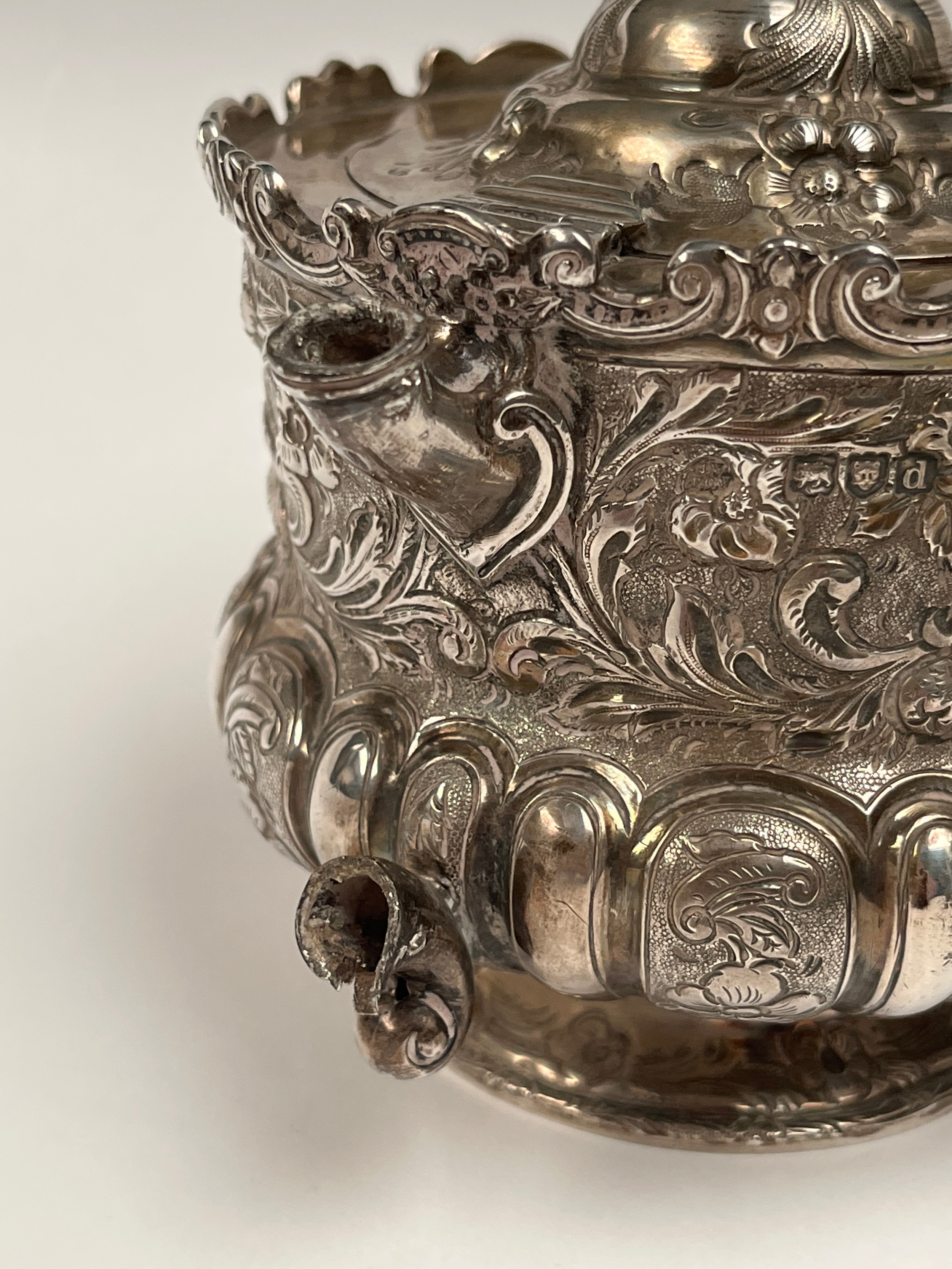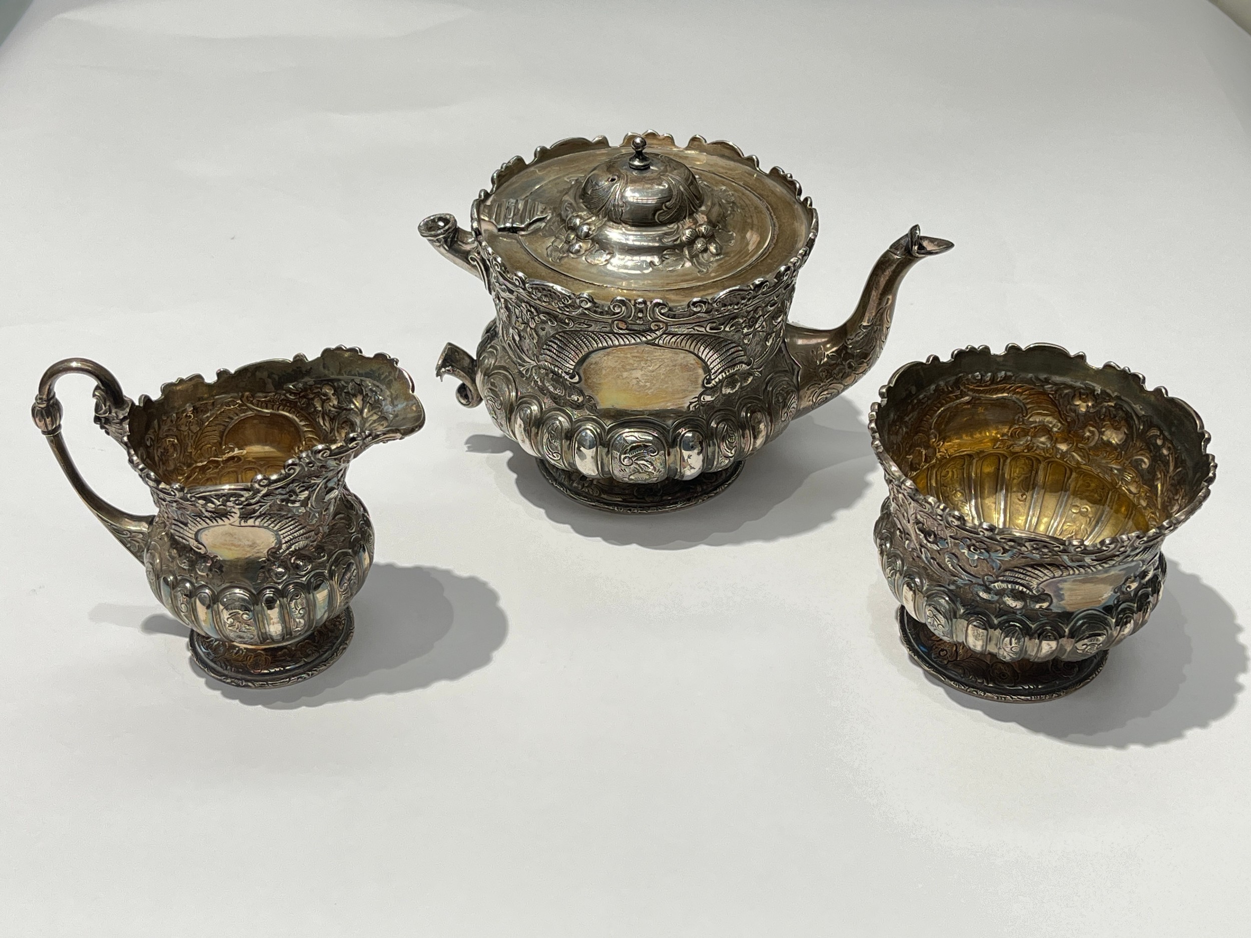 A Victorian Wakely & Wheeler silver bachelor's three piece tea set with embossed floral, leaf and scroll decoration, vacant cartouches . London 1899. teapot is 13cm tall. 690g (ivory handle and knop removed, some damage to handle mounts - see images)