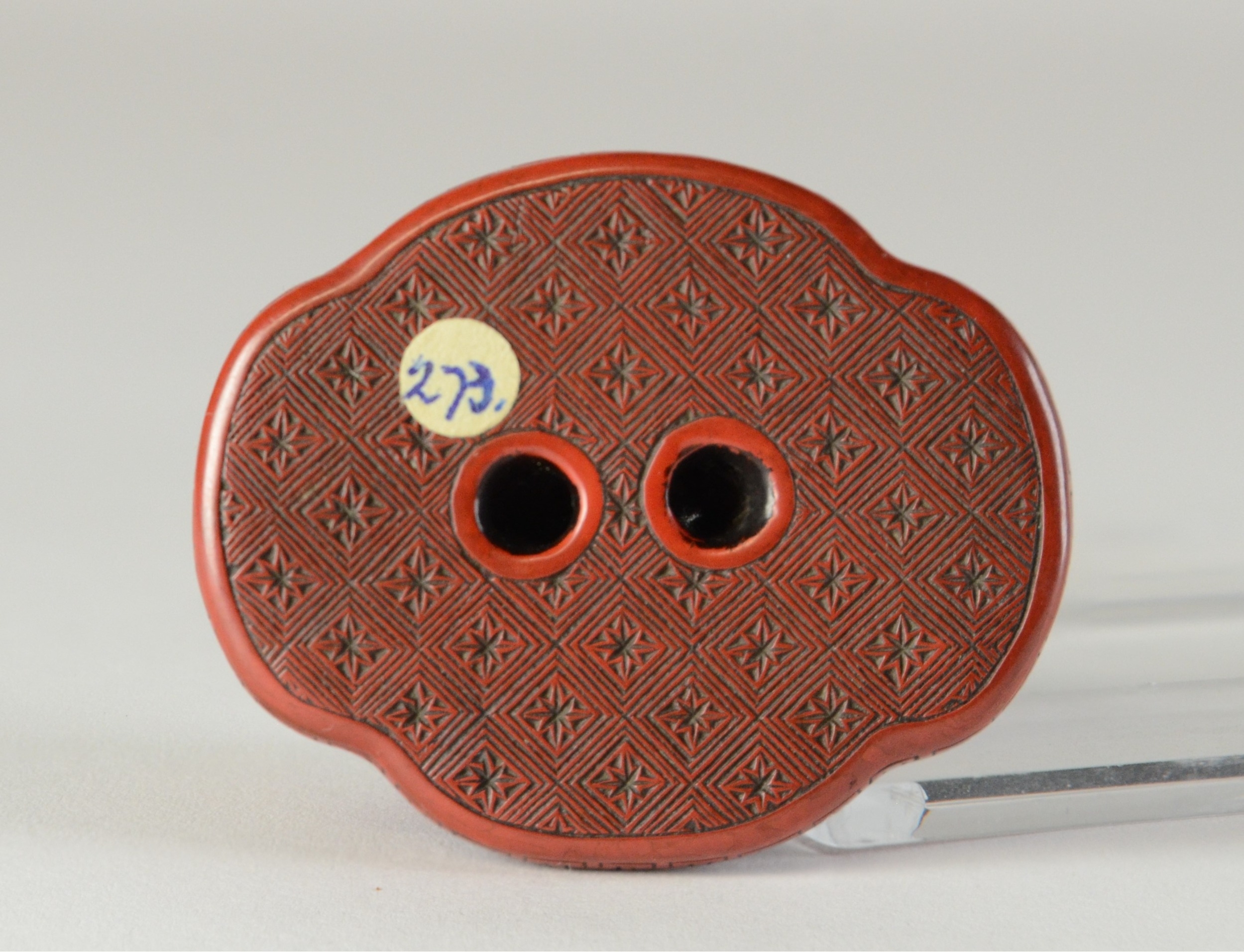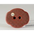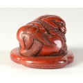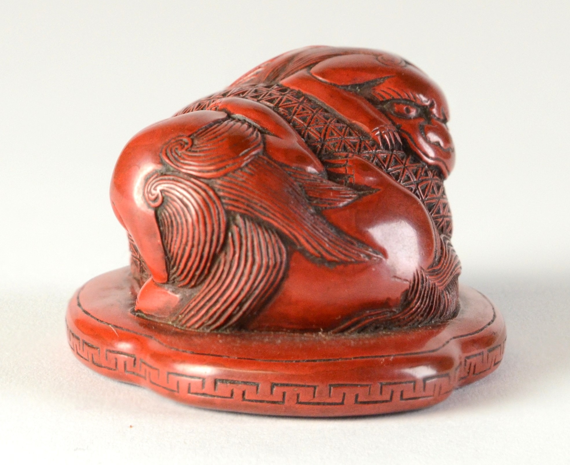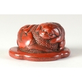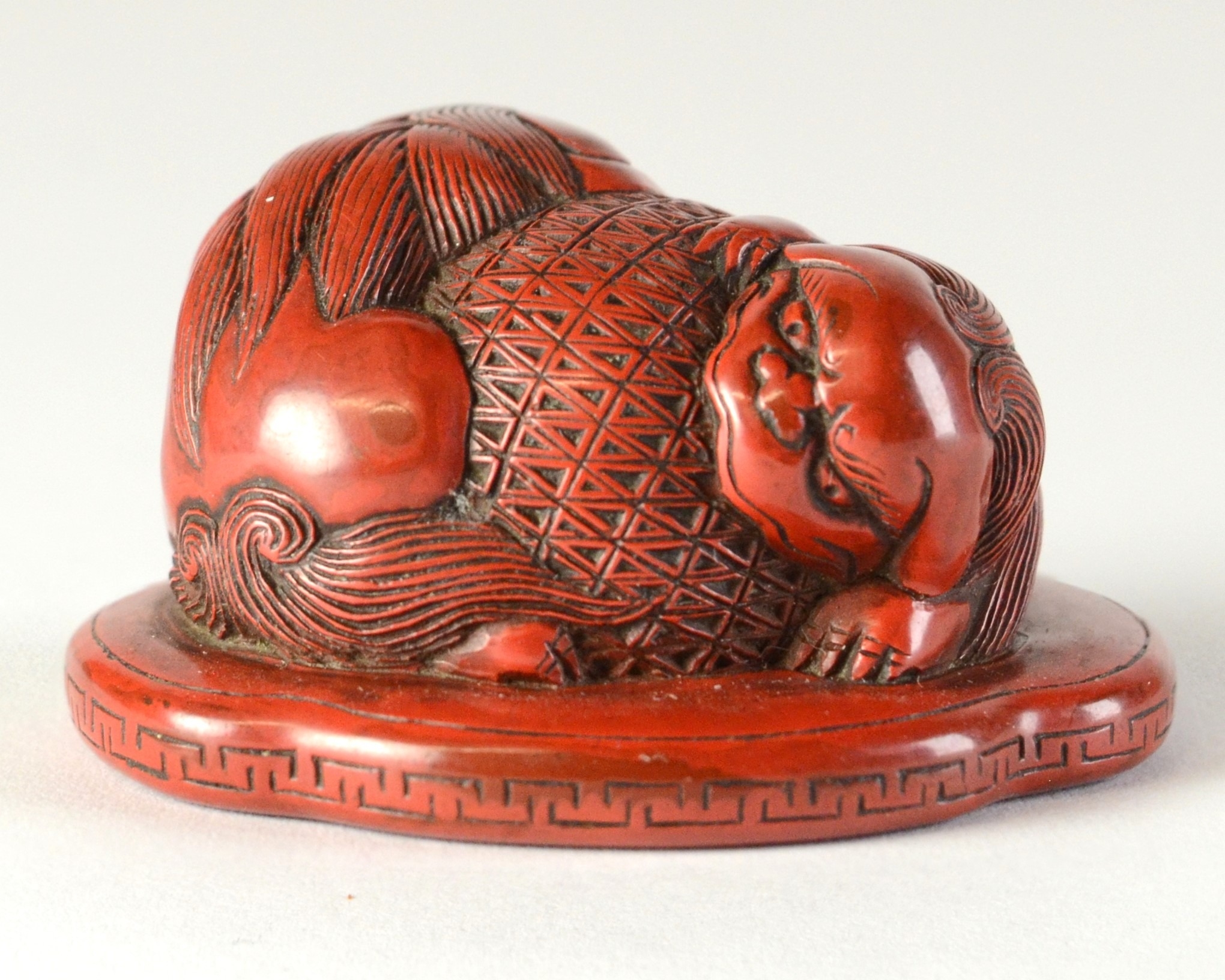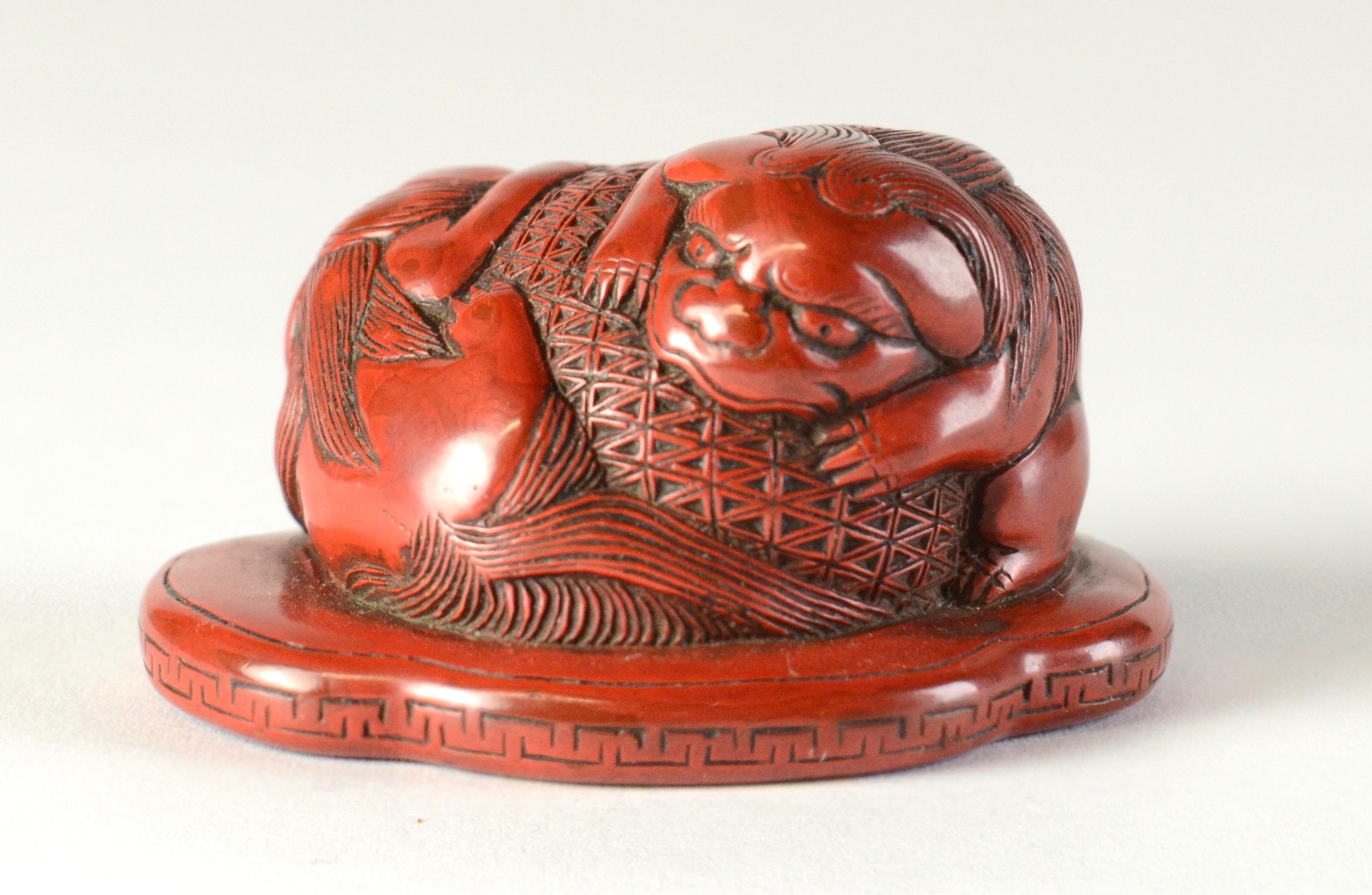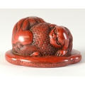 A red lacquered netsuke in the form of two shishi wrapped around a ball, flat base3.8cm wide x 3.4cm deep ProvenanceDorothy Ann Stevens Collection no. 273Glendining & Co 14/4/54 part lot 43