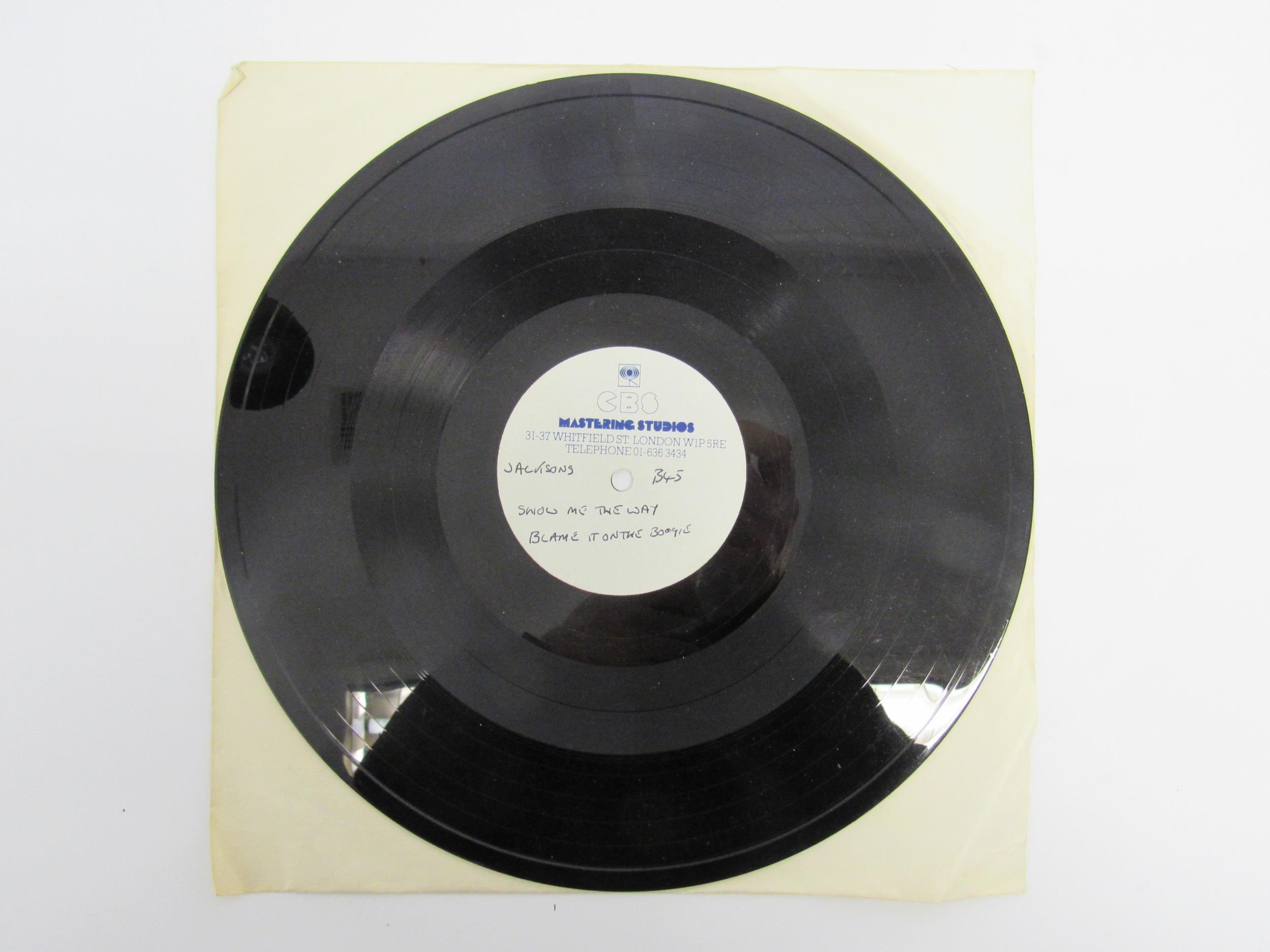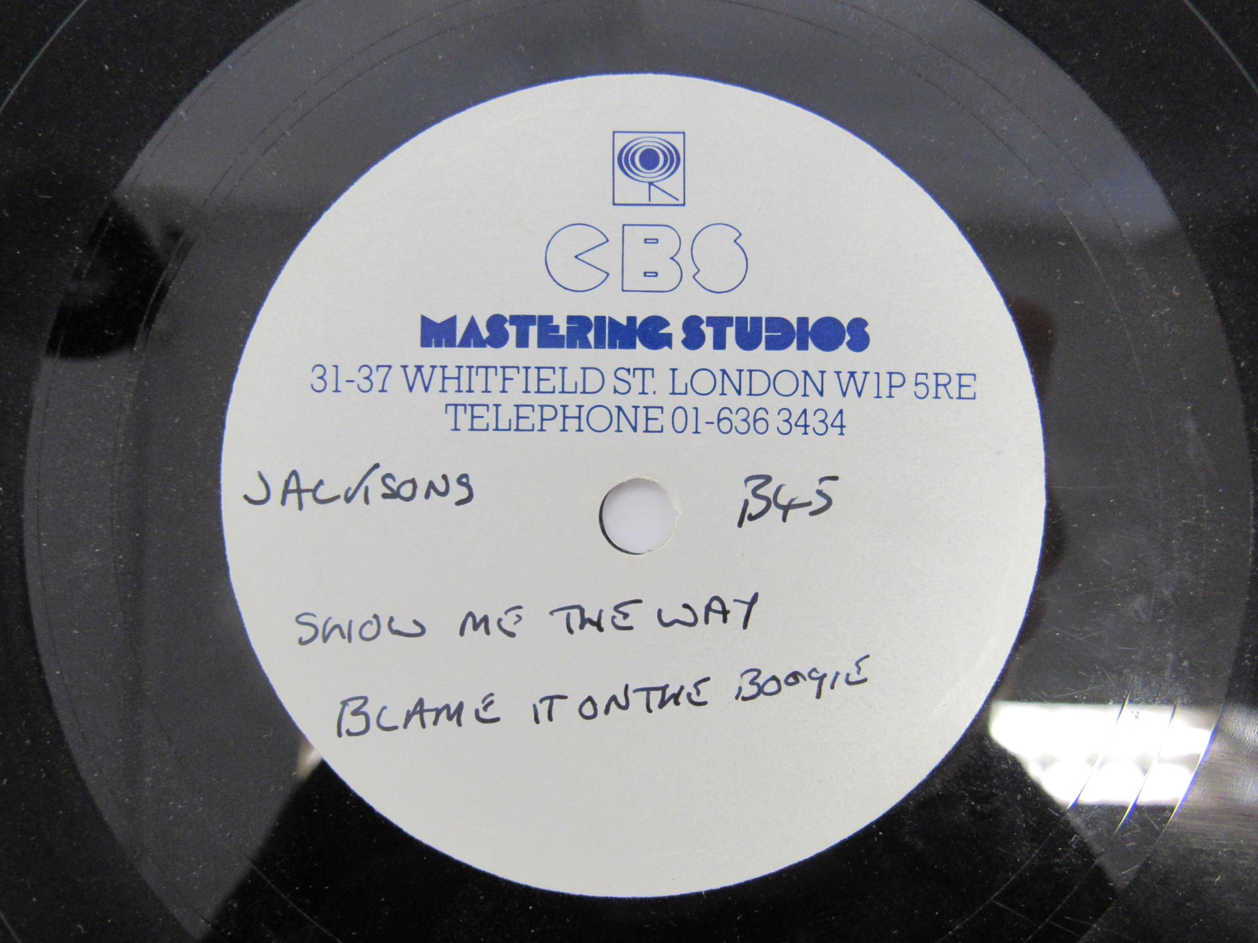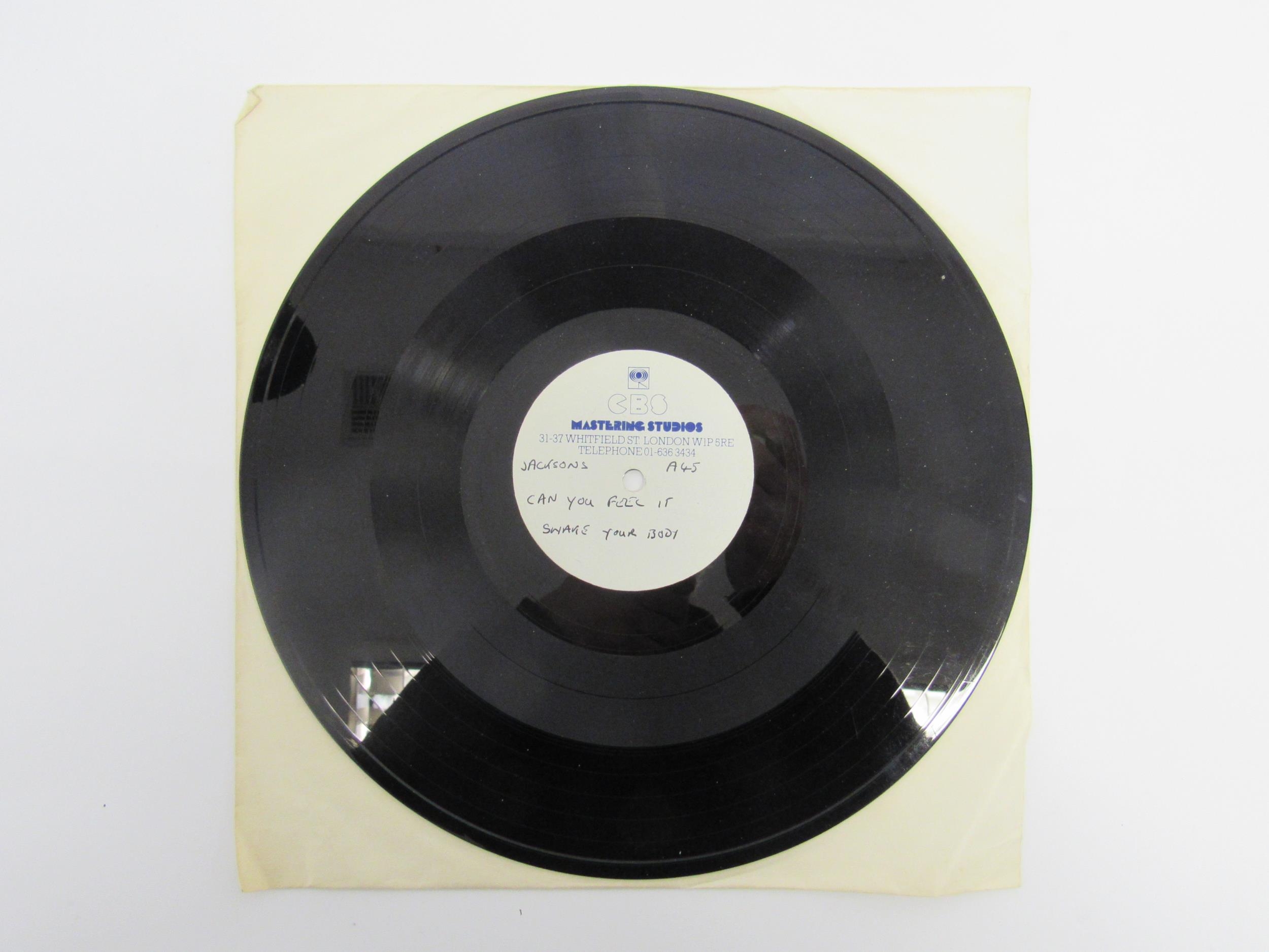 THE JACKSONS: A rare double sided 10" acetate featuring the tracks 'Can You Feel It', 'Shake Your Body (Down To The Ground)', 'Show Me The Way' and 'Blame It On The Boogie'. White CBS Mastering Studios labels with hand written information