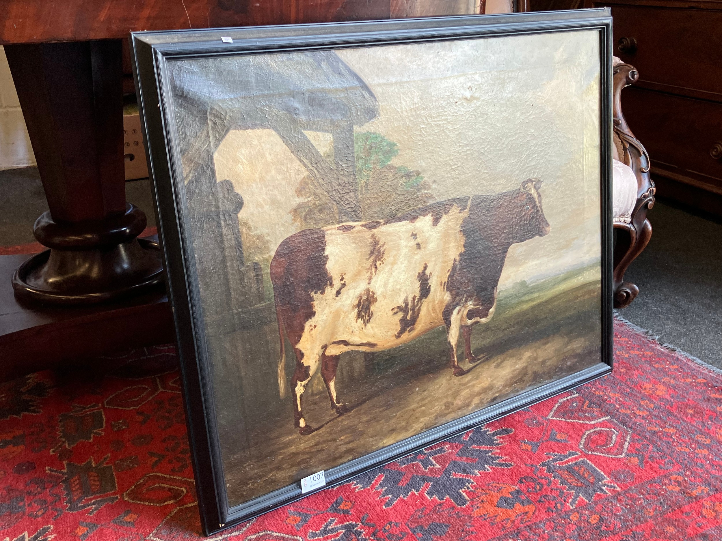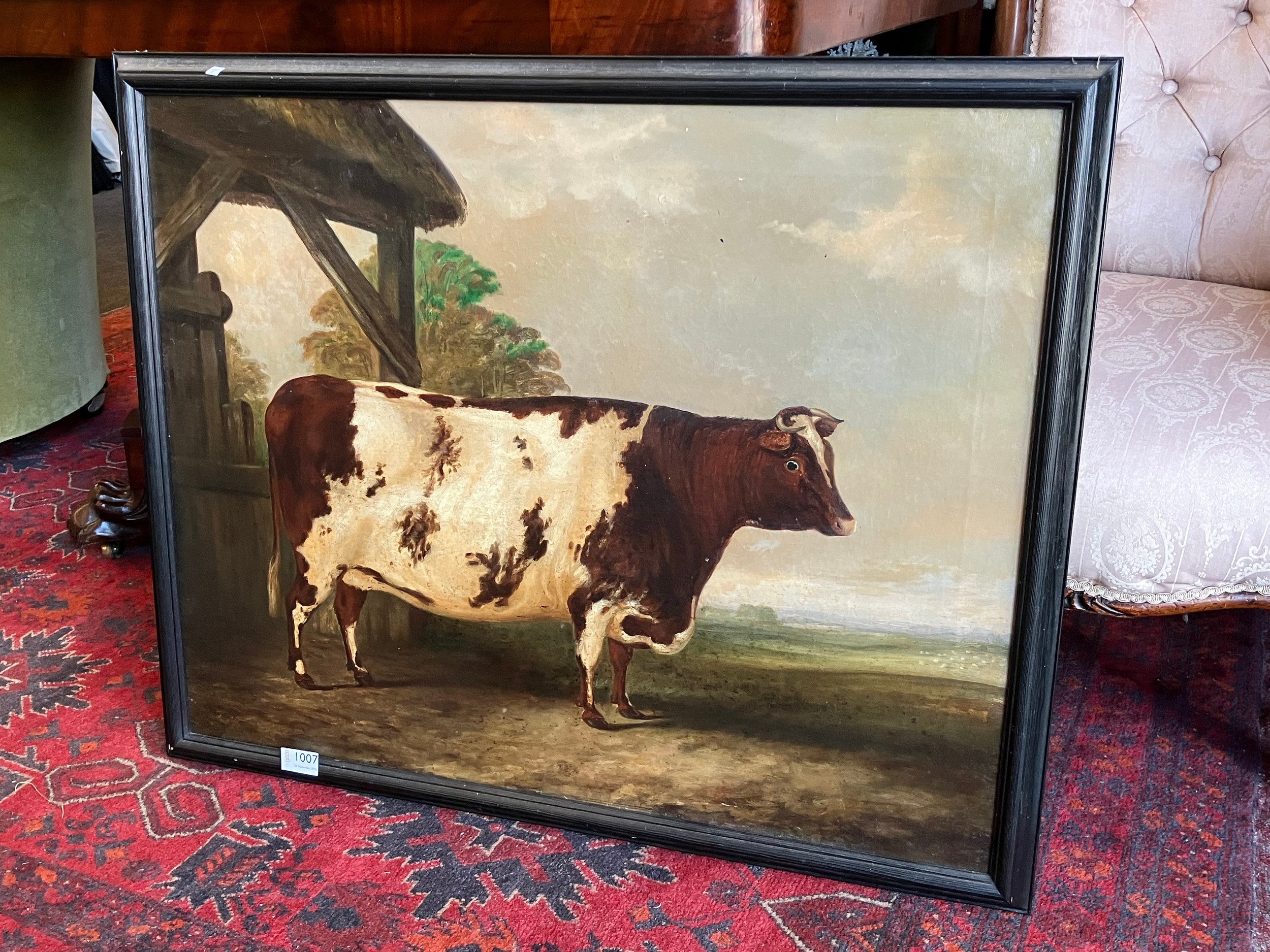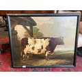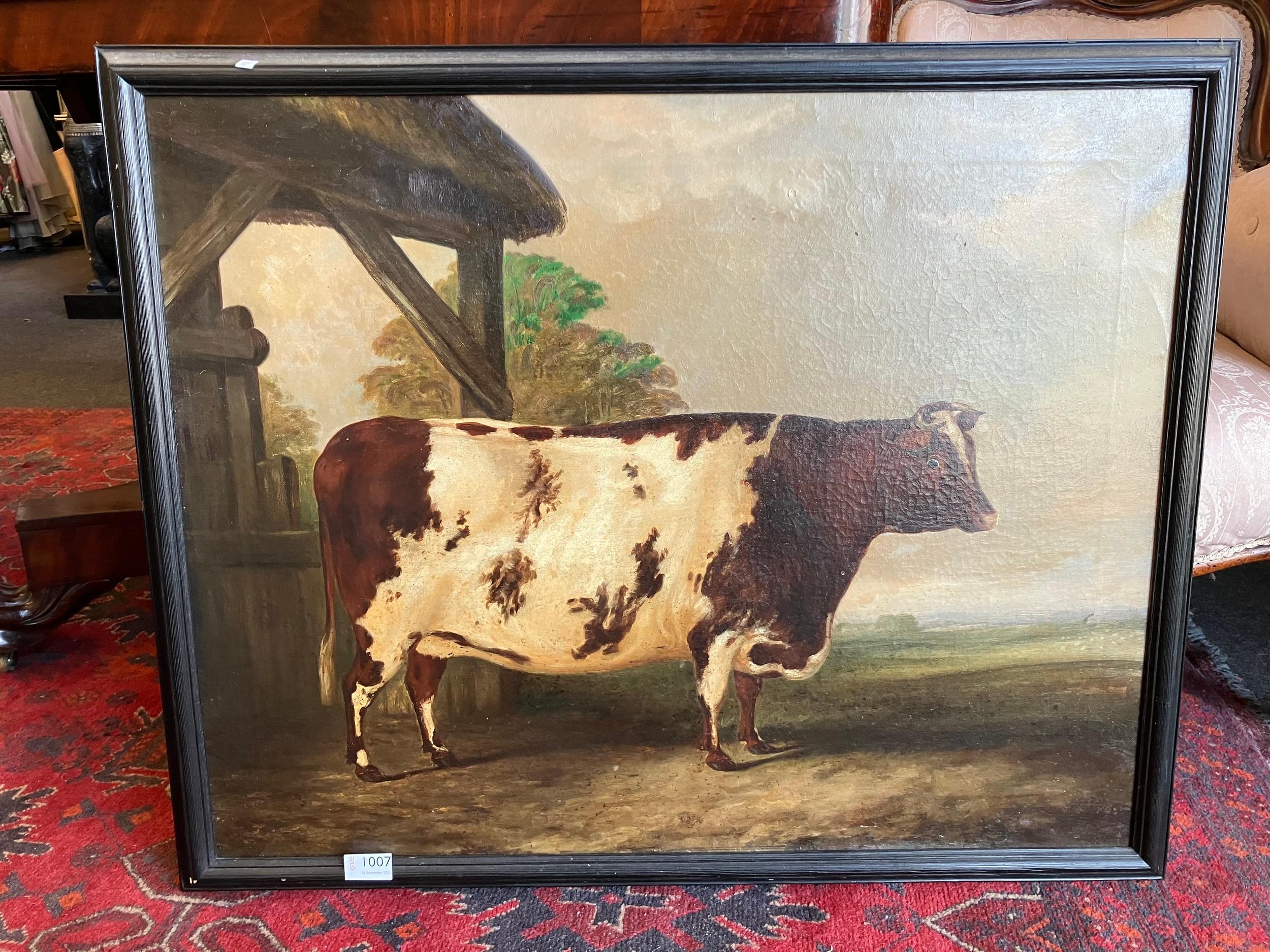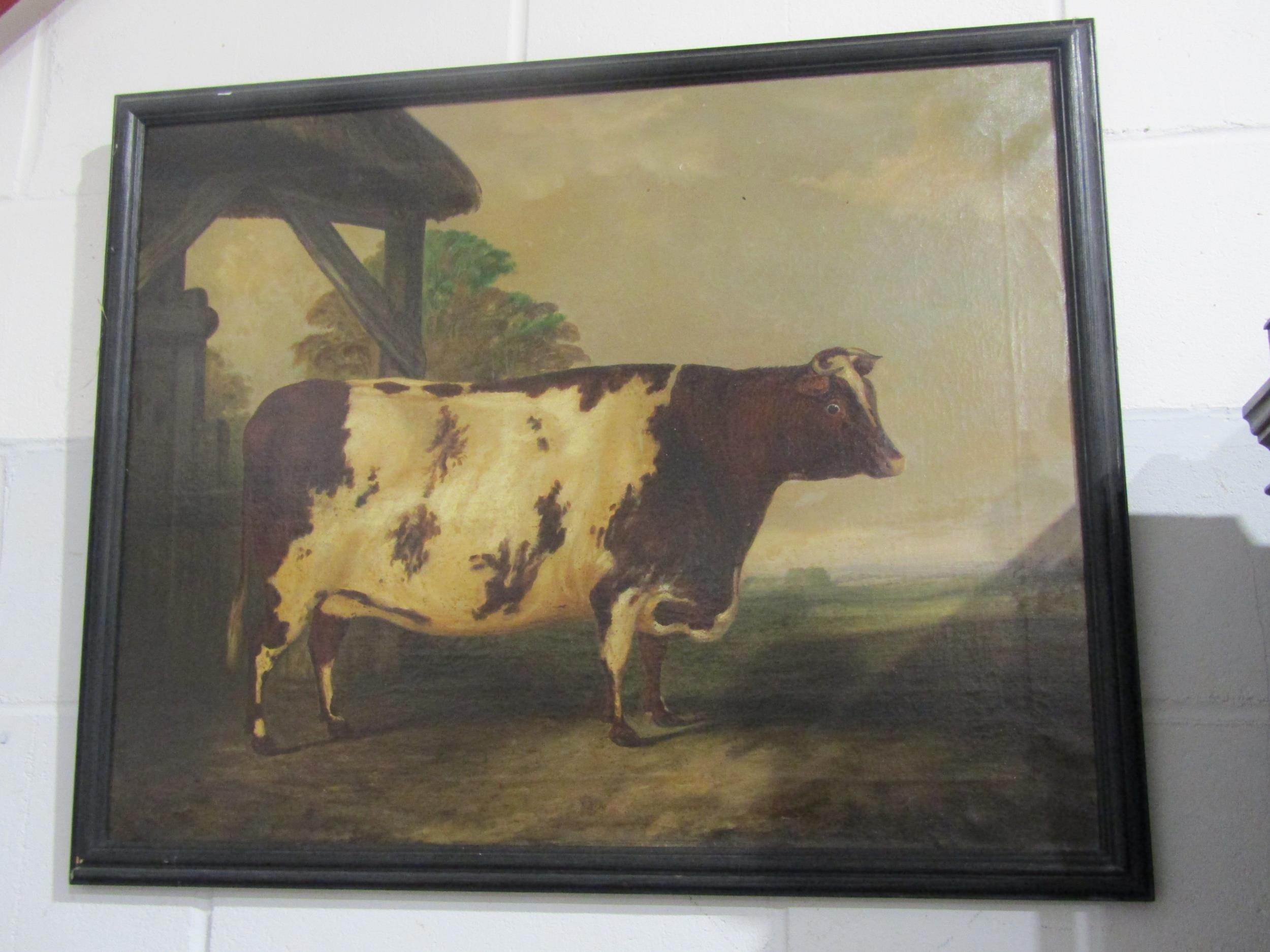A 19th Century oil on canvas naïve study of a prize cow, unsigned, set in a later 20th Century frame, old repairs verso. 60cm x 75.5cm image size