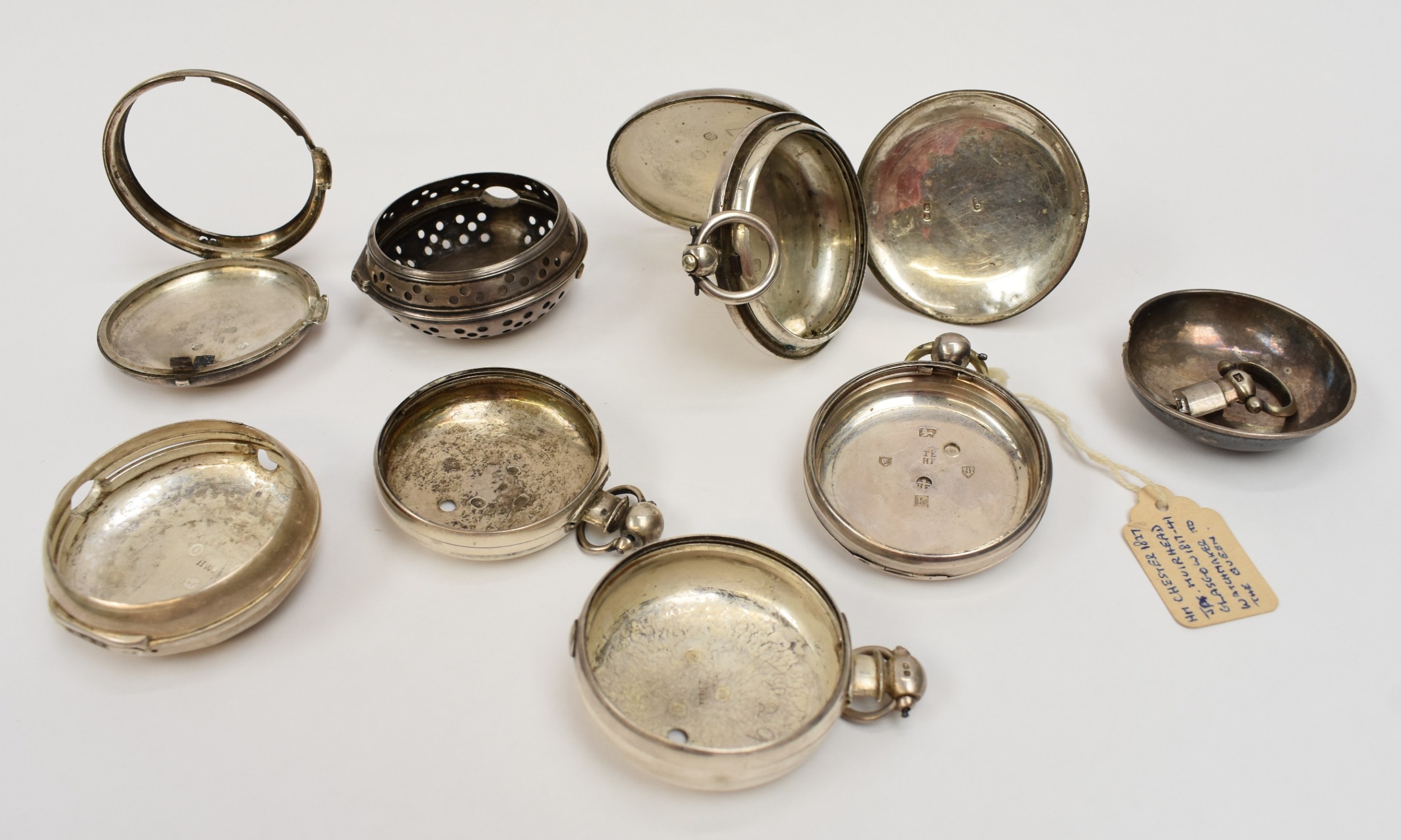 A group of early-mid 19th Century silver pocket watch cases, most pair cases, varying condition, varying hallmarks including Chester and London, all a/f (one piece white metal) 270g of marked silver