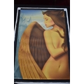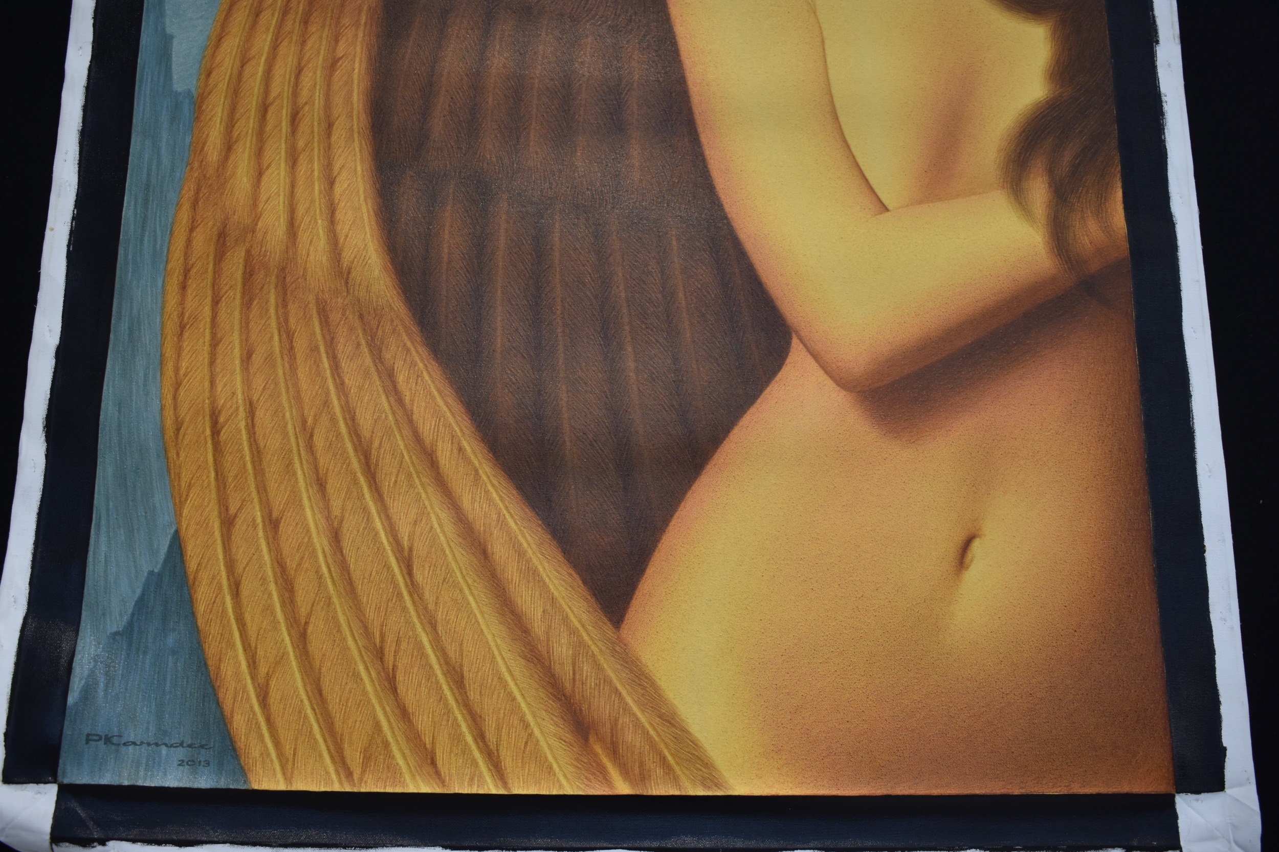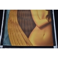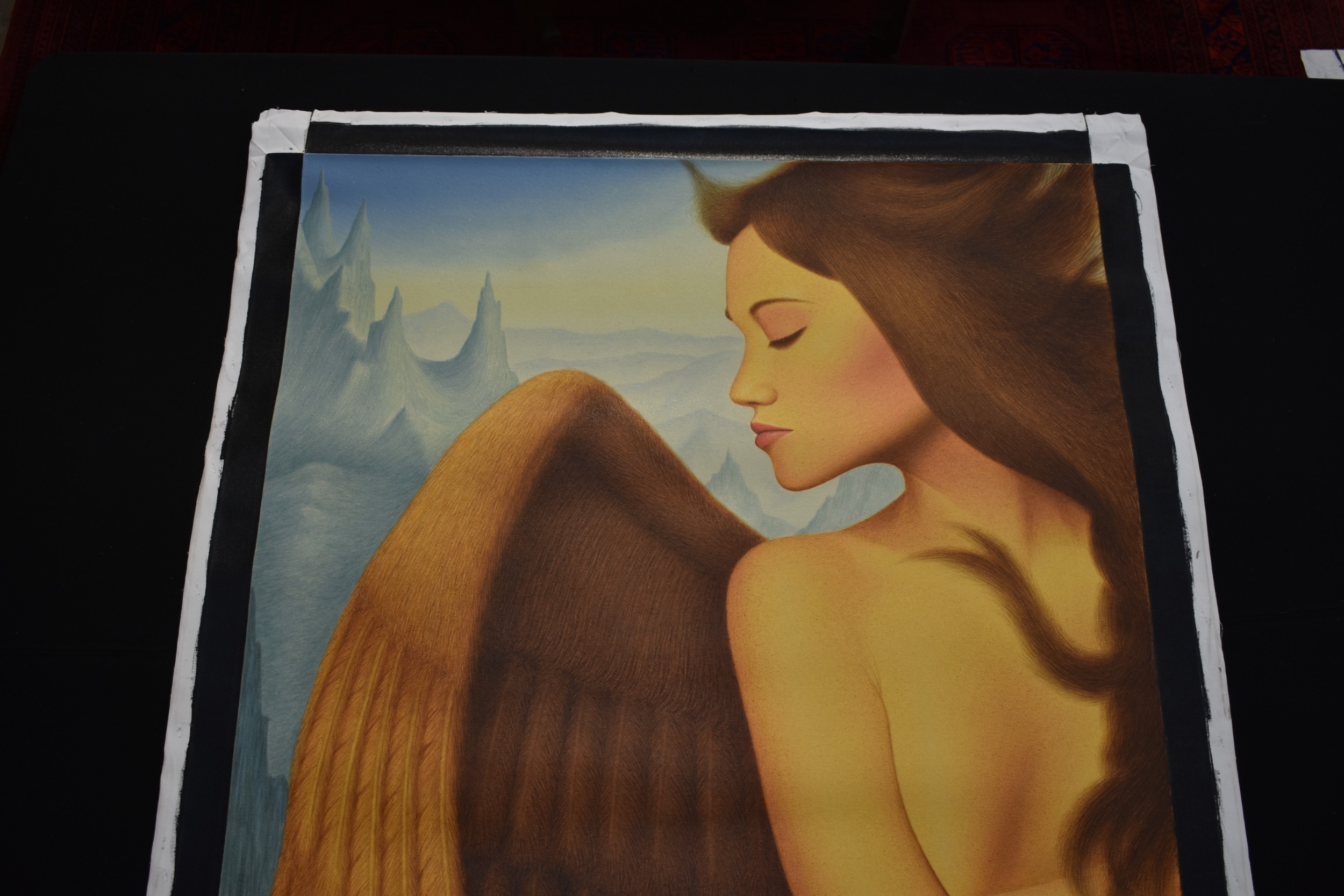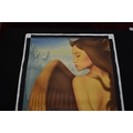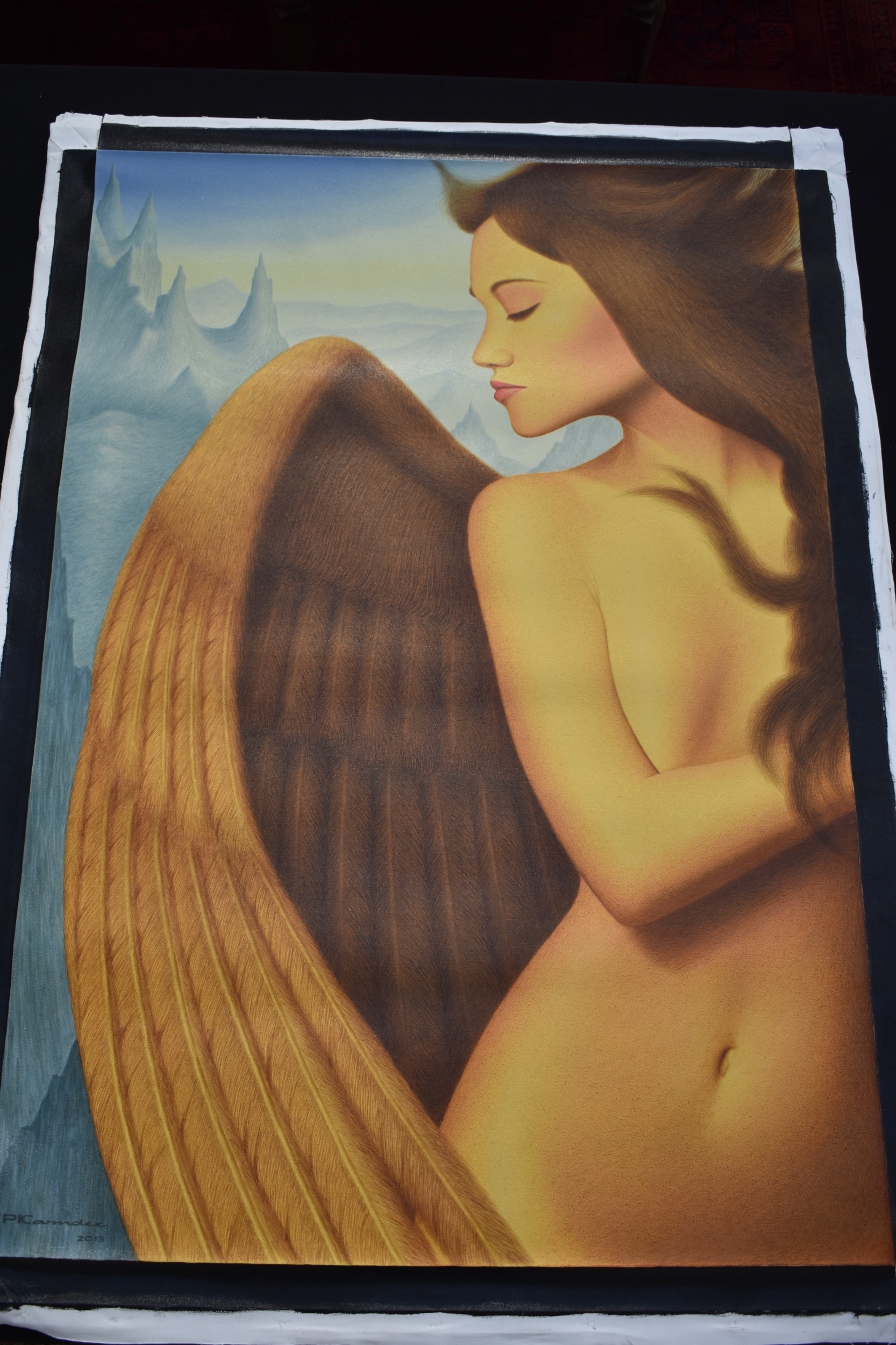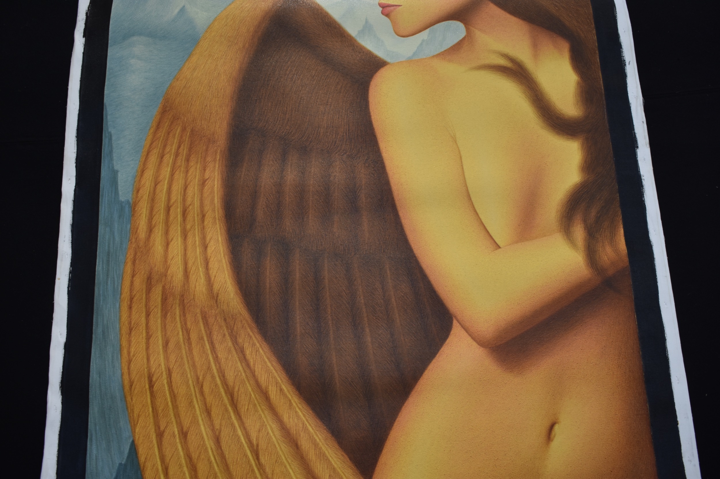 PAIROJ KARNDEE Thai Contemporary Artist: Portrait female in Angel form, untitled, the half length figure with the wing offering protection, mountainous landscape in the background beige tonal skin, acrylic on canvas. The artist has been influenced by the mysterious Apsaras - the celestial maidens of ancient Asian culture depicted in the galleries of Cambodia's Angkor Wat. His techniques painstakingly recreate the stone textures of those images with a time-consuming rendering of acrylic on linen canvas. His figures show a notable range of emotions. Signed and dated, 2013, images size 129.5cm x 89cm