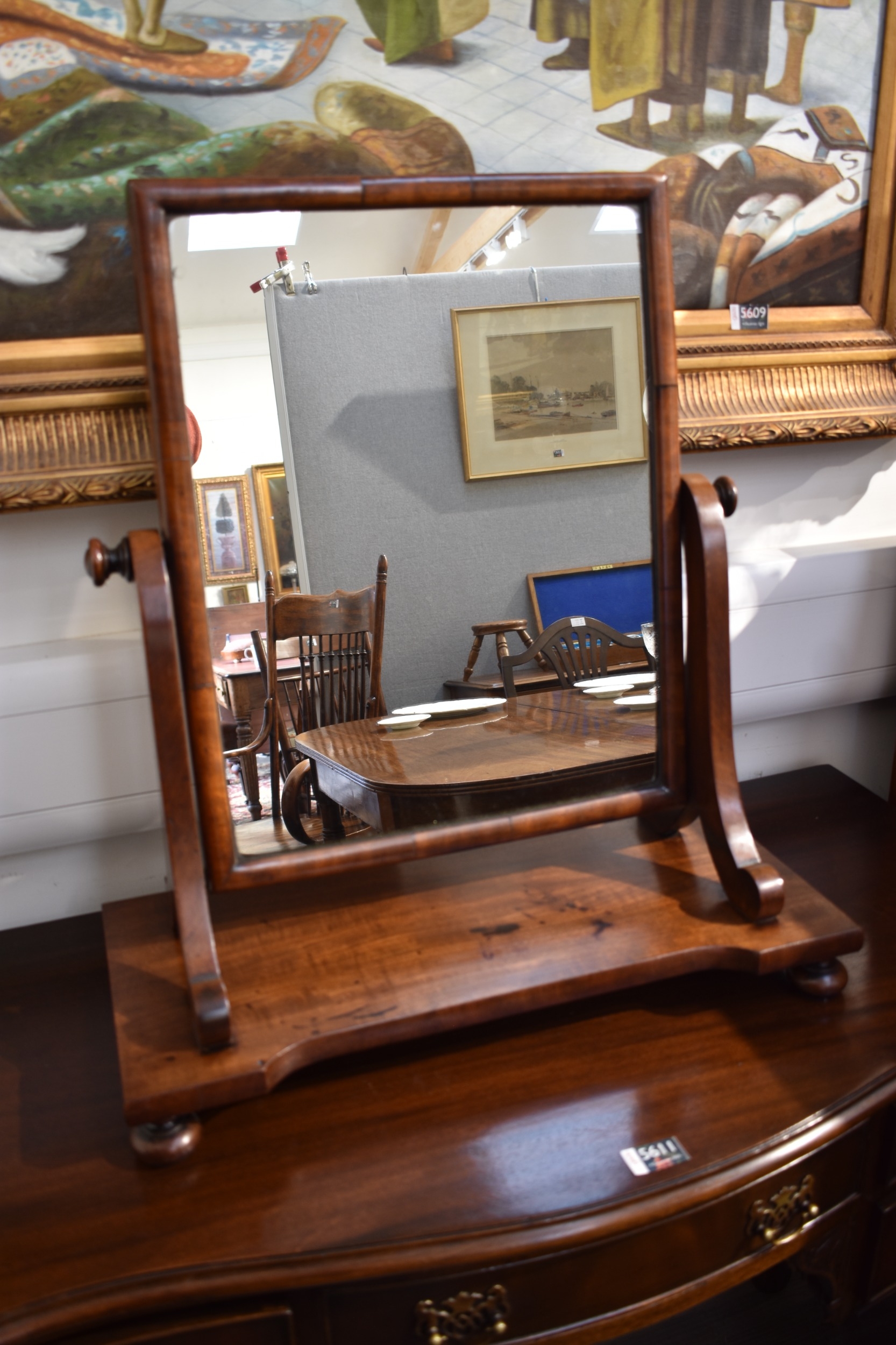 A George III mahogany dressing chest tilting mirror on bun feet. 63cm tall x 54cm wide