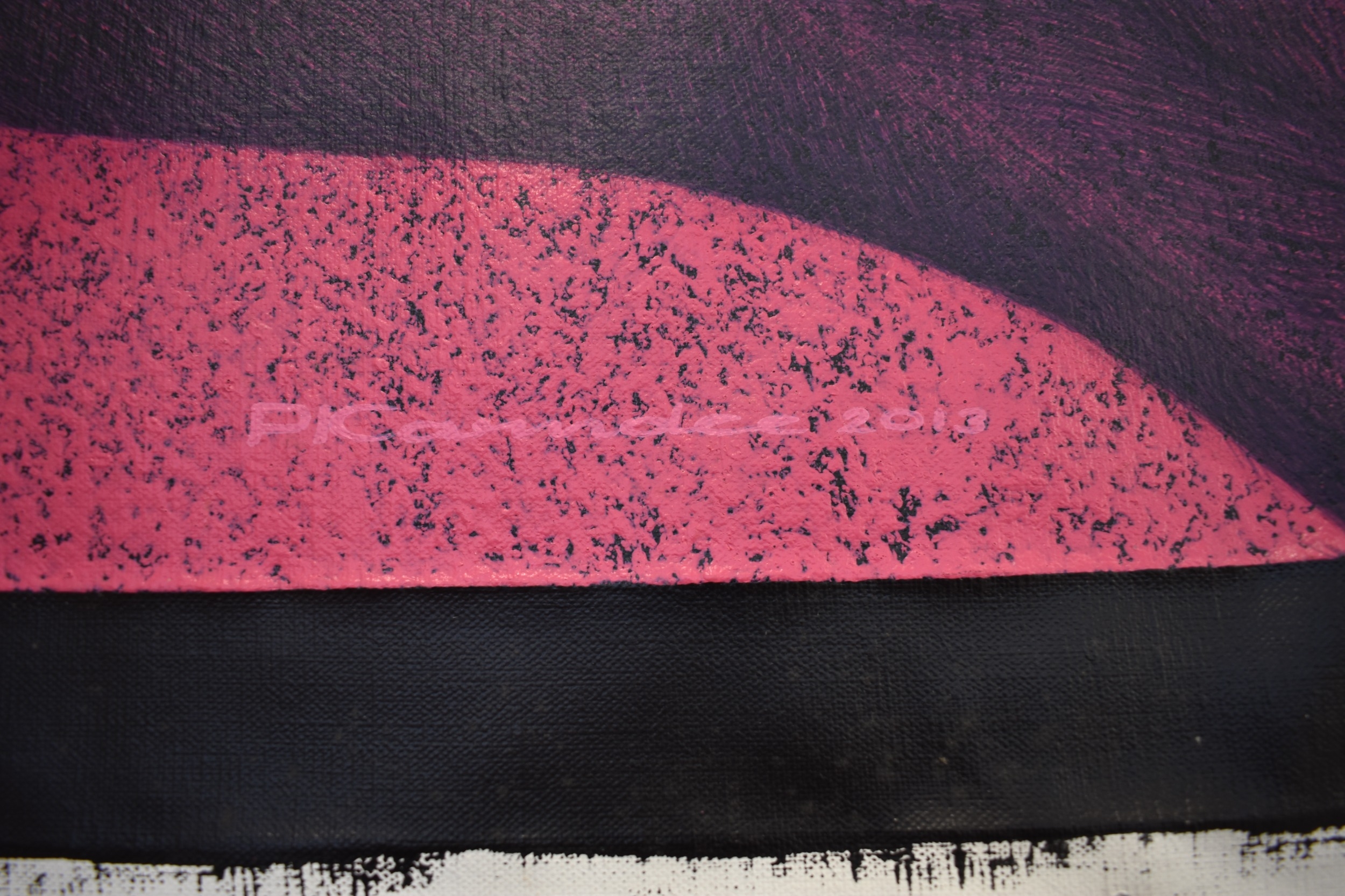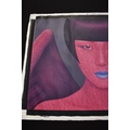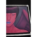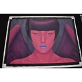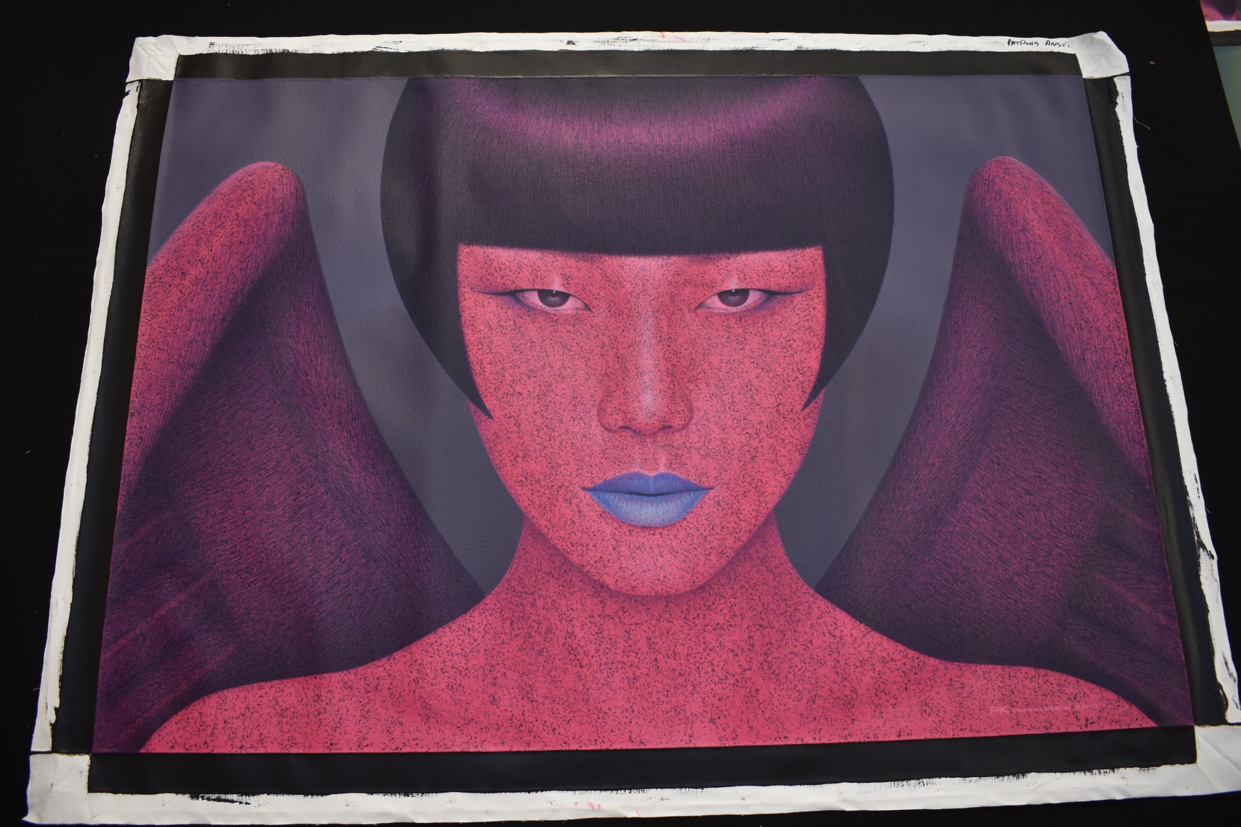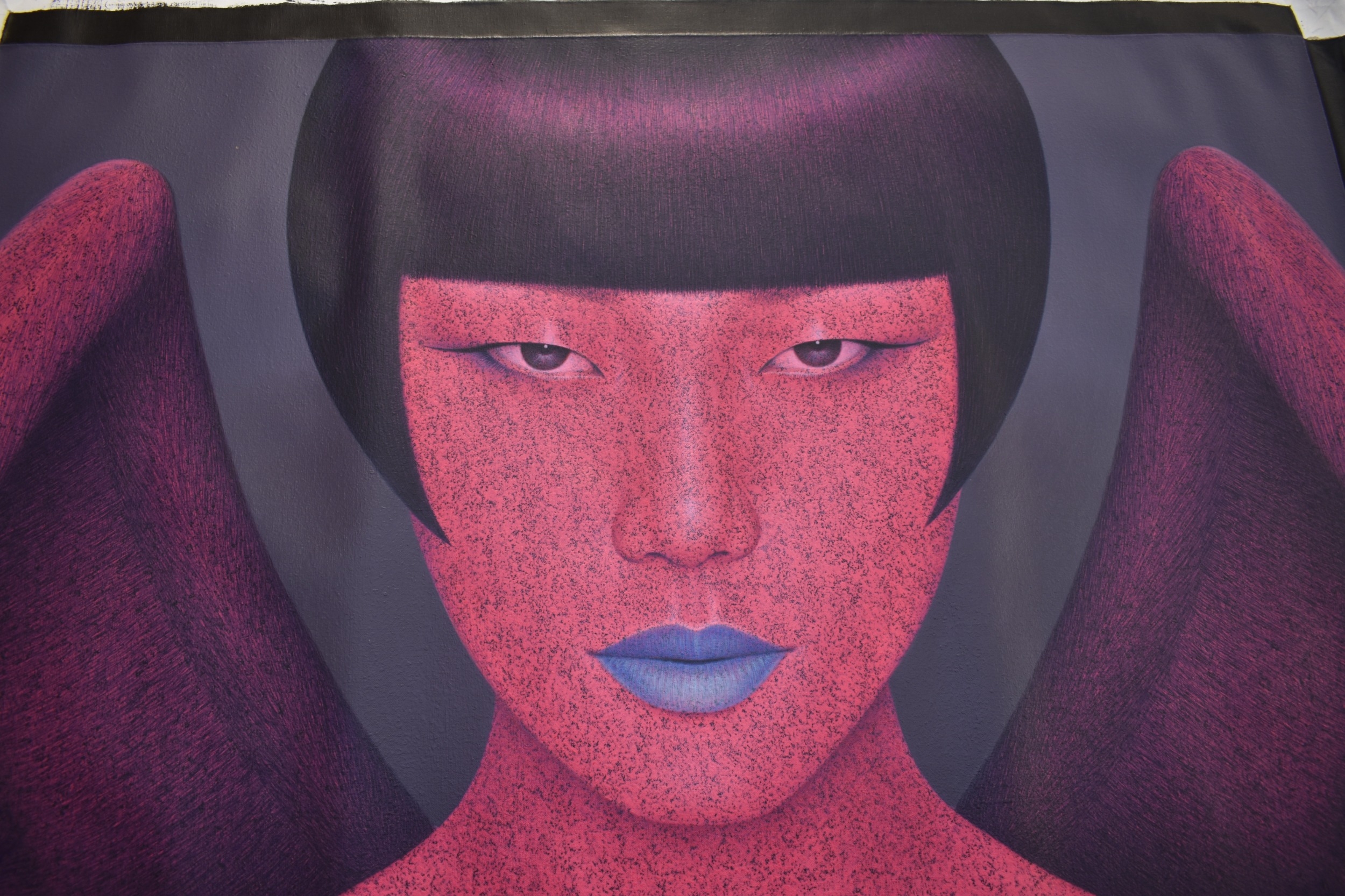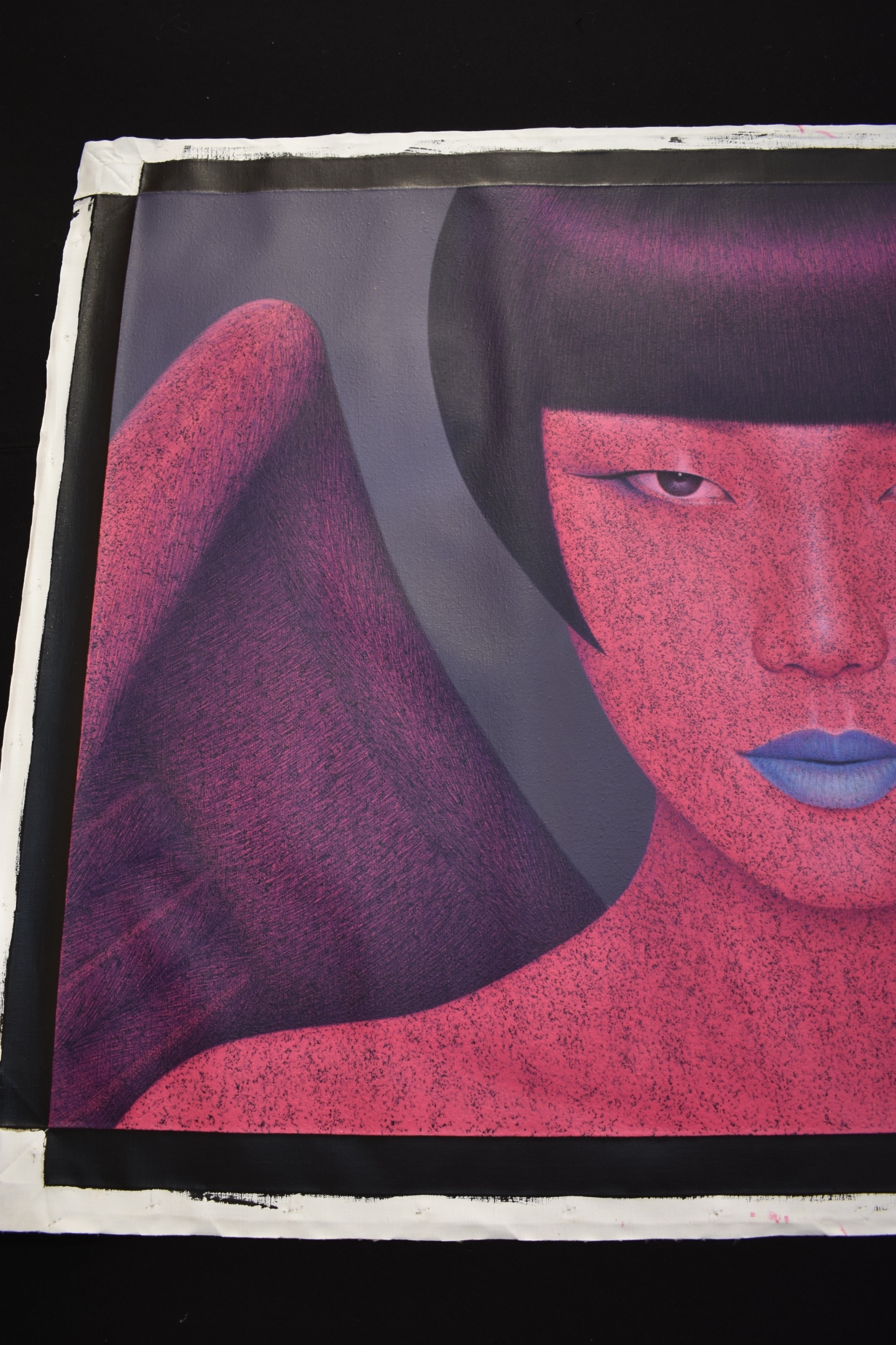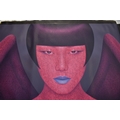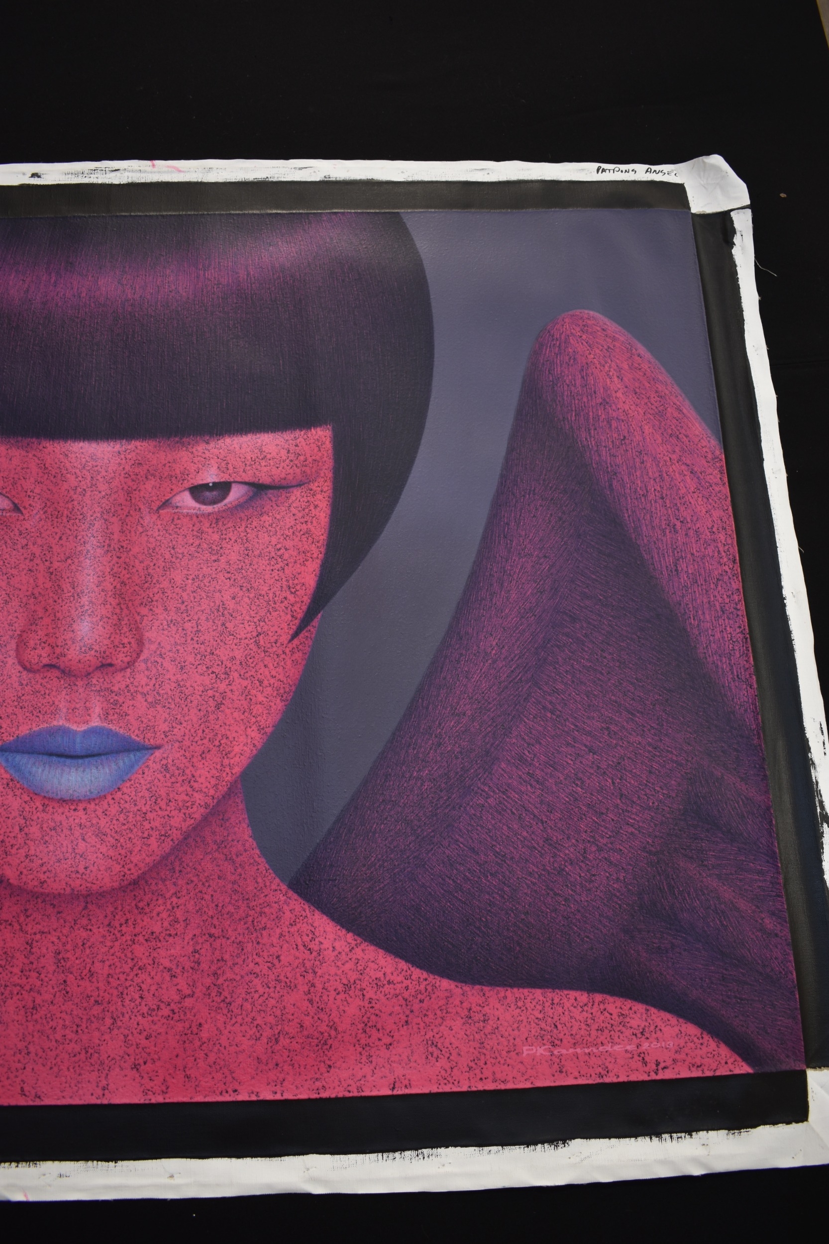 PAIROJ KARNDEE Thai Contemporary Artist: Portrait female in Angel form, titled " Patpong Angel" the angel facing forward, with bobbed hair and blue lips, pink tonal skin, acrylic on canvas. The artist has been influenced by the mysterious Apsaras - the celestial maidens of ancient Asian culture depicted in the galleries of Cambodia's Angkor Wat. His techniques painstakingly recreate the stone textures of those images with a time-consuming rendering of acrylic on linen canvas. His figures show a notable range of emotions. Signed and dated, 2013, images size 89.5cm x 129.5cm