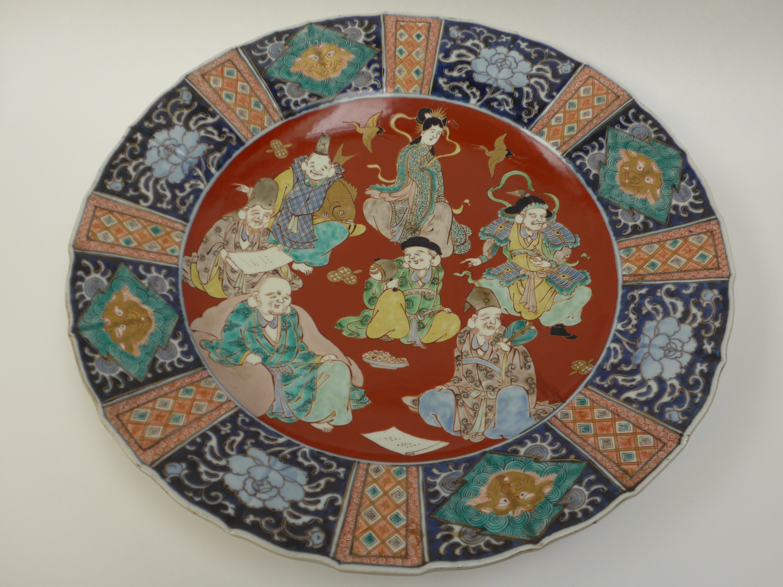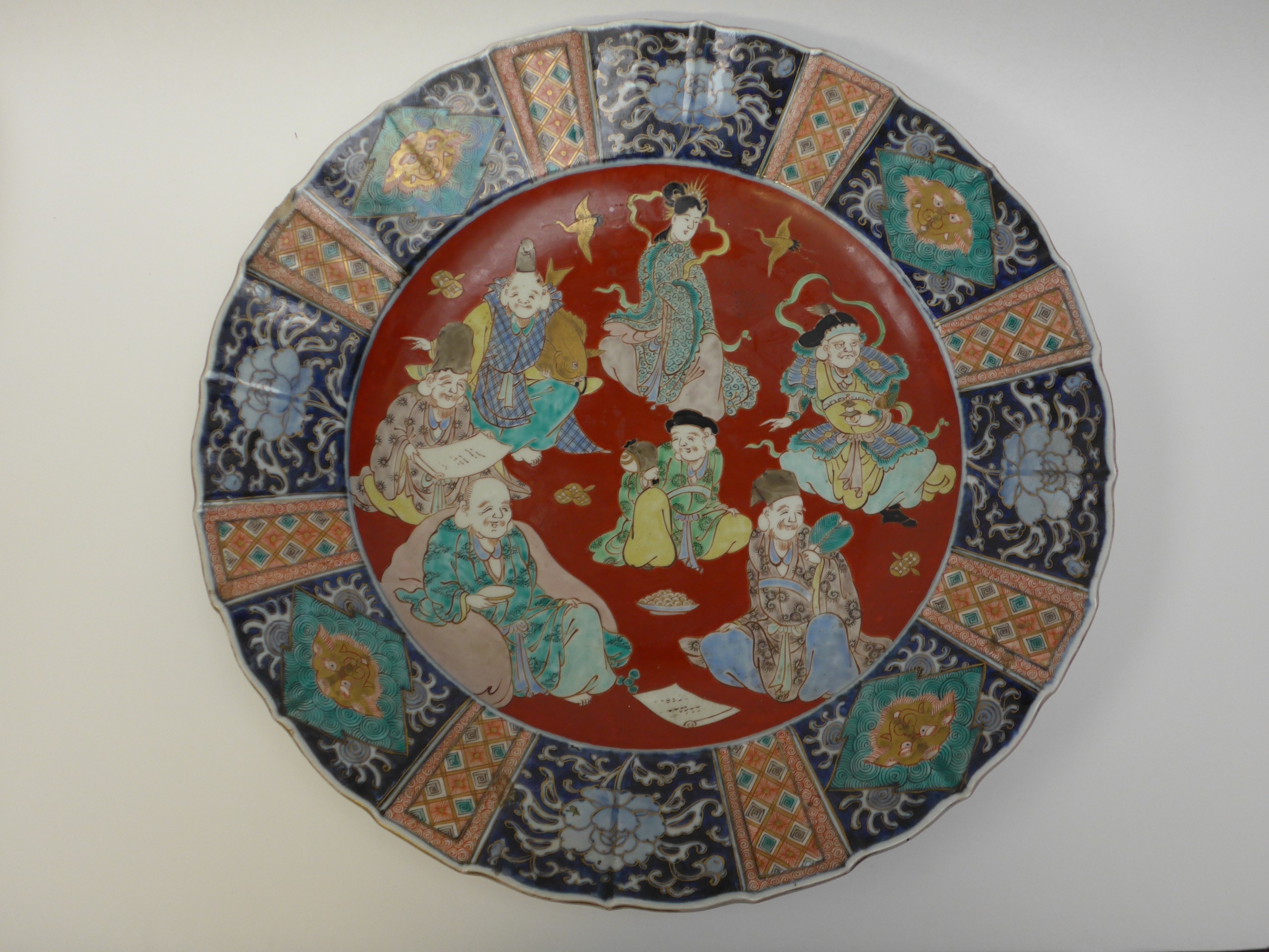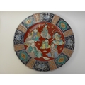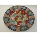 A pair of 19th Century Chinese ceramic chargers of large proportions. A panelled border surrounding a figural centre, 3cm chip to the edge of one. Bright colours, good detail, 46.5cm diameter