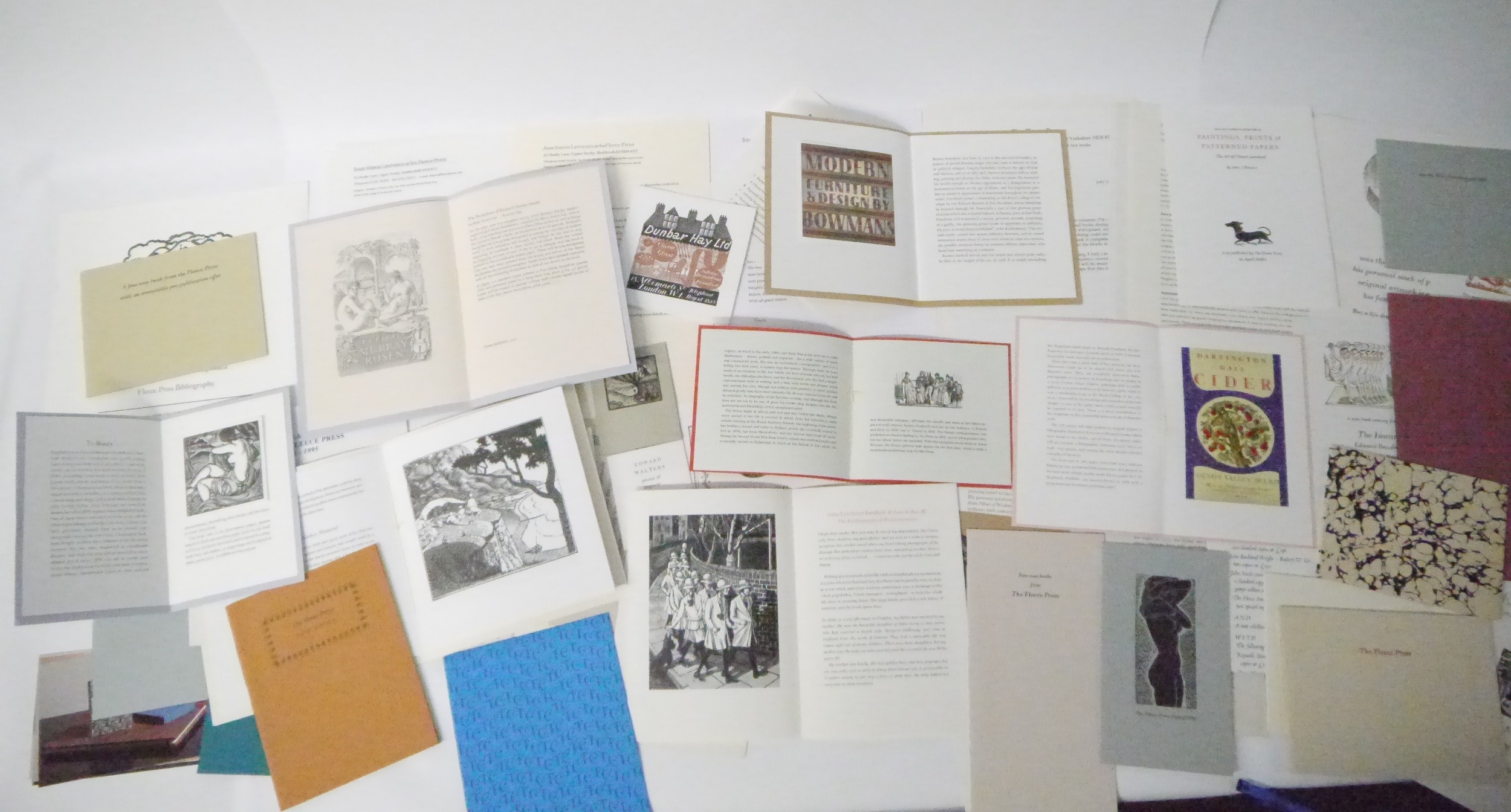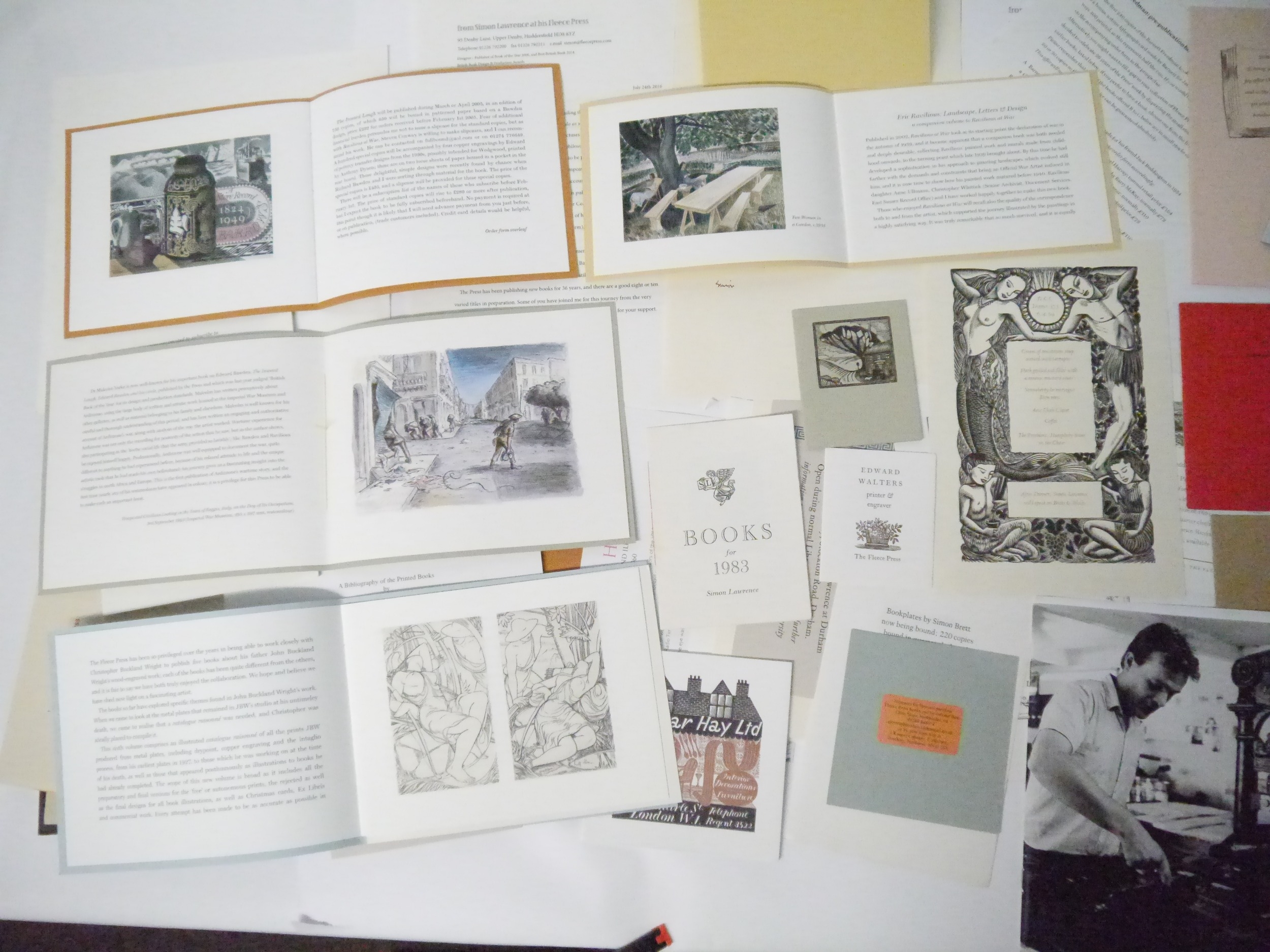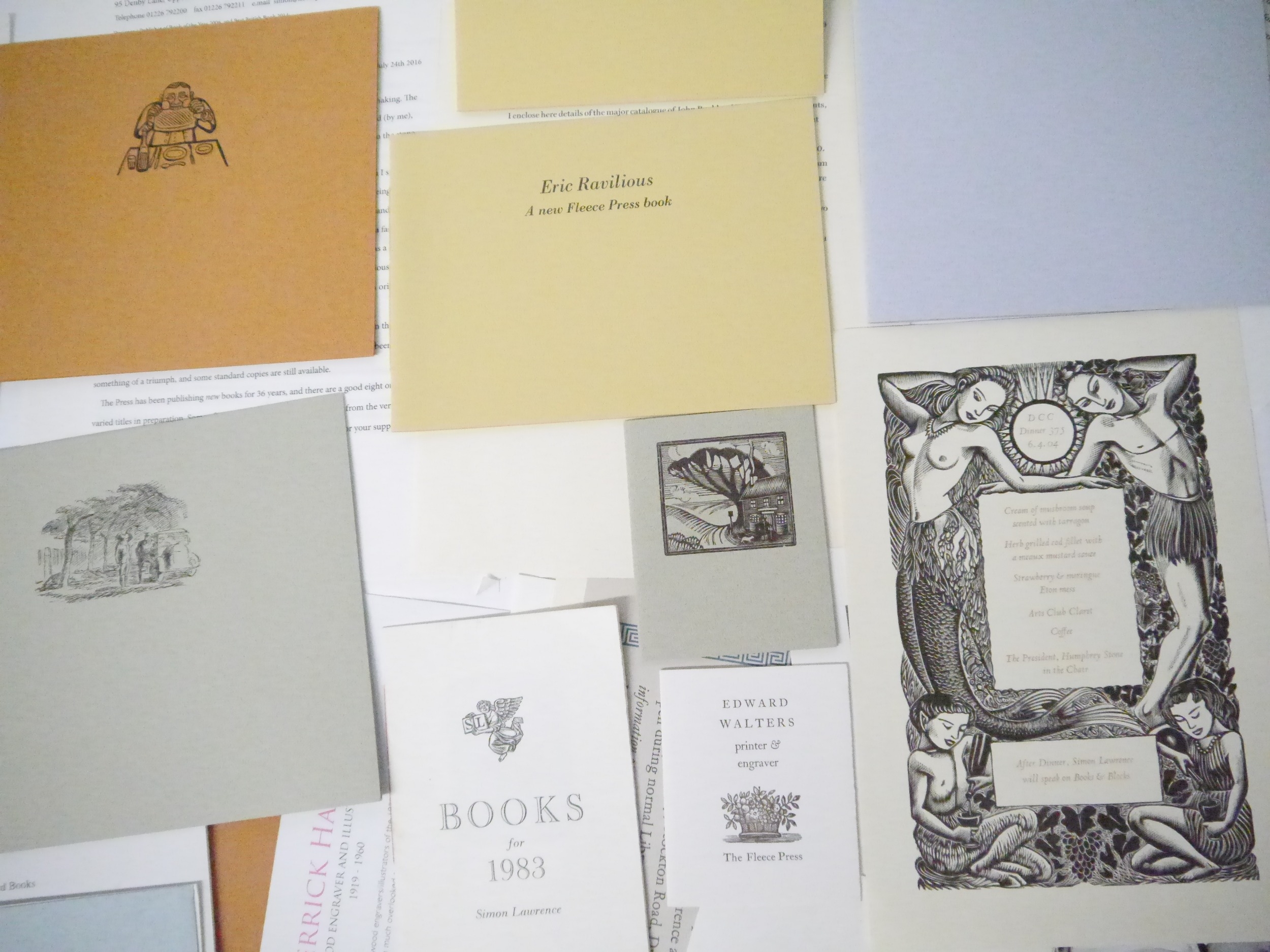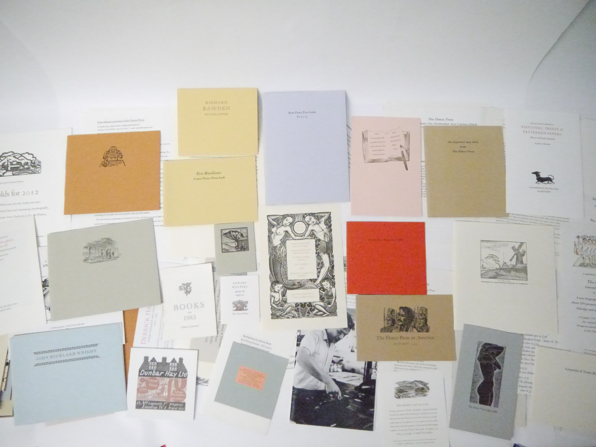 Fleece Press. A collection Fleece Press prospectuses and other ephemera, 80+ items in total, including prospectuses for 'Richard Bawden His Life & Work', 2016, 'The Inward Laugh: Edward Bawden and His Circle', 2004, 'Eric Ravilious: Landscape, Letters & Design', 2008, 'To War with Paper & Brush. Captain Edward Ardizzone, Official War Artist', 2007, 'Dunbar Hay', 2016, 'The Graphic Work of Barnett Freedman', 2006, 'Sensuous Lines...John Buckland Wright', 2014, plus numerous other prospectuses and items Edward Walters, Tirzah Garwood, Joan Hassall, Albert Rutherston, Barnett Freedman, Douglas Percy Bliss, Claughton Pellew, Anthony Gross, Leo Wyatt etc, plus Double Crown Club dinner menu 6.4.04, several Fleece Press letters signed by Simon Lawrence etc etc (80+ items)