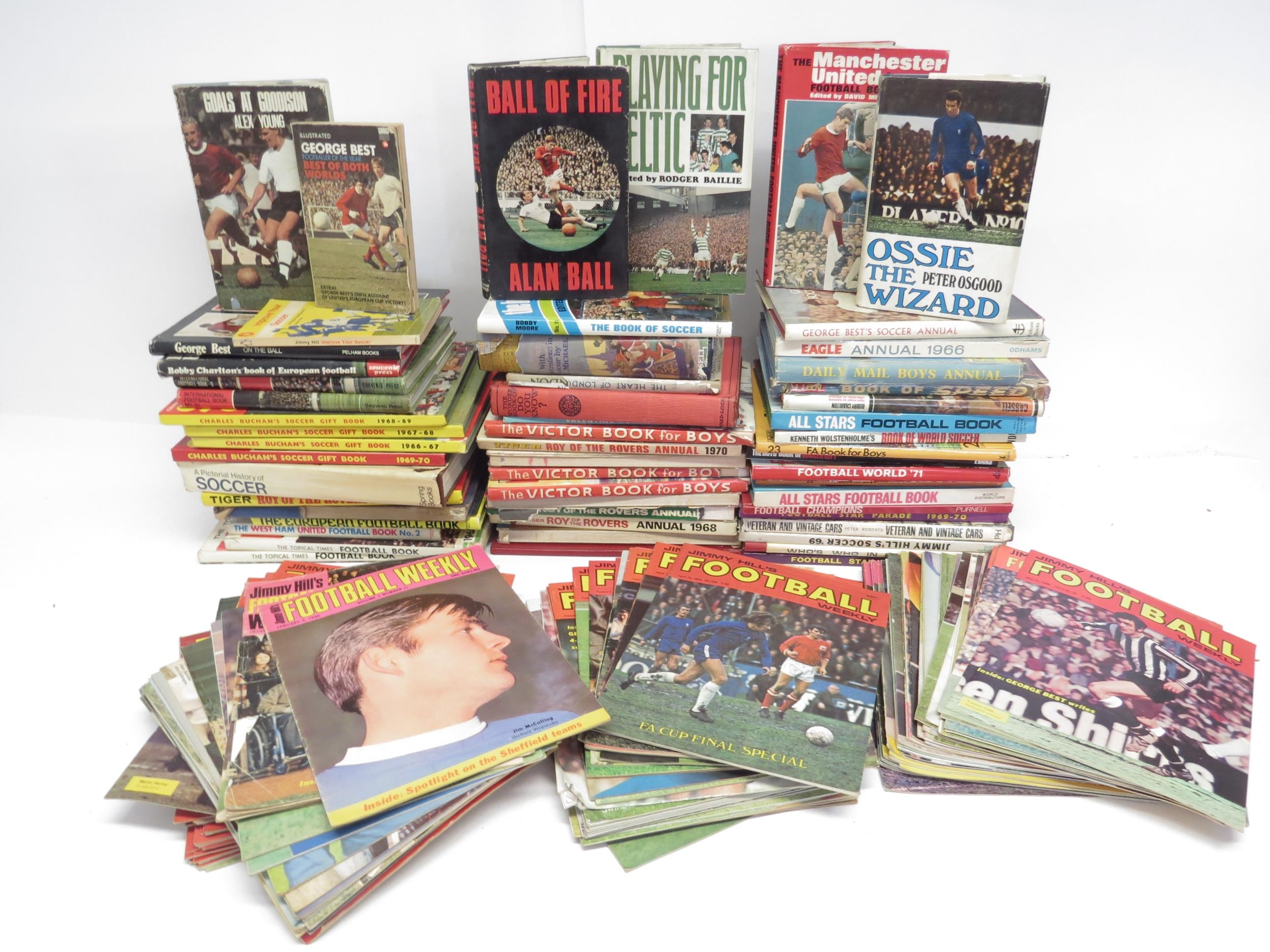 A collection of predominantly 1960s and 1970s books and annuals including a large number of Jimmy Hill's Football Weekly magazines, Tiger, Roy Of The Rovers, Victor, footballer autobiographies including Alan Ball 'Ball Of Fire', Peter Osgood 'Ossie The Wizard', Alex Young 'Goals At Goodison' etc.
