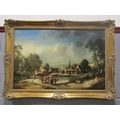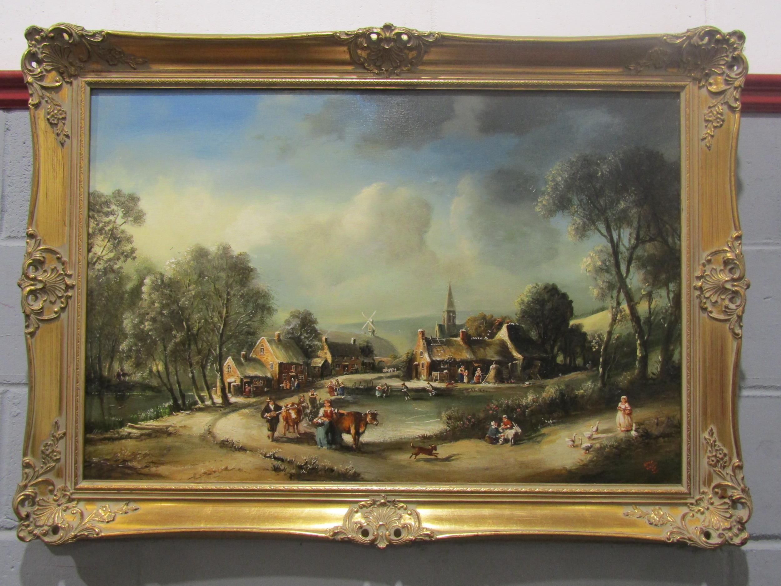 NORMAN HENRY FRENCH AKA RIMA (1906-1984): An oil of Continental village in clearing, figures walking with cattle, signed RIMA RRSM NF lower-right, gilt framed, 60cm x 90cm image size