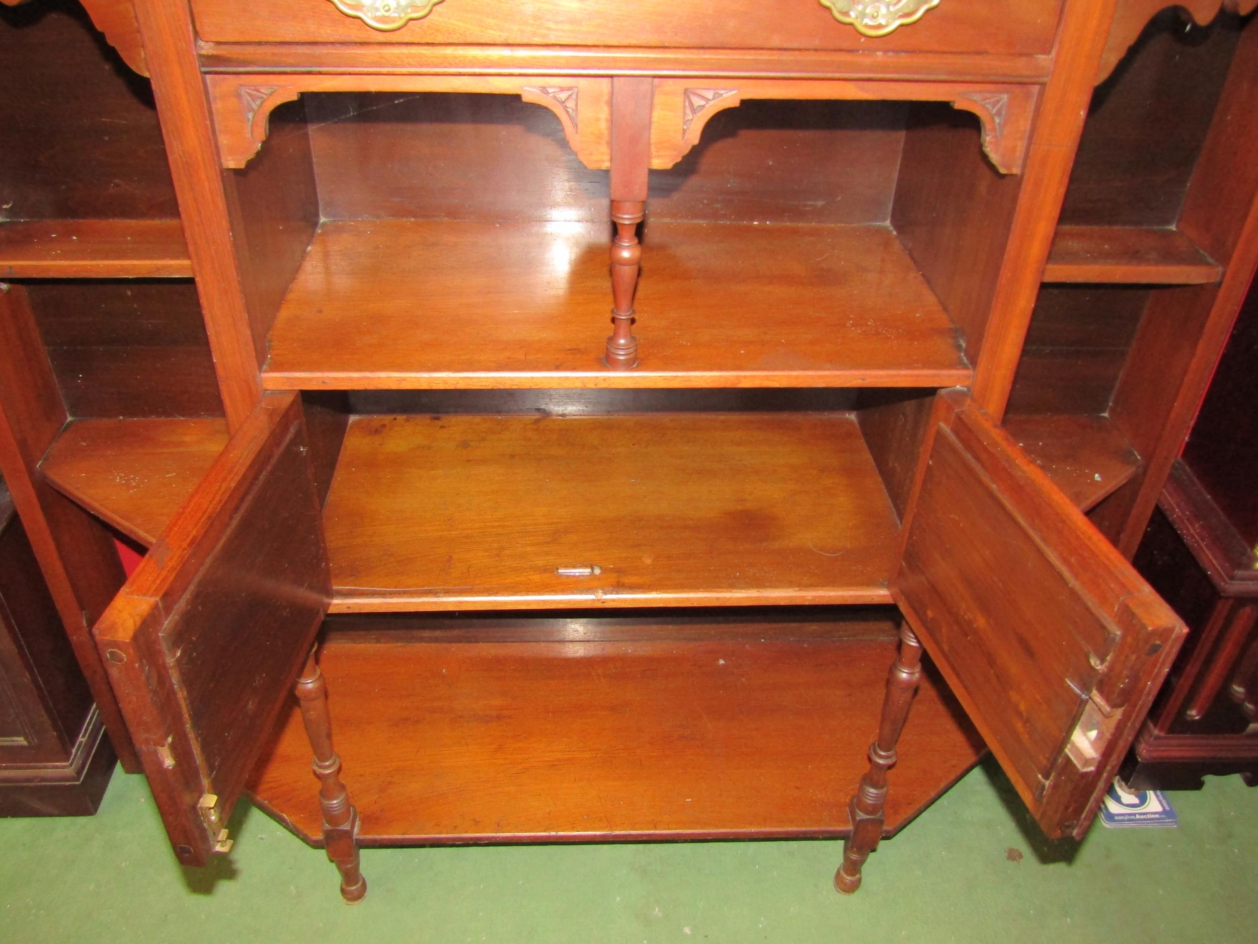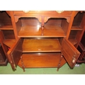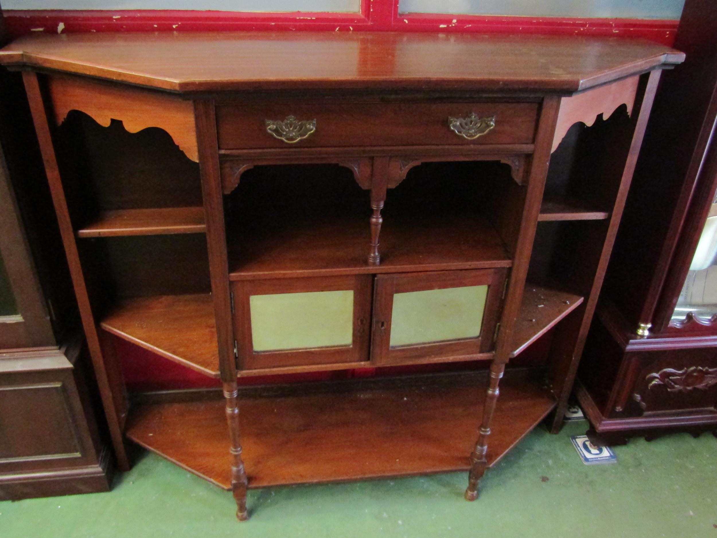 A mahogany hall cupboard base, canted corners, shelved with mirrored door central cupboards and single drawer, 103cm tall x 121cm wide x 35cm deep