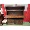 A Georgian "Bwyhyn" Welsh oak dresser of small proportions with carved decoration raised on open shelves over a rising table leaf and open shelf over a two door cupboard with key, 144cm tall x 126cm wide x 32cm deep (not including rising leaf)