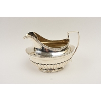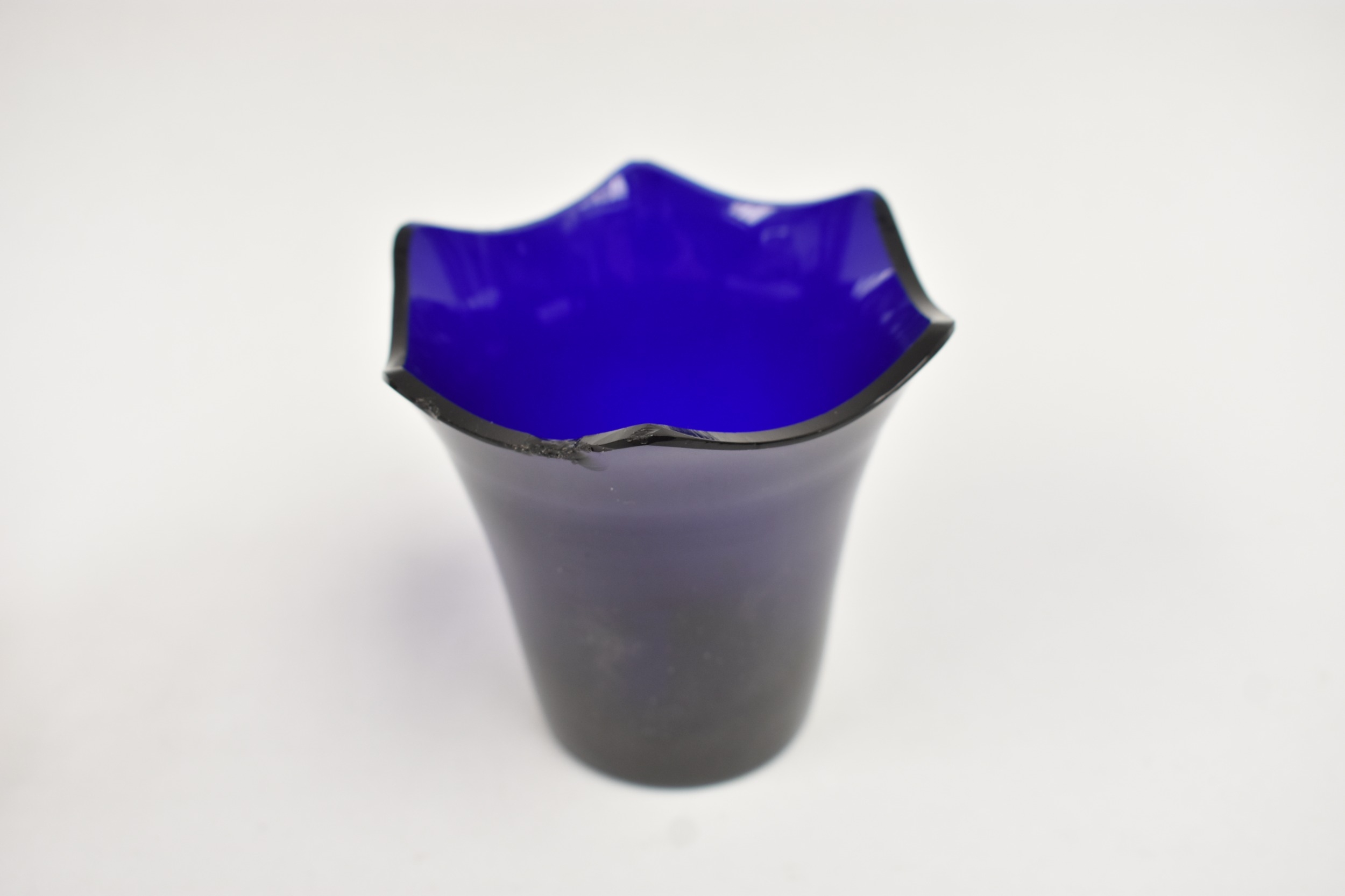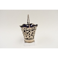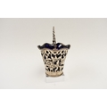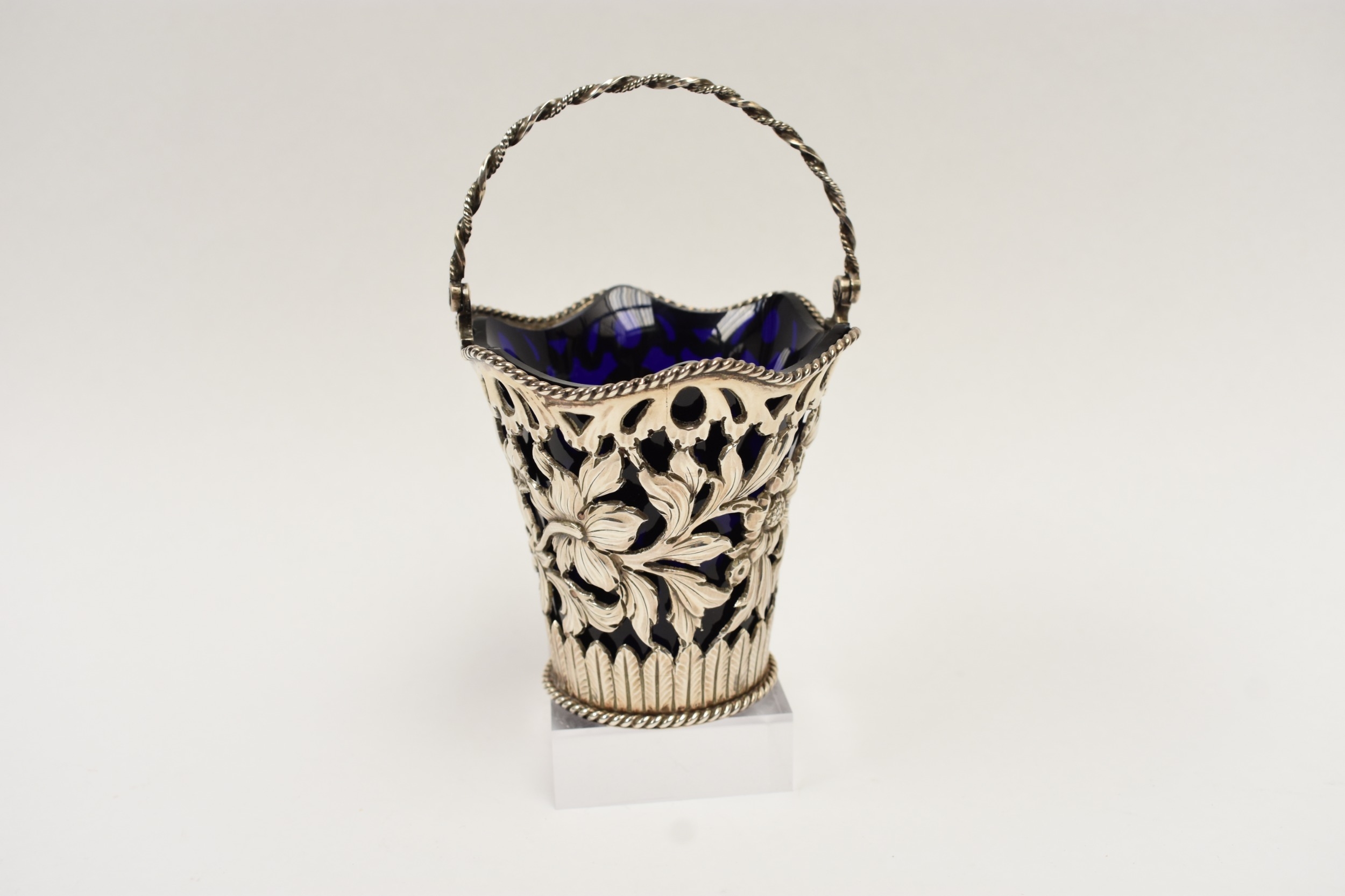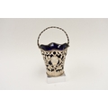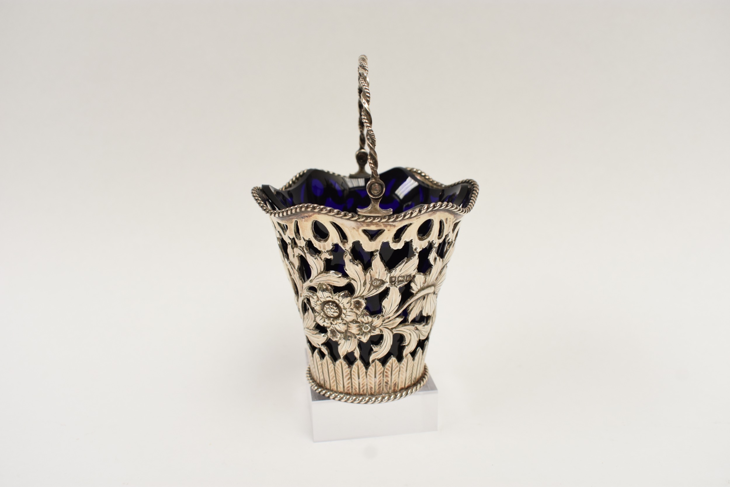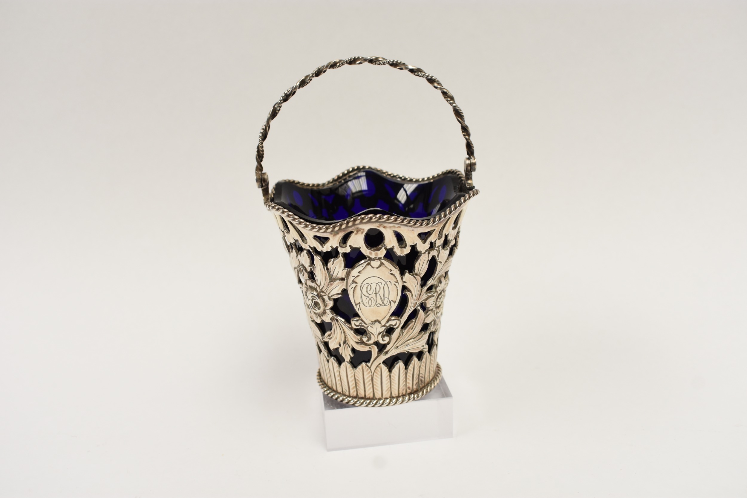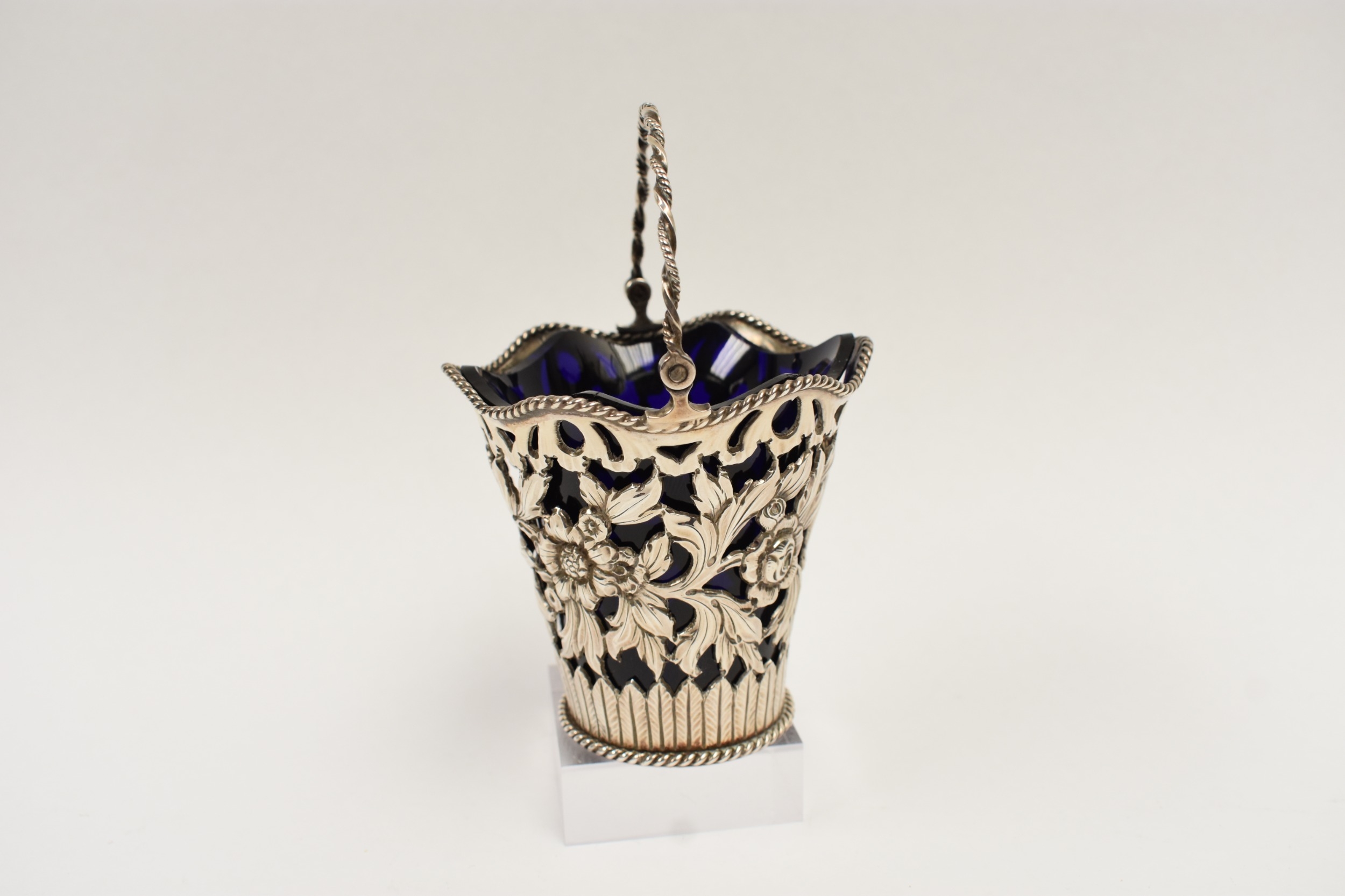 A George Fox silver sugar basket, the pierced body with floral detail, monogrammed cartouche, blue glass liner with slight chips to edge, London 1901, 8.5cm tall. 98g