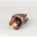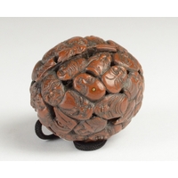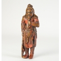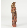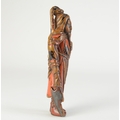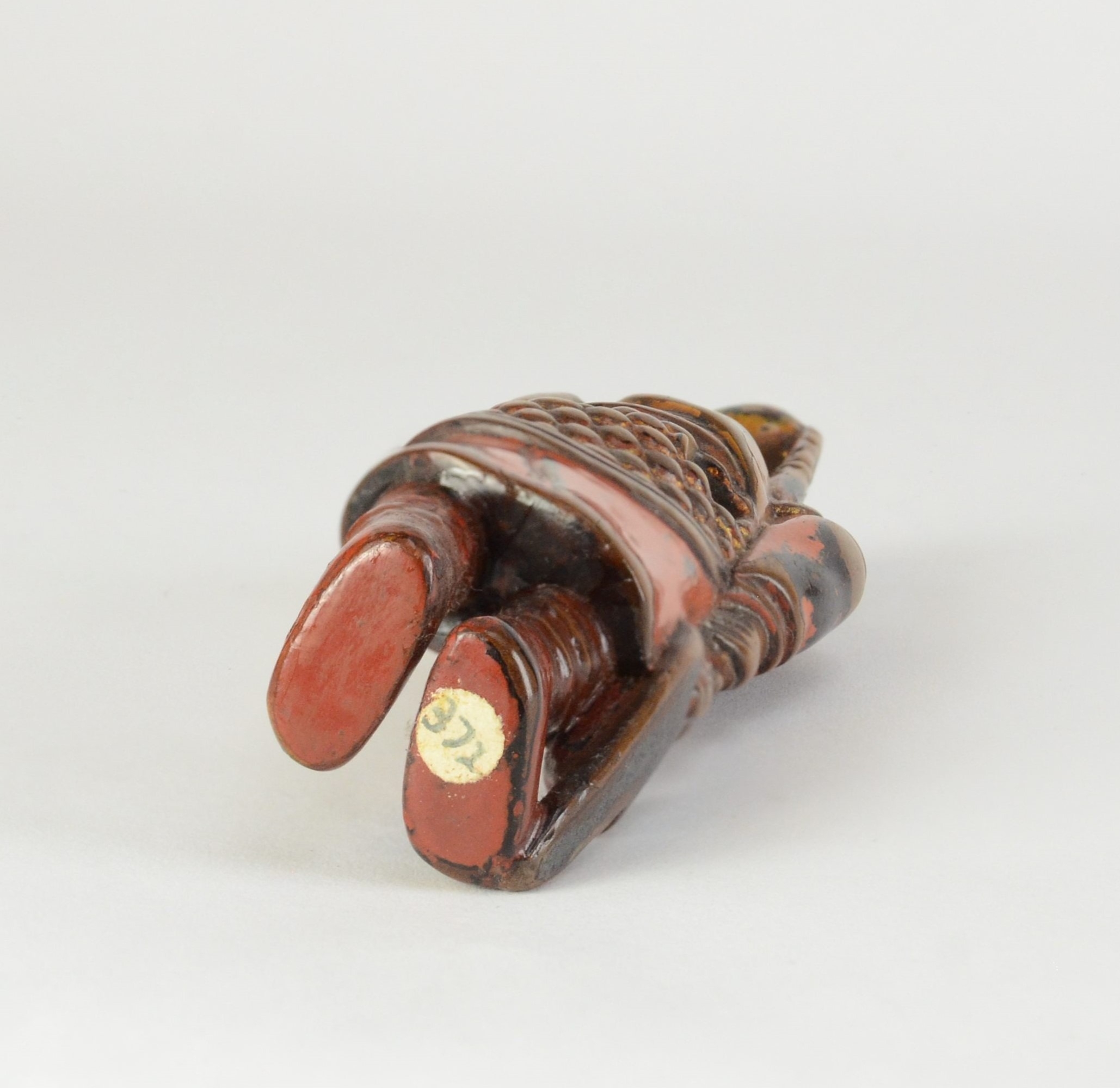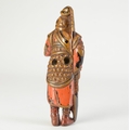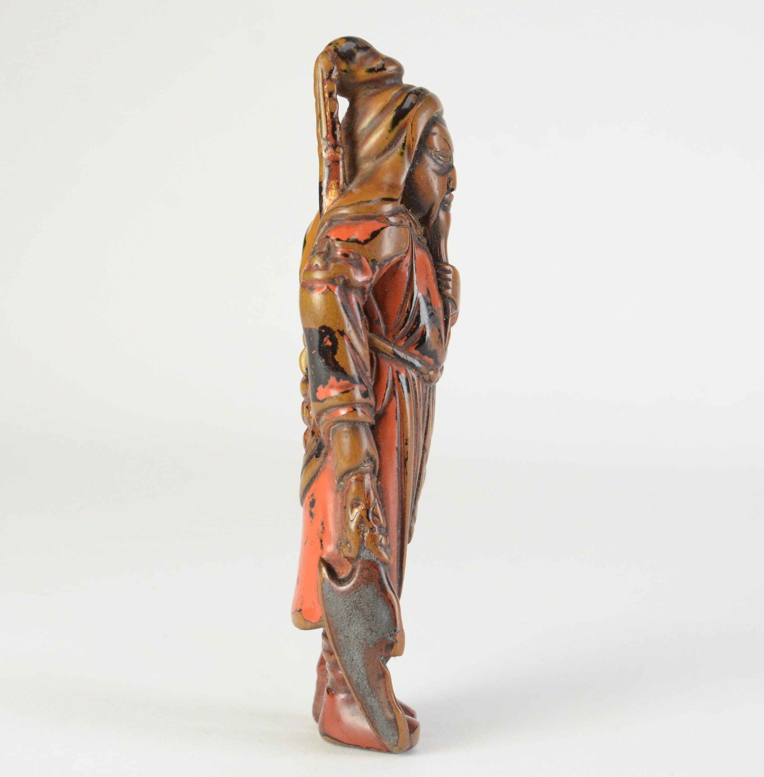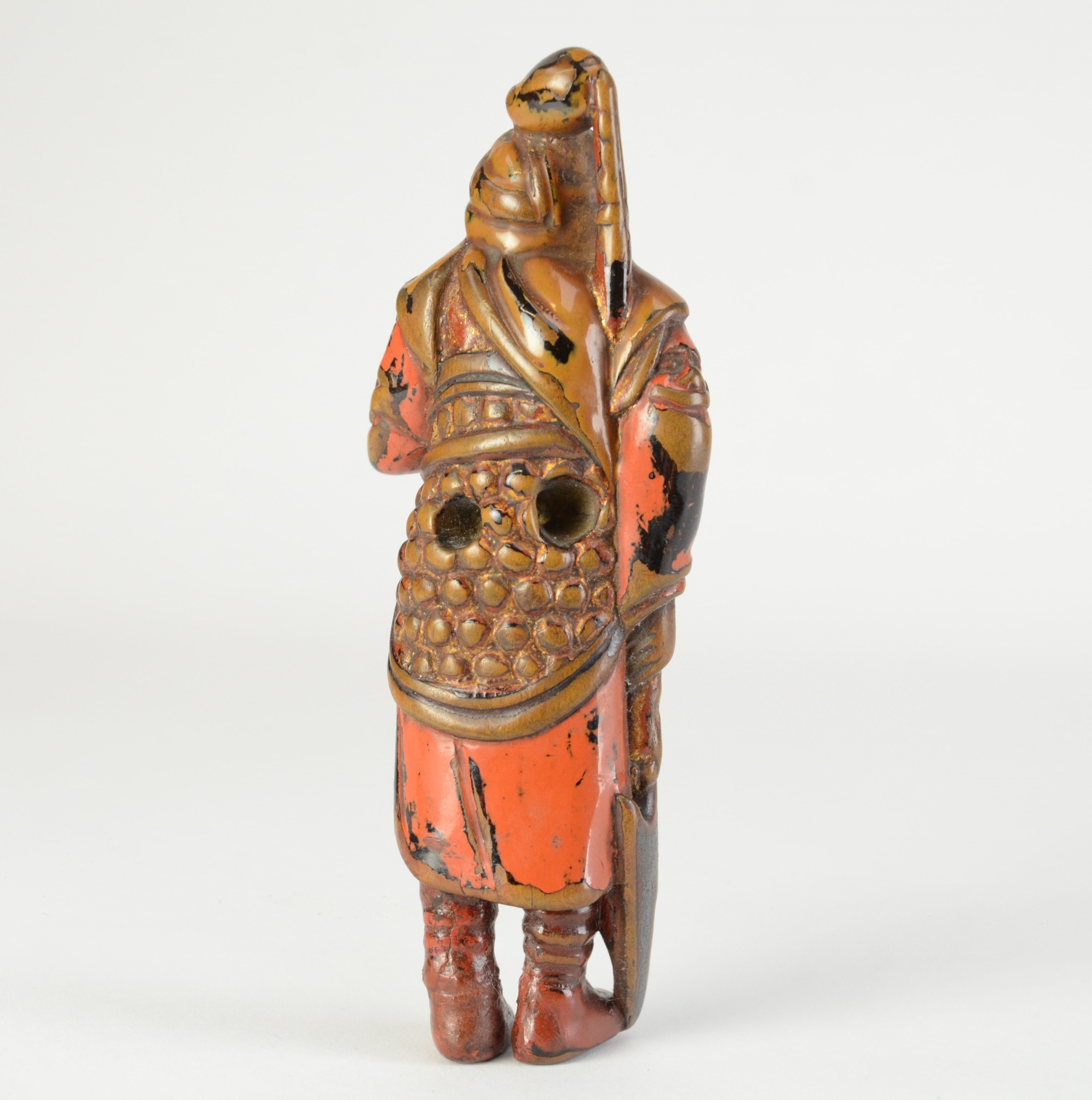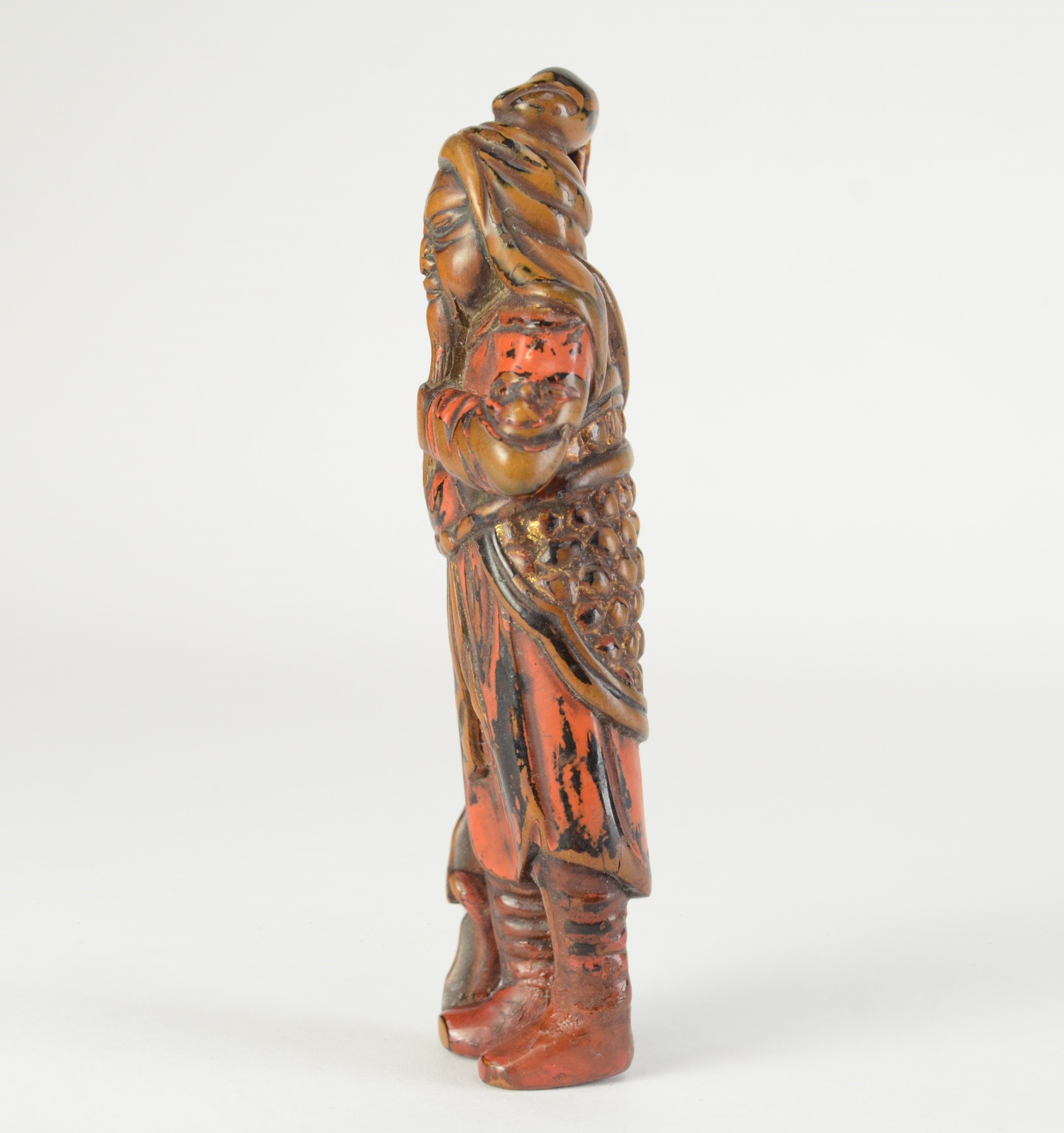 A carved wood and lacquered netsuke of the Chinese general Guan Yu stroking his beard with one hand and holding a halberd in the other, unsigned
