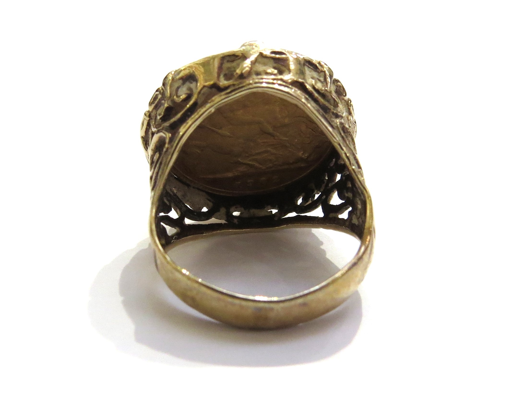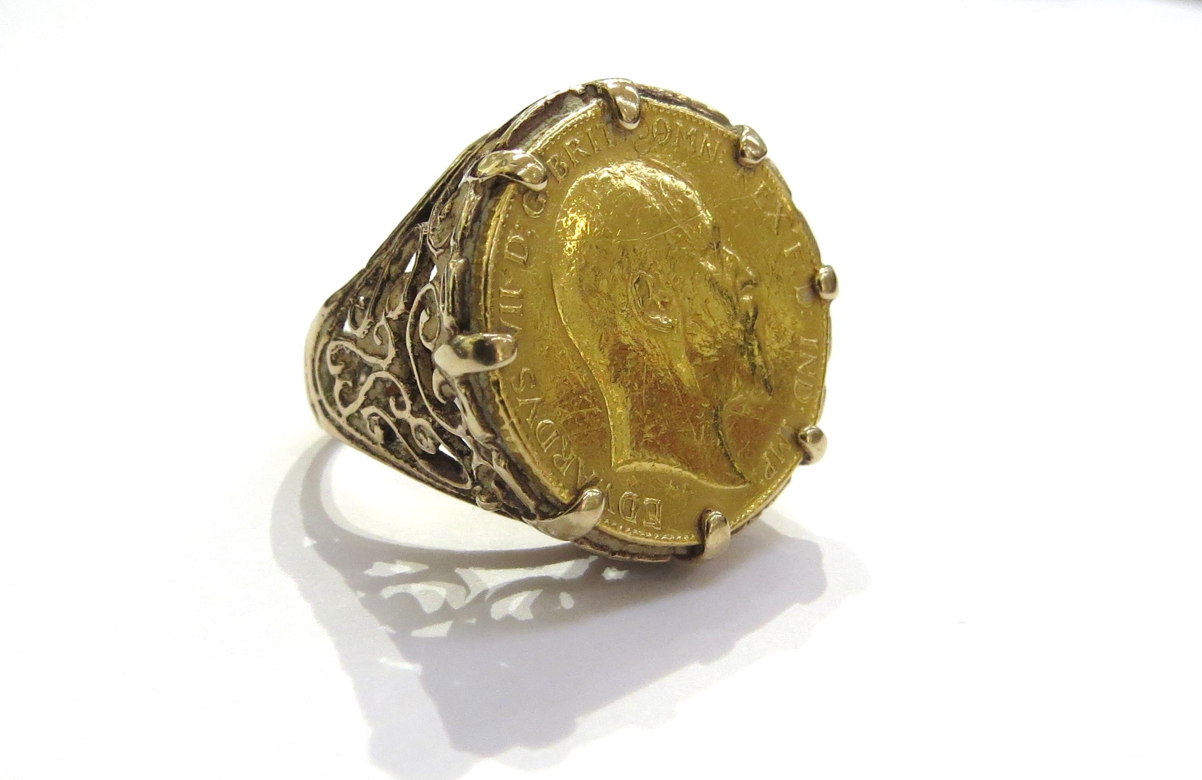 A 1902 Edward III gold half sovereign in 9ct gold ring shank. Size J, 8.4g total