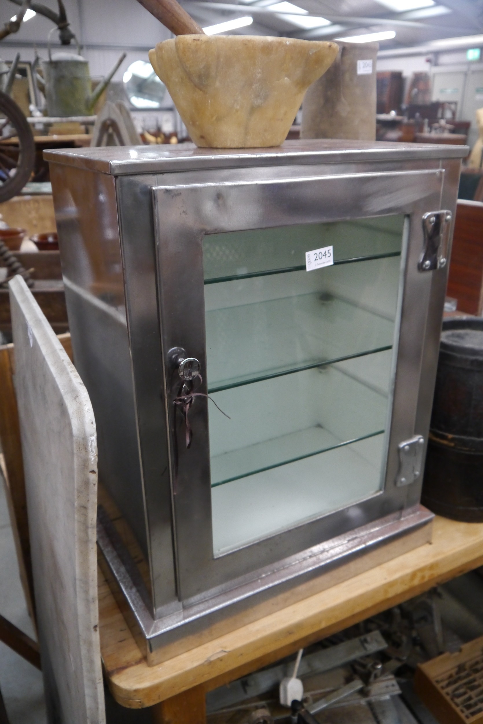 A polished metal dentists cabinet