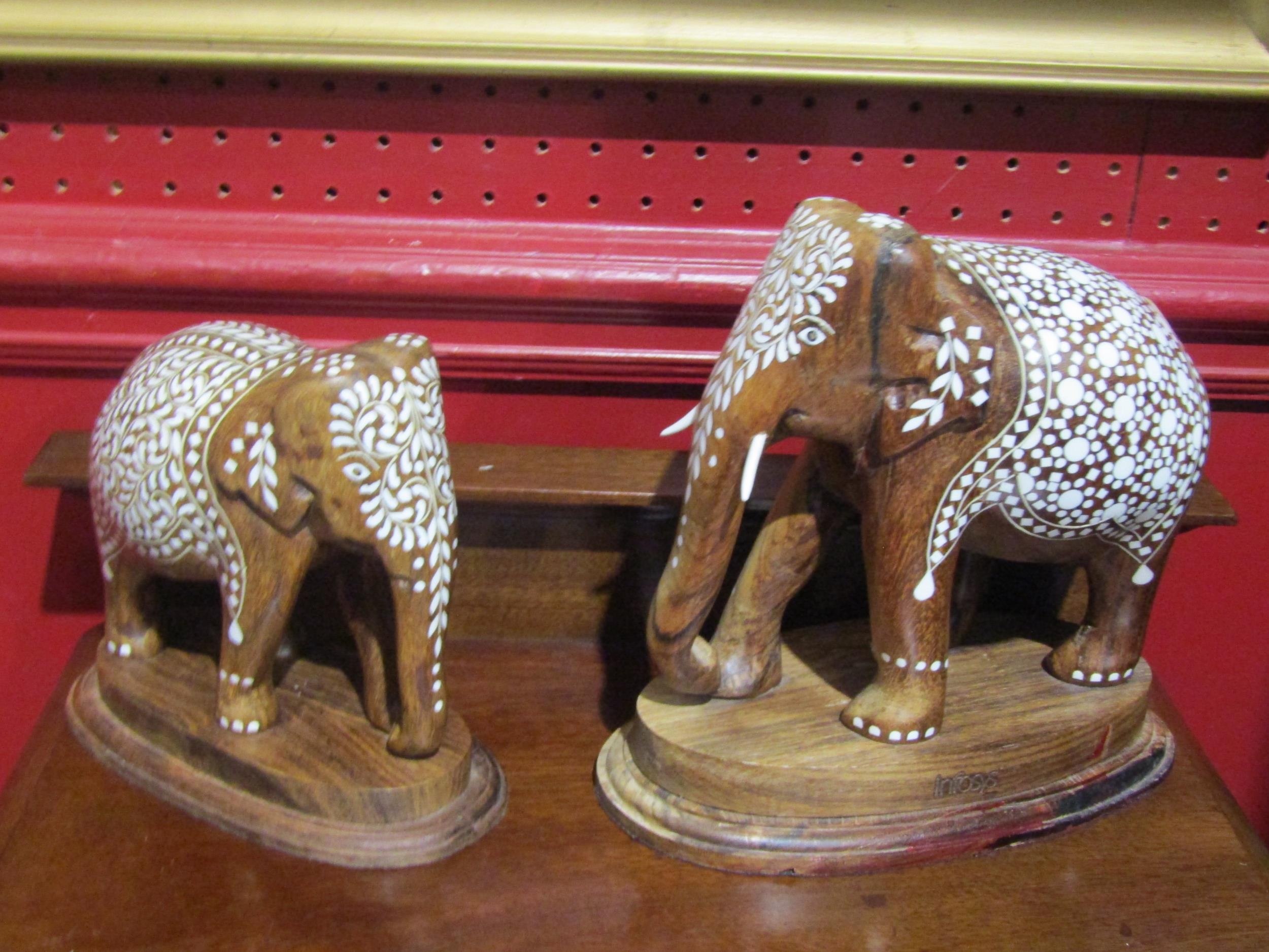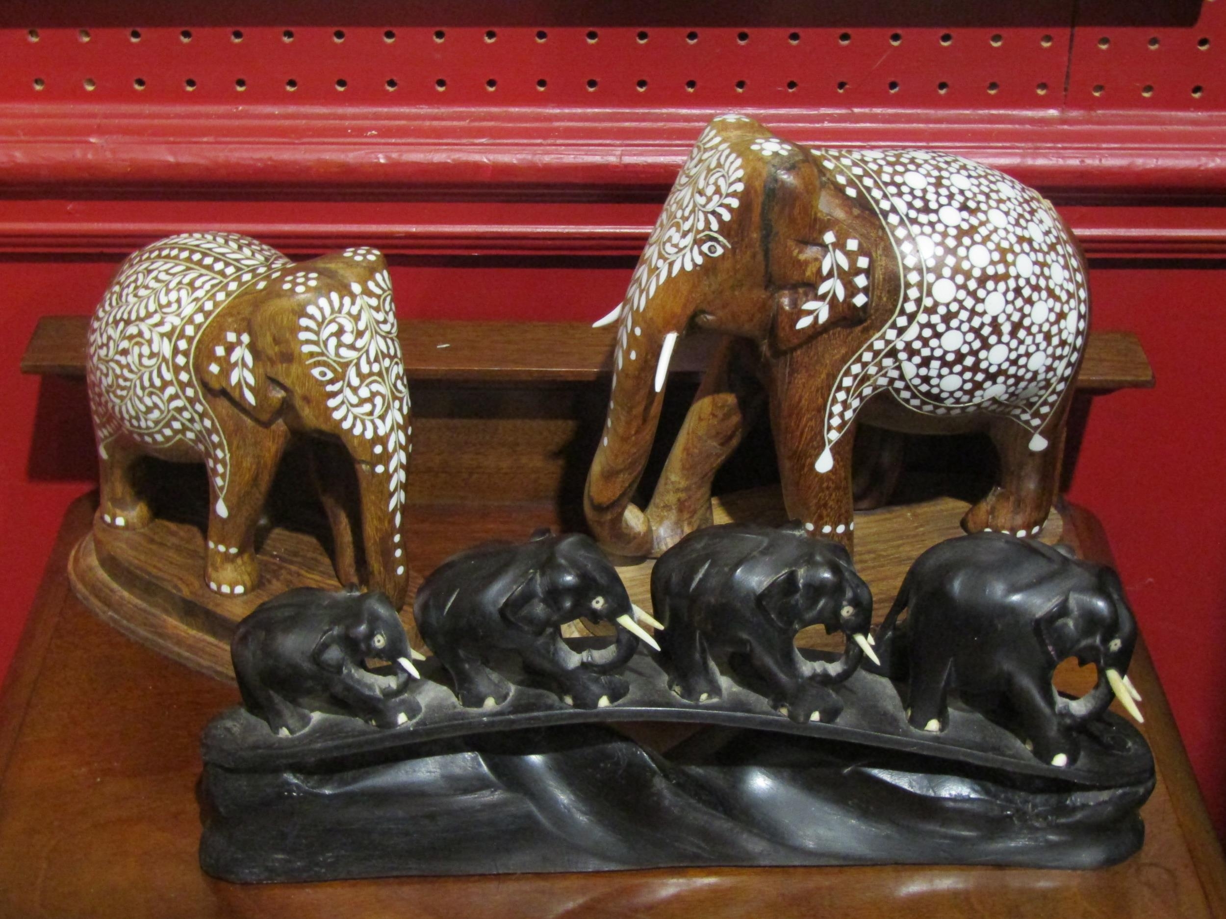 Two inlaid elephant figures, both "Infosys" and an ebonised ...
