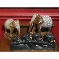 Two inlaid elephant figures, both "Infosys" and an ebonised figure of four elephants (3)