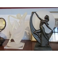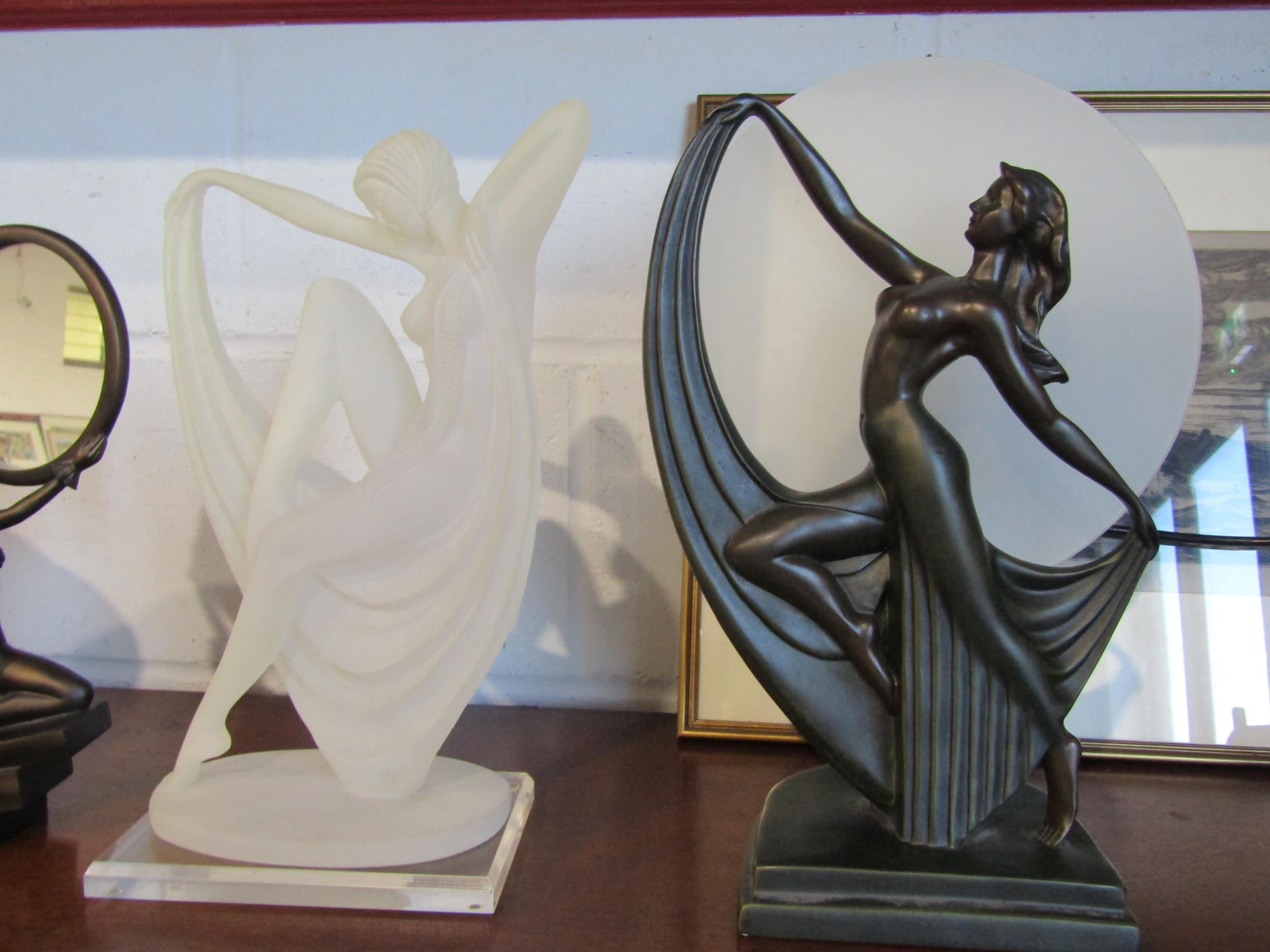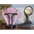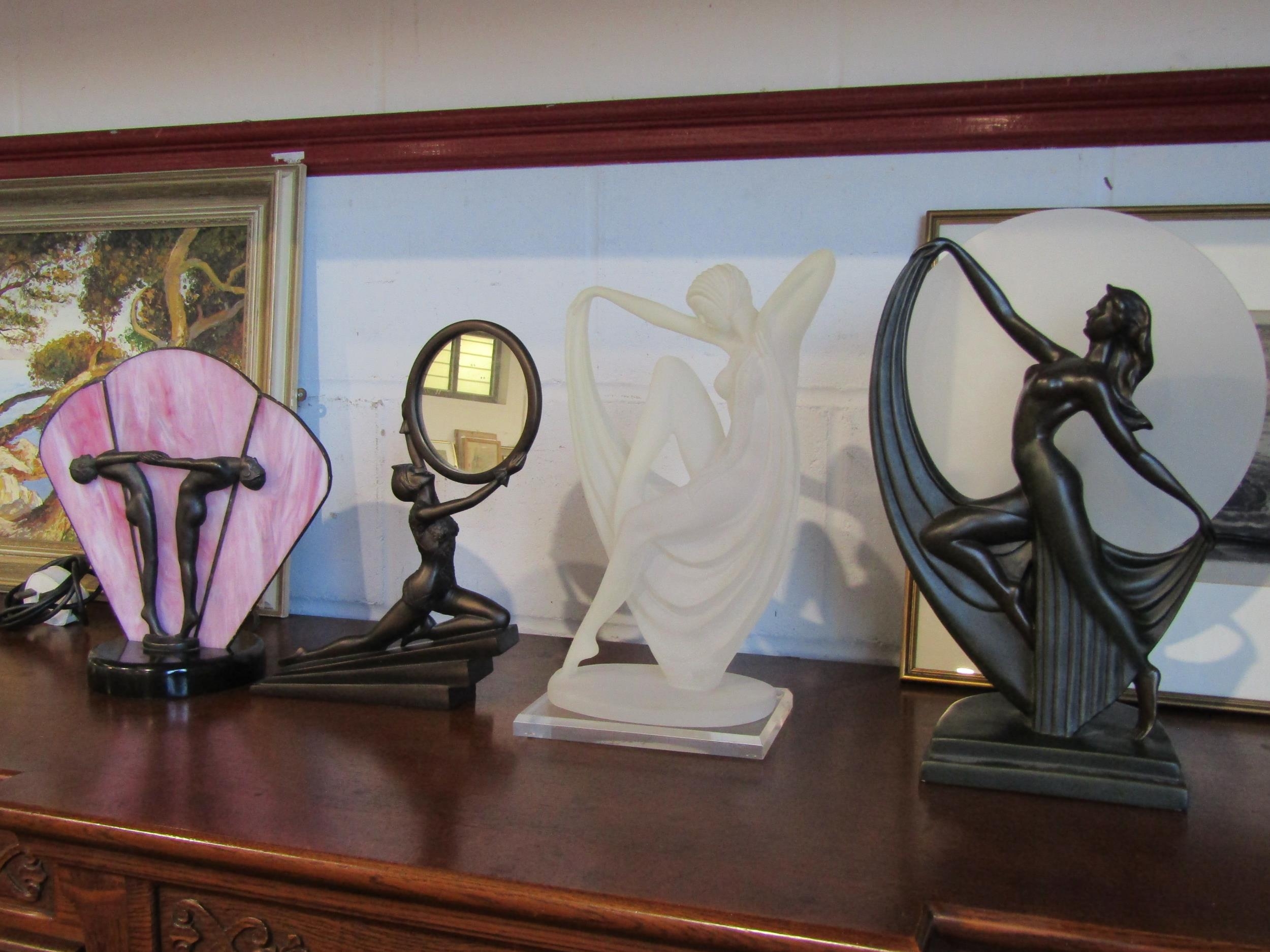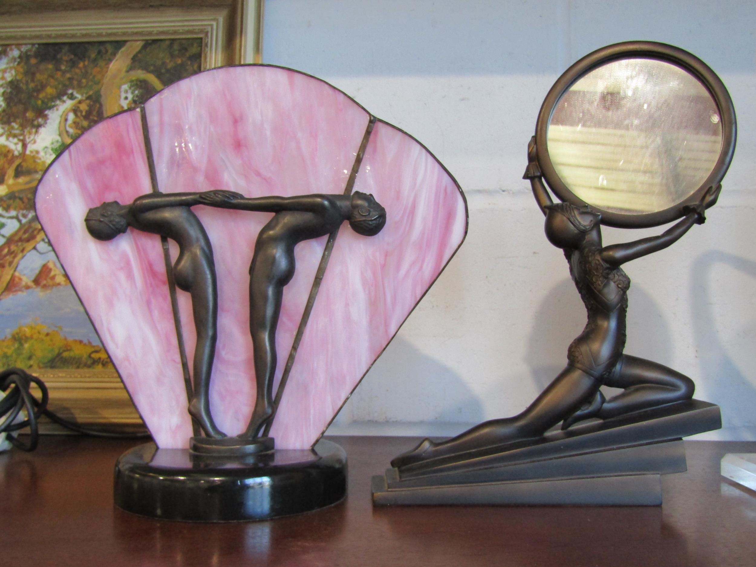Two Art Deco style table lamps, one with a pink marbled shade, and two Art Deco style figures, one holding mirror (4)