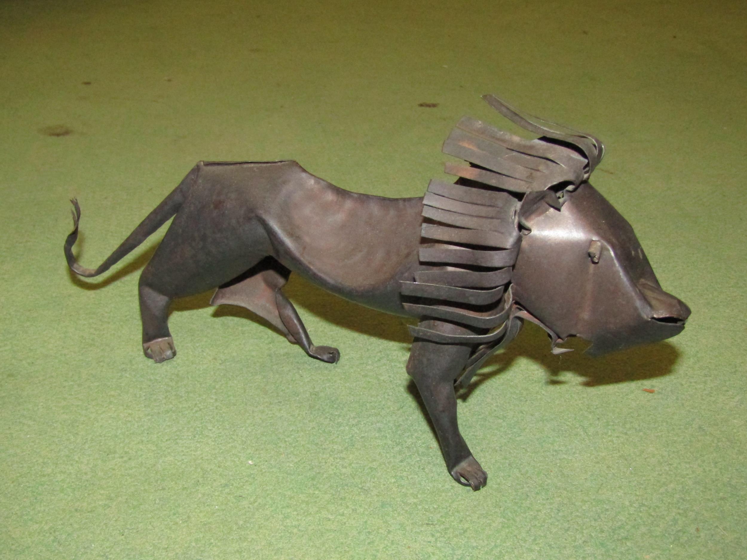 A tin plate model of a lion together with a painted model of...