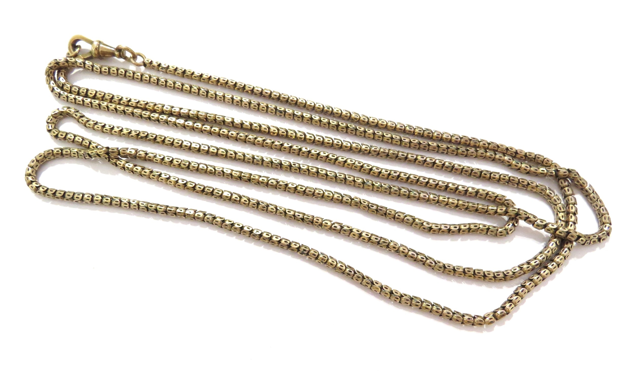 A gold guard chain marked 9c, 134cm long, 32.4g
