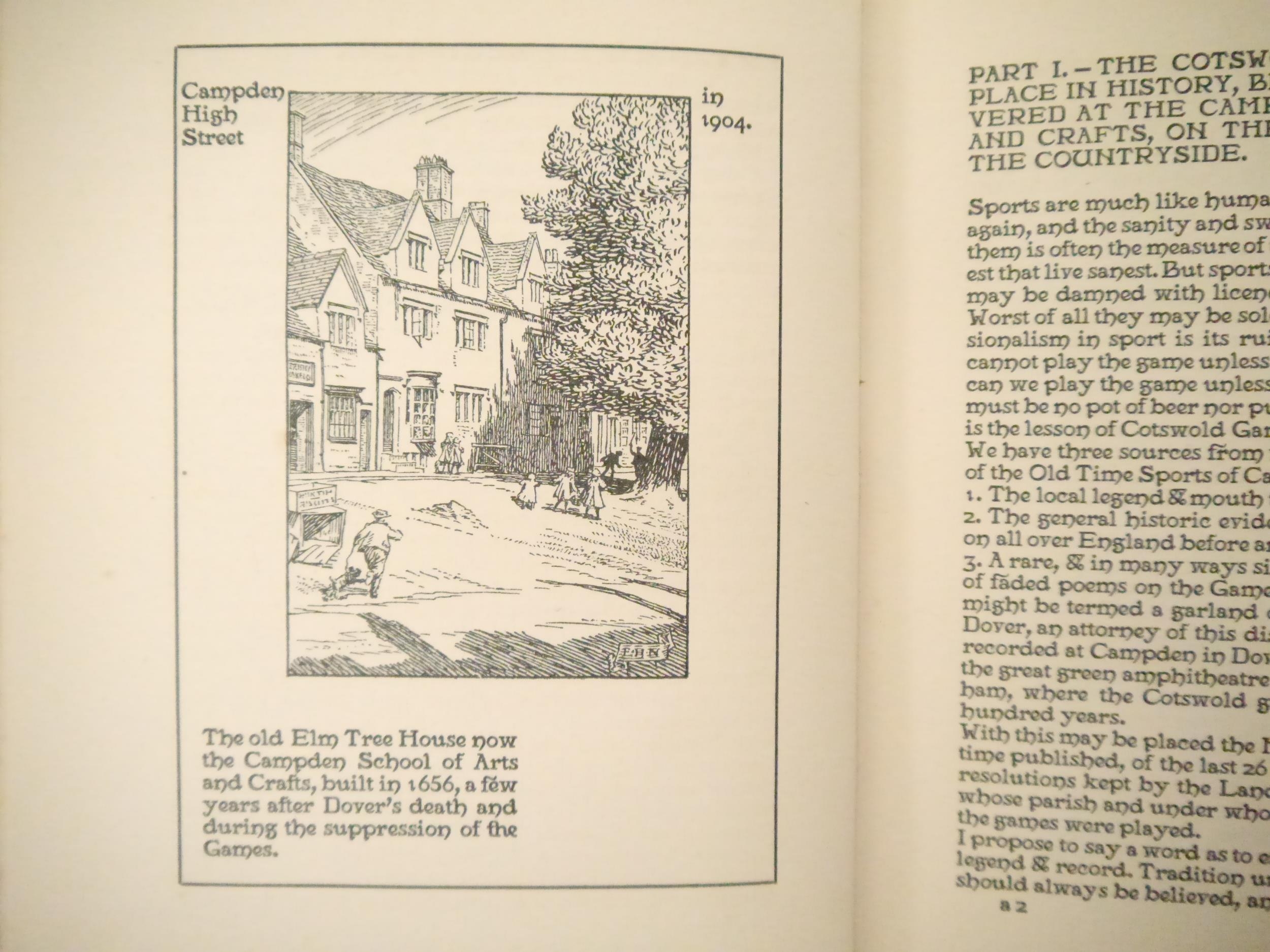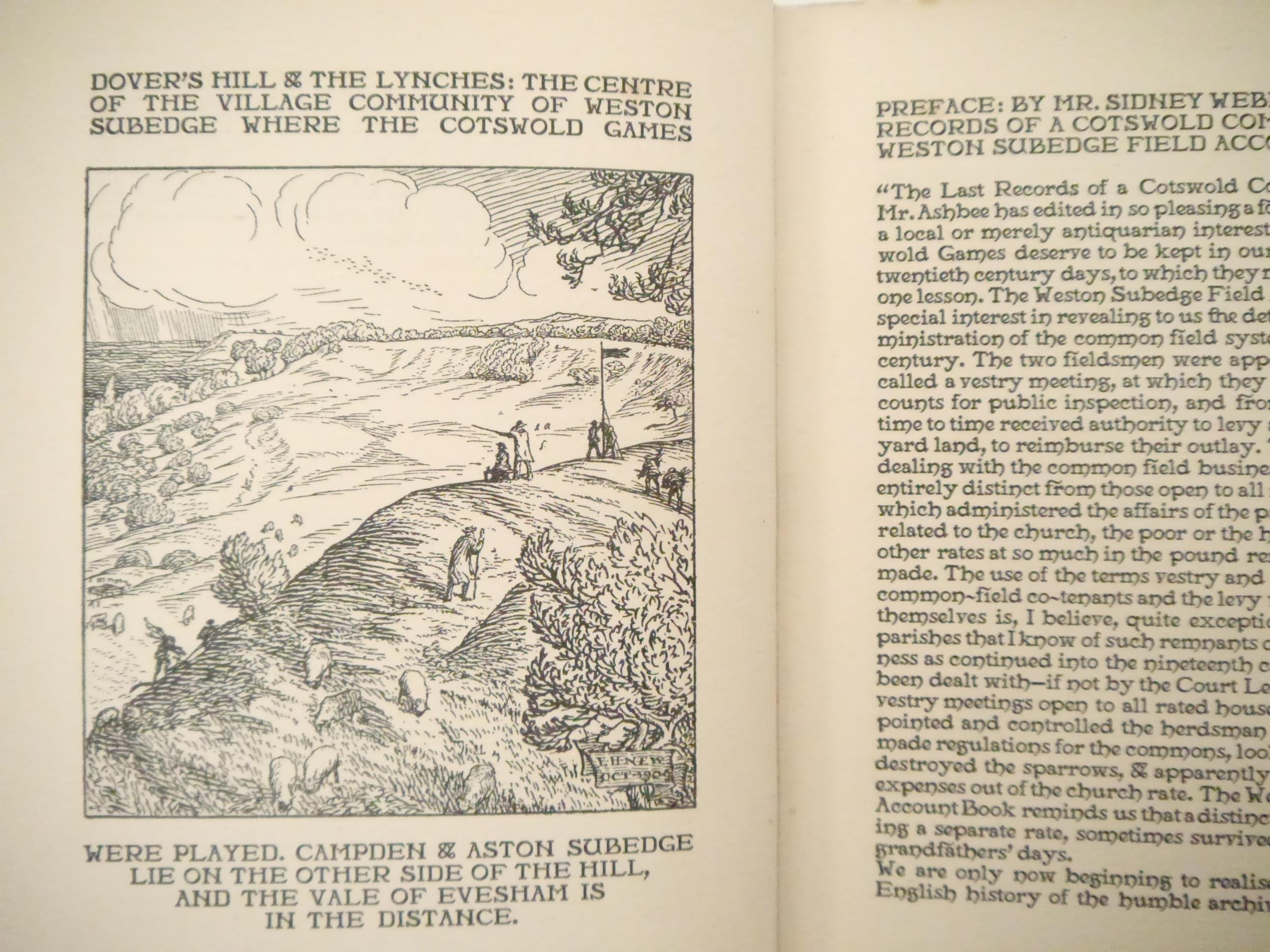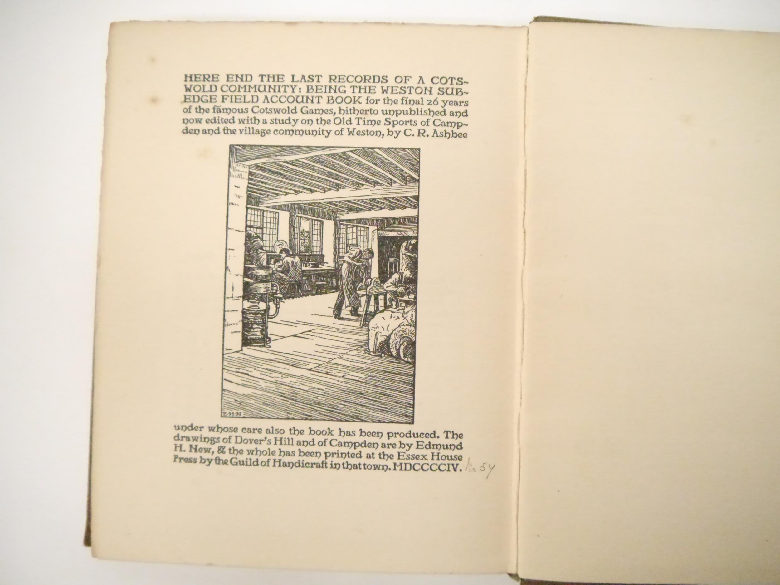 (Essex House Press.) C.R. Ashbee: 'The Last Records of a Cotswold Community: being the Weston Subedge Field account book for the final twenty-six years of the famous Cotswold Games, hitherto unpublished, and now edited with a study on the old time sports of Campden and the village community of Weston by C.R. Ashbee.', Campden, Printed at the Essex House Press by the Guild of Handicraft, 1904, limited edition, pen & ink numbered 57 to colophon (of 150 copies on "ordinary paper" bound in boards), 7 illustrations of Dover's Hill, Campden and the Guild of Handicraft and a double page map after drawings by Edmund H. New, [4],lvi,[4],59,[1]pp, small 4to (22 x 17cm), original paper covered boards, printed paper label to spine. A scarce account intended to perserve the story of this Cotswold community and its traditions. Ashbee recounts the final twenty-six years of the famous Cotswold games and old time sports of Campden and Weston. The Cotswold Olimpick games is an annual celebration of games and sports which began in 1612 and ran until 1852. The games were subsequently revived in 1963 and continue to this day