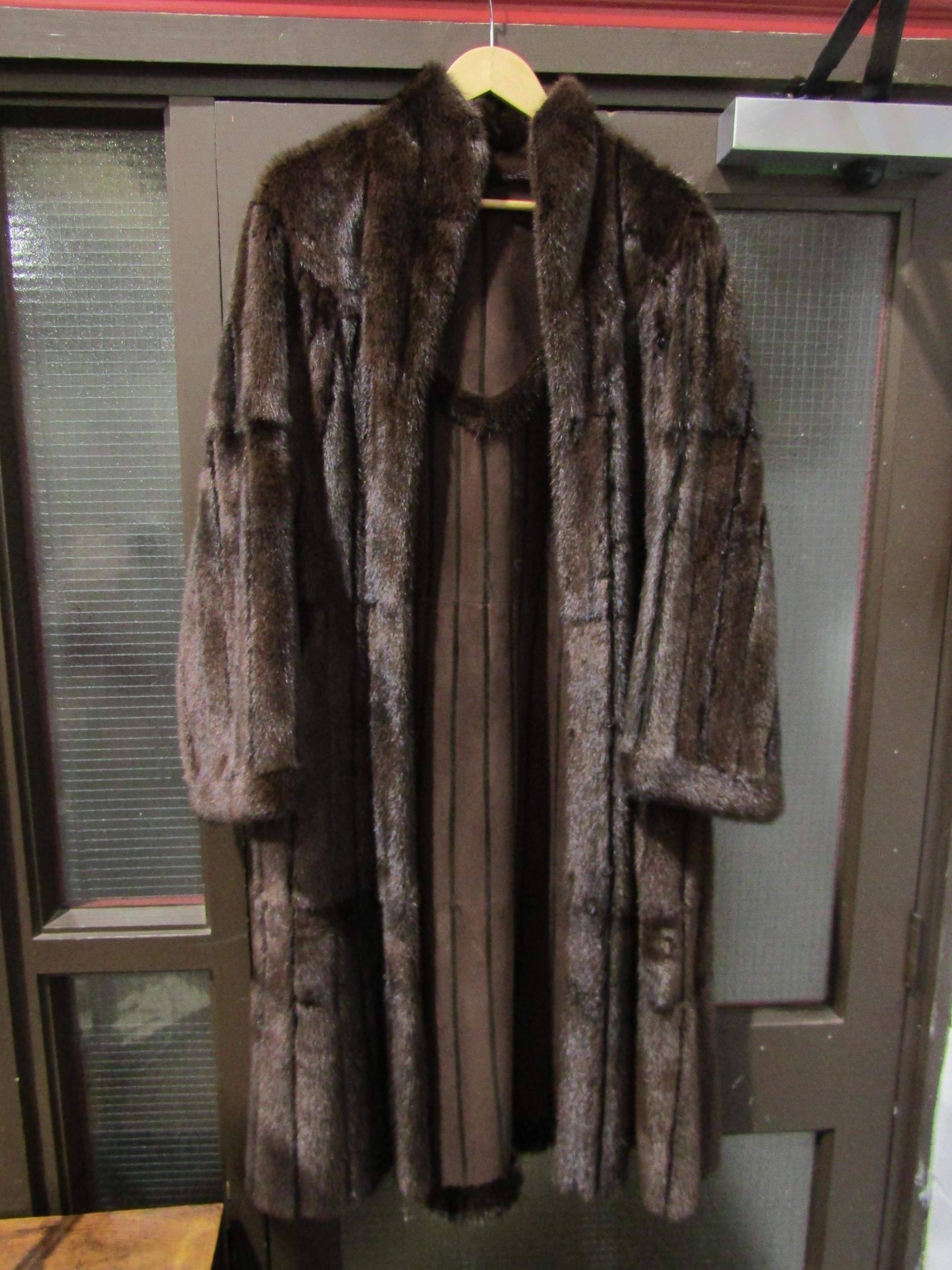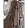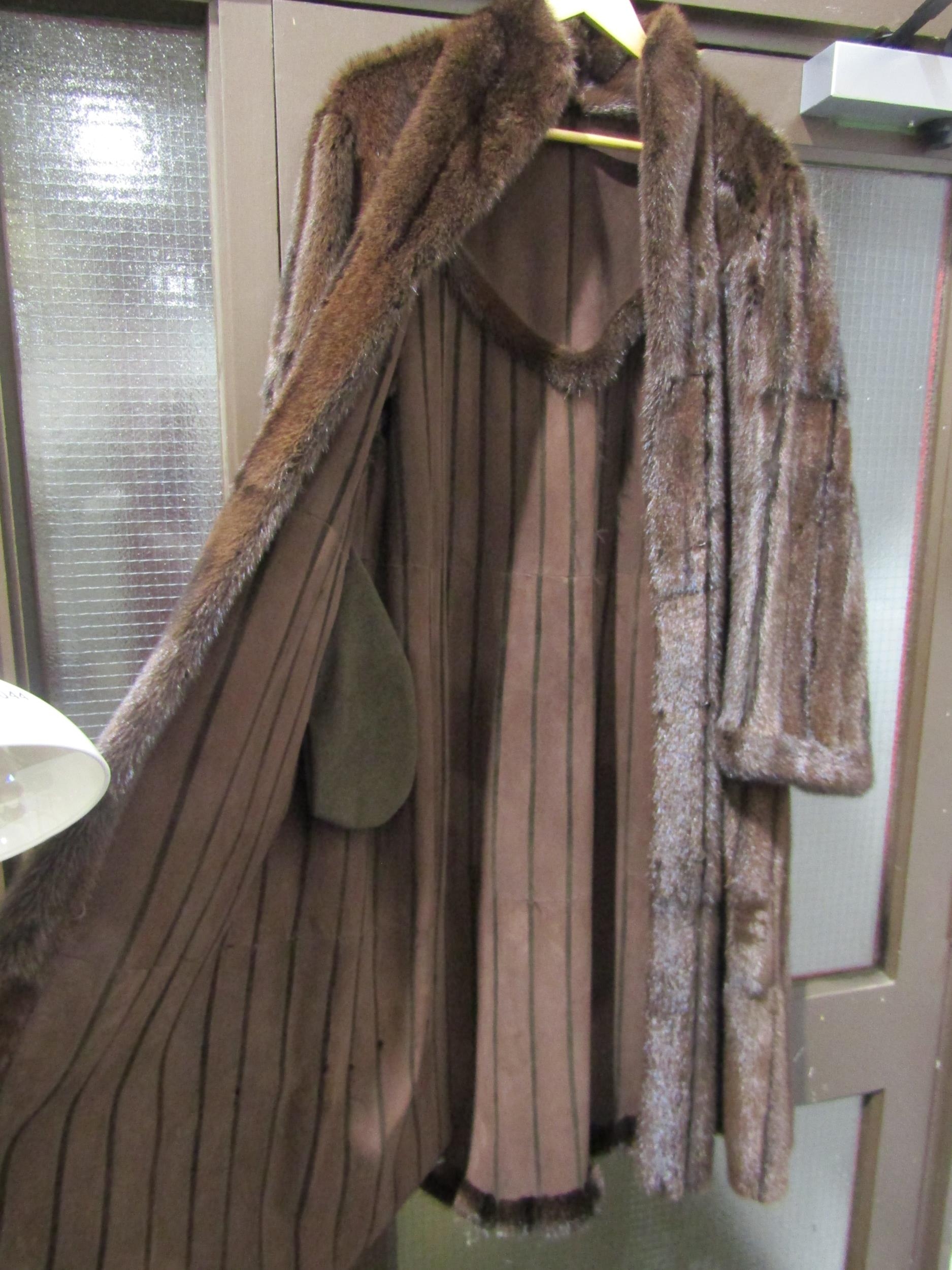 A mid-brown mink full length coat with toning suede inserts
