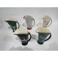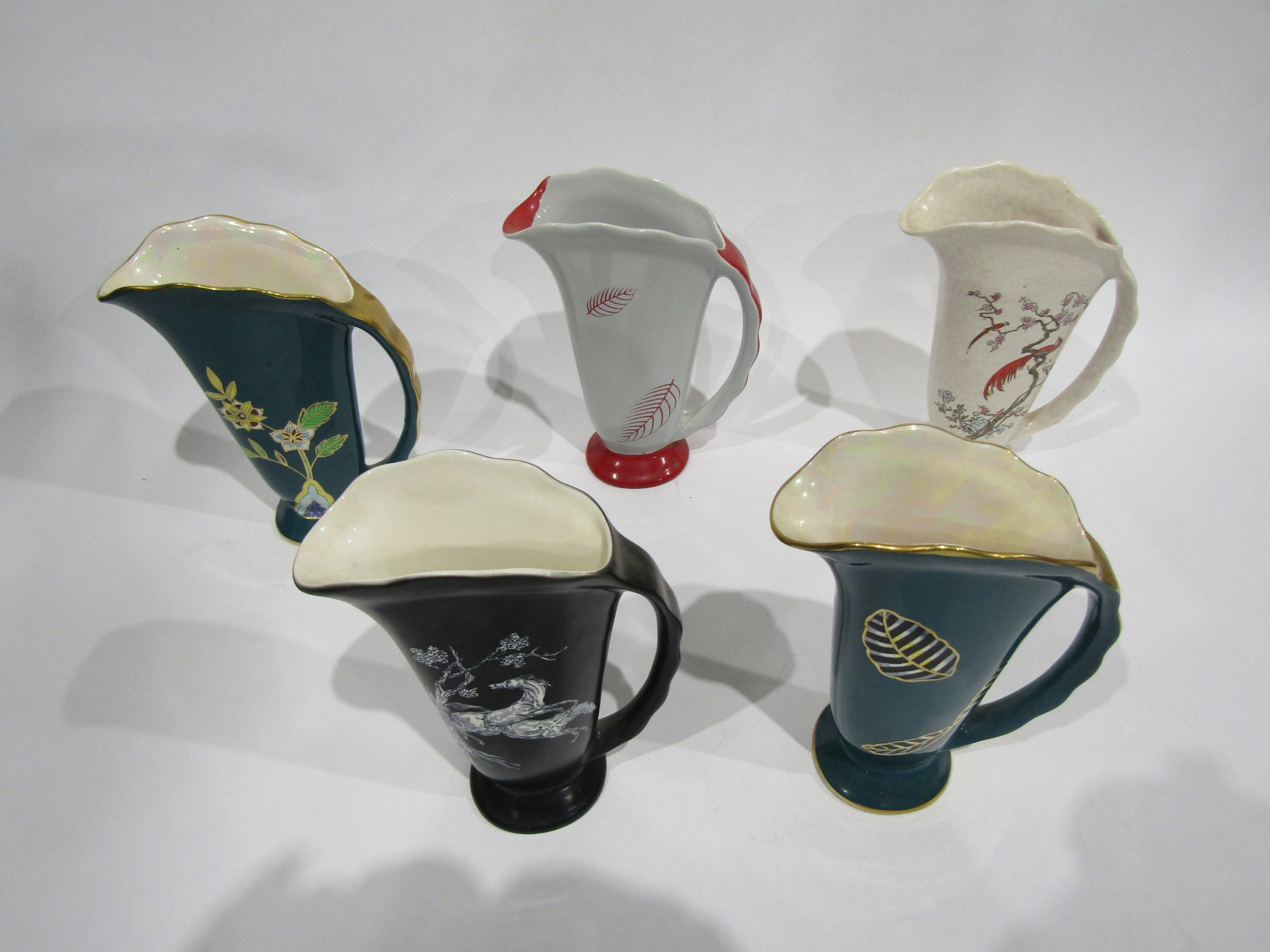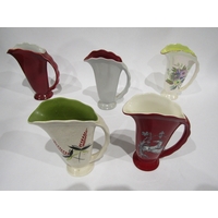 Five Crown Devon A550 jugs, red bird, Pegasus on black metallic flowers on green, red leaves on grey and gold leaves on green