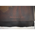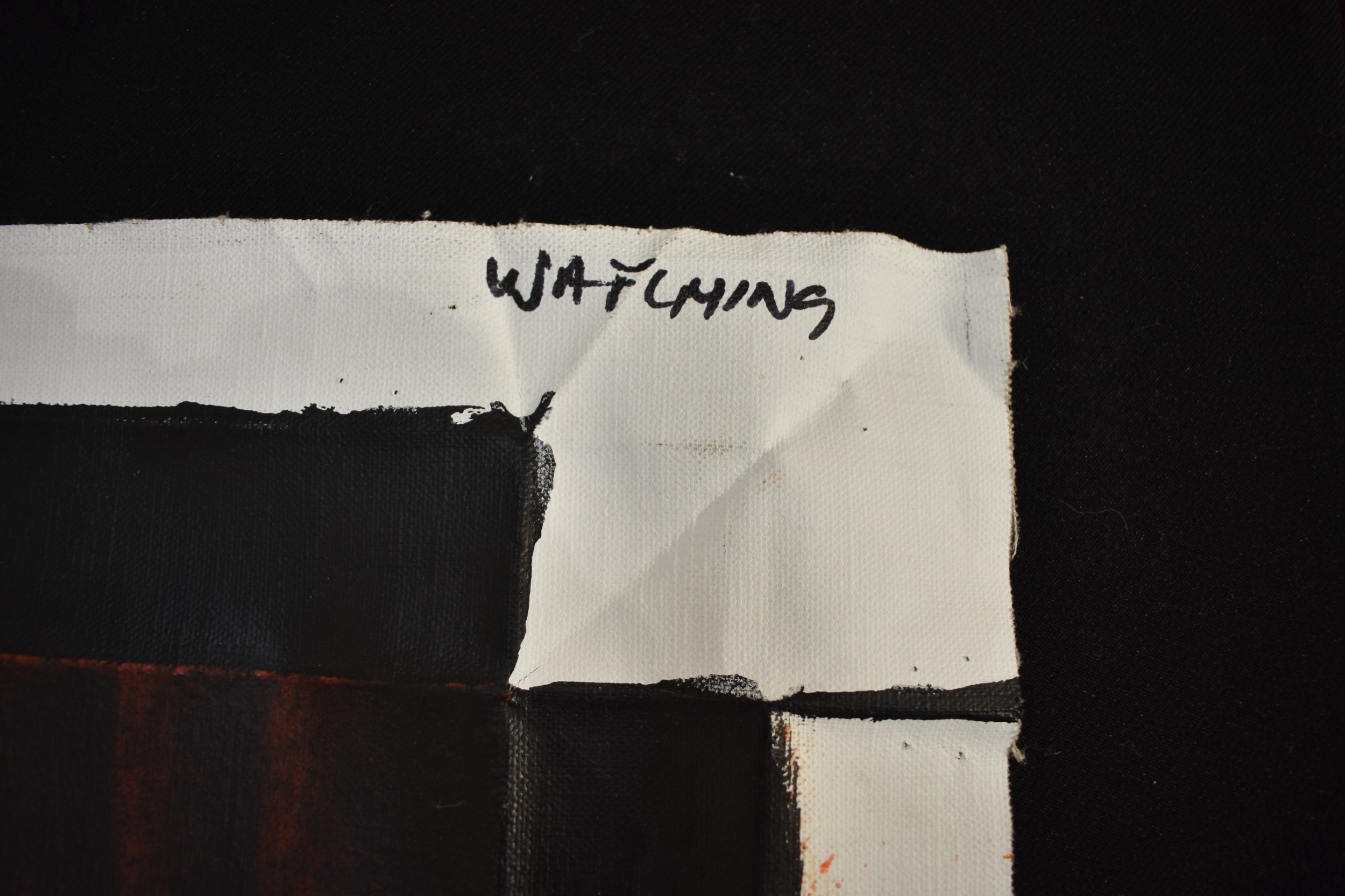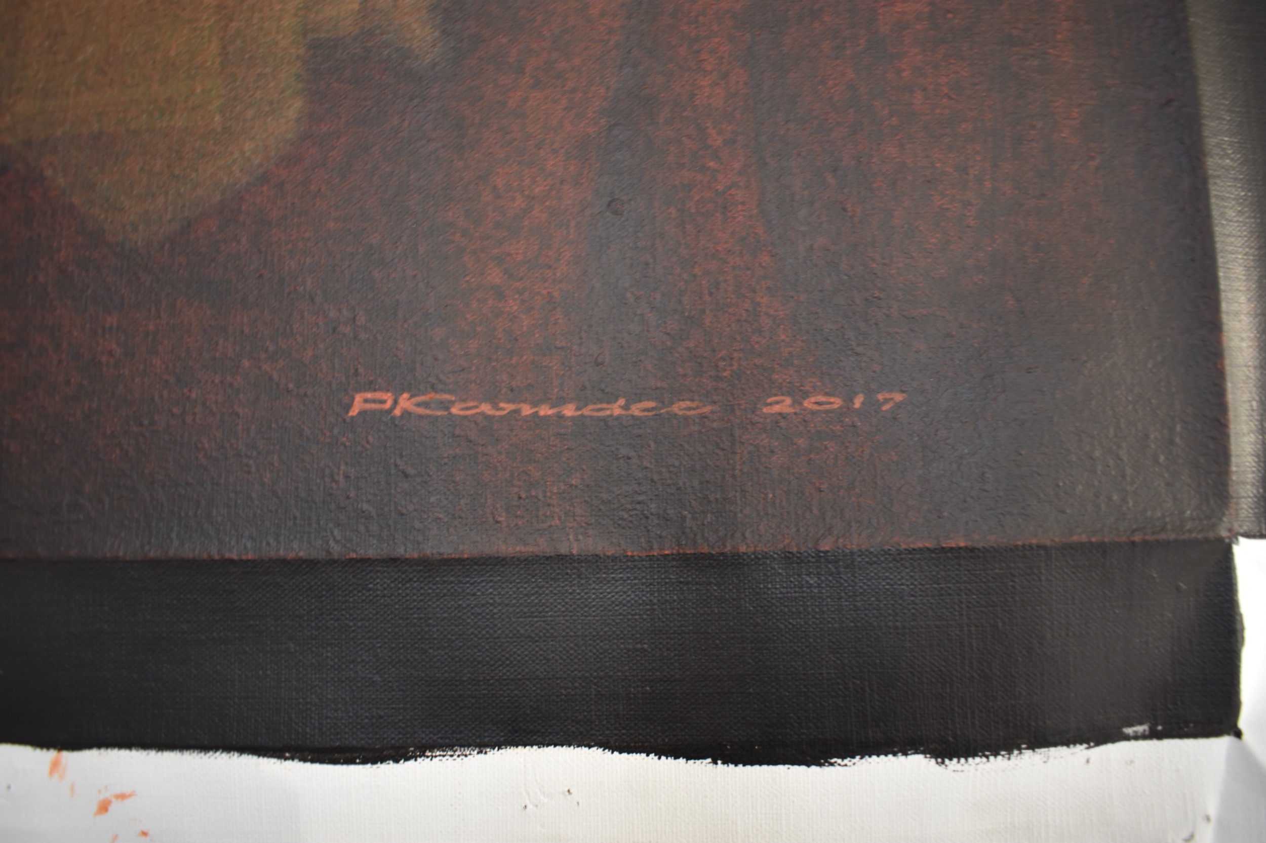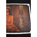 PAIROJ KARNDEE Thai Contemporary Artist: Female portrait, titled " Watching " depicting a man in the shadows looking over to semi clad female, acrylic on canvas. The artist has been influenced by the mysterious Apsaras - the celestial maidens of ancient Asian culture depicted in the galleries of Cambodia's Angkor Wat. His techniques painstakingly recreate the stone textures of those images with a time-consuming rendering of acrylic on linen canvas. His figures show a notable range of emotions. Signed and dated, 2017, image size 89cm x 109cm