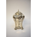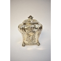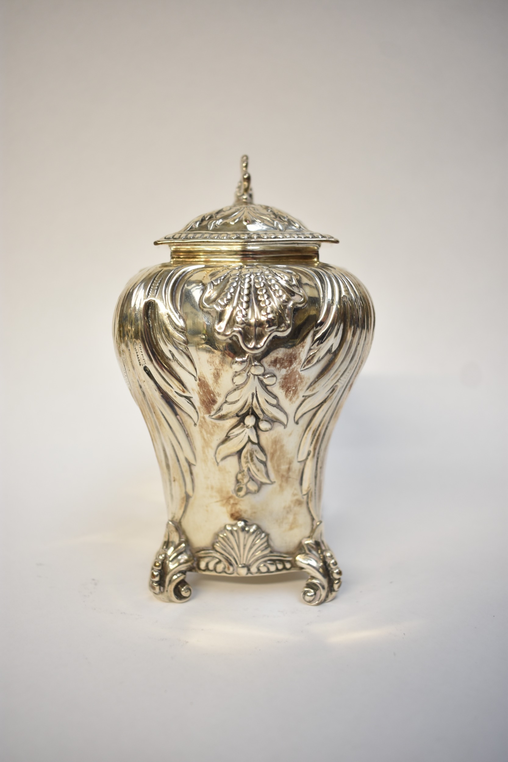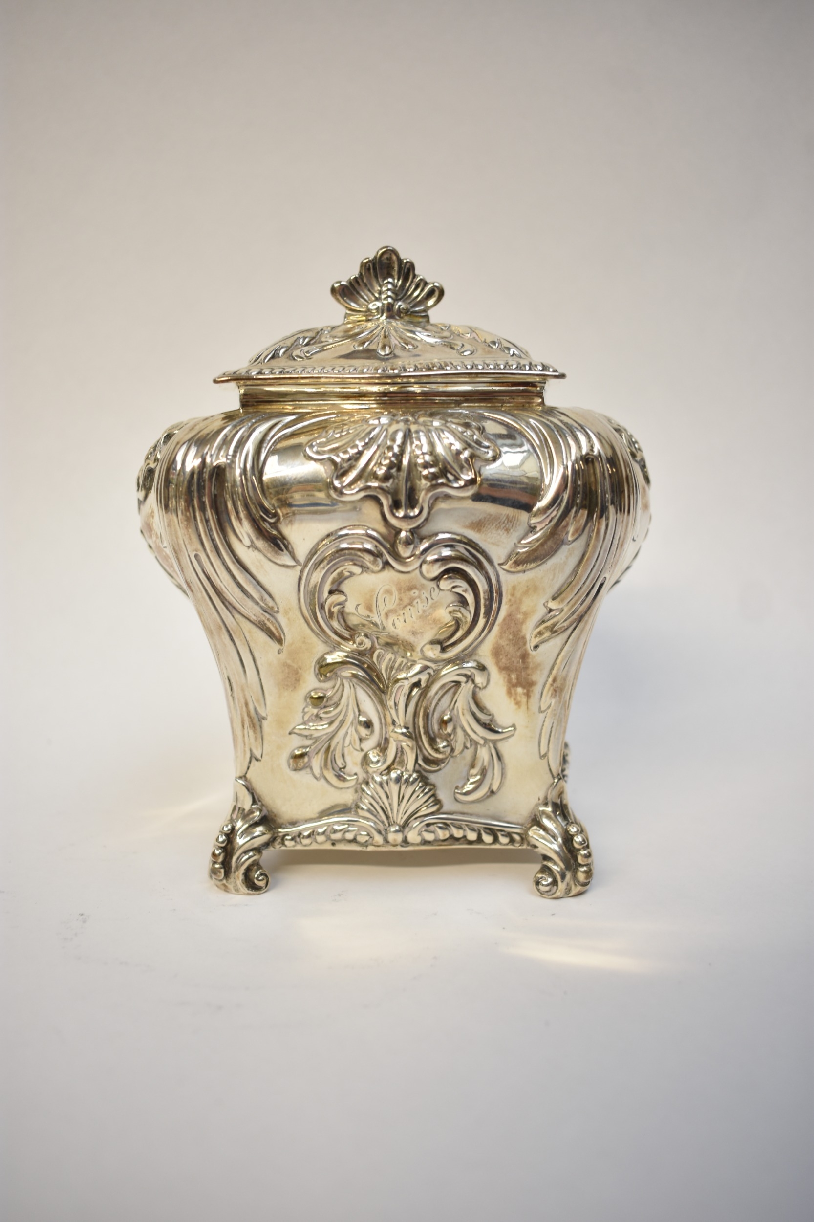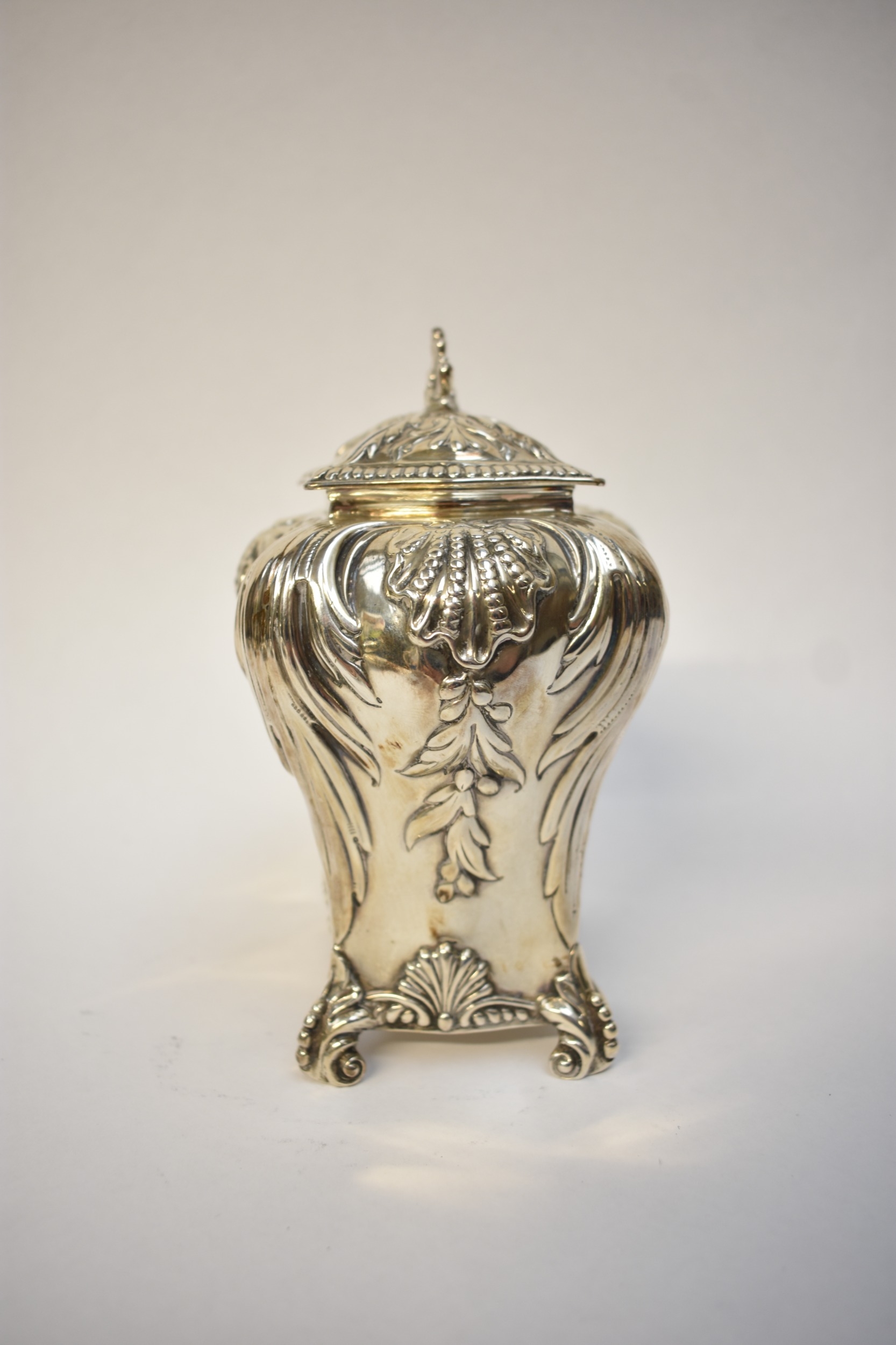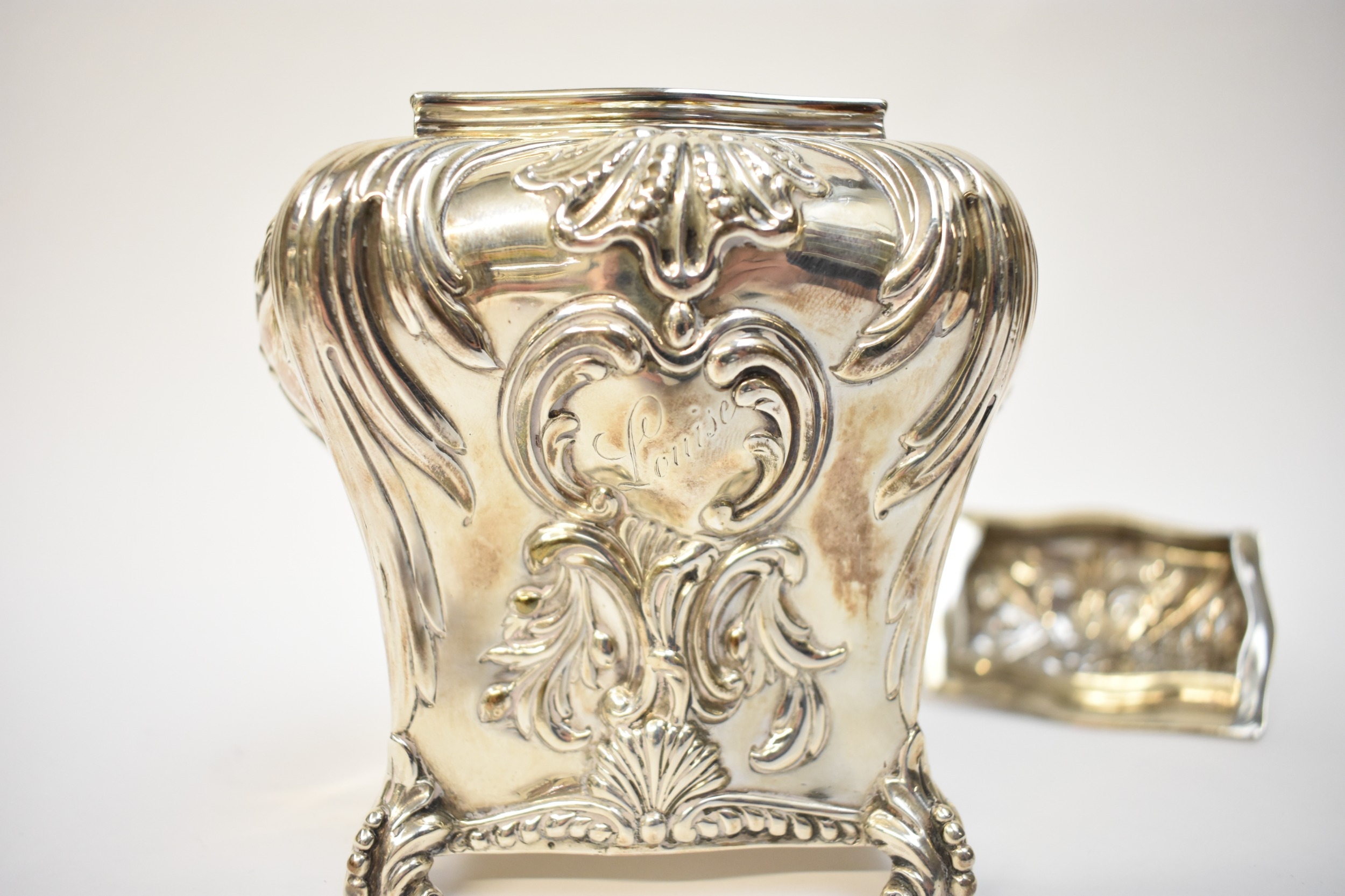 A George Fox Victorian silver tea canister, repoussé decoration of foliate swags over four scrolled feet, central cartouche engraved "Louise", London 1888, maker's mark heavily rubbed to the body, 13.5cm tall. 353g