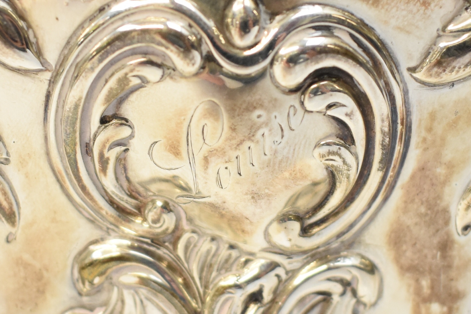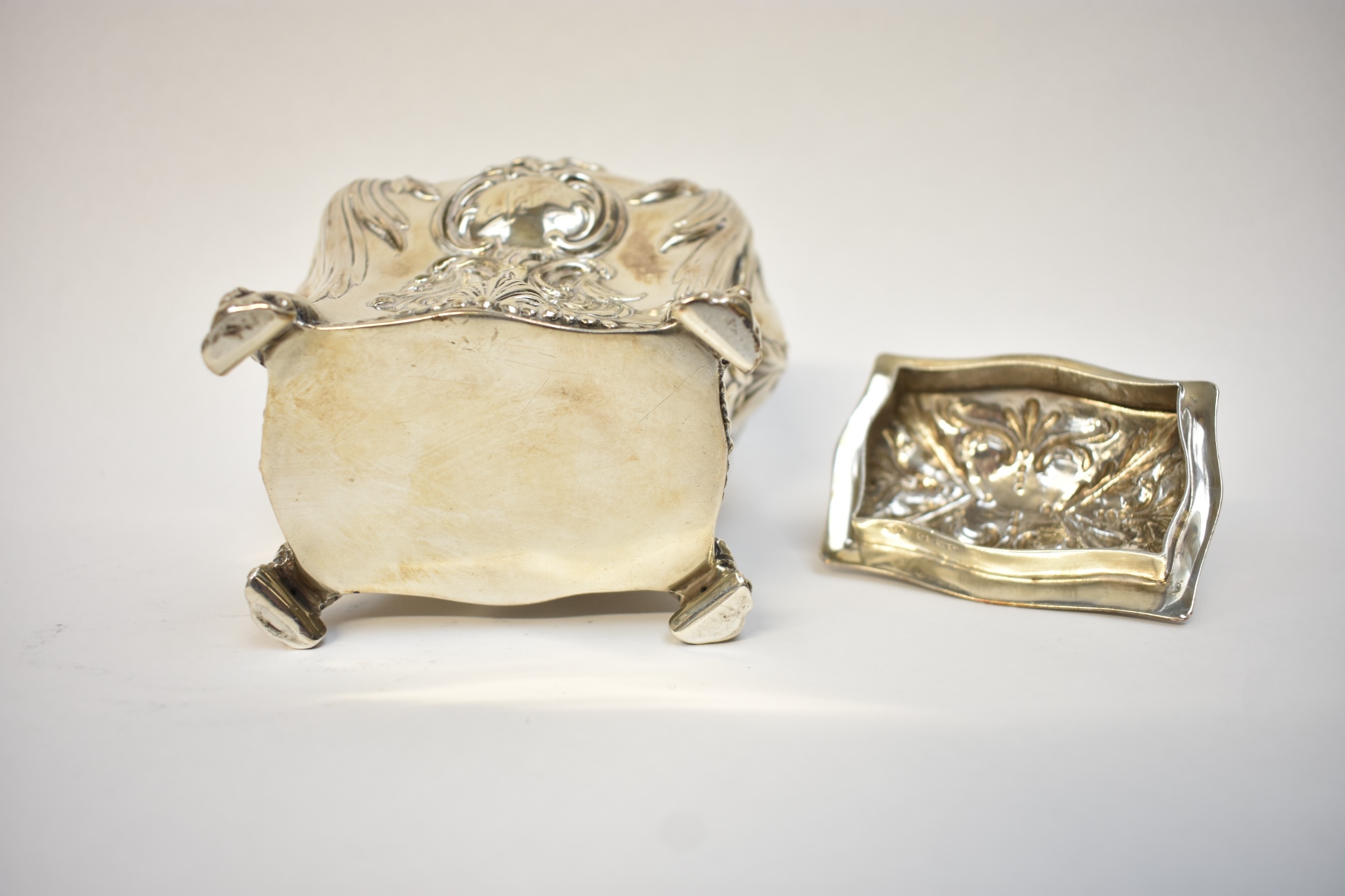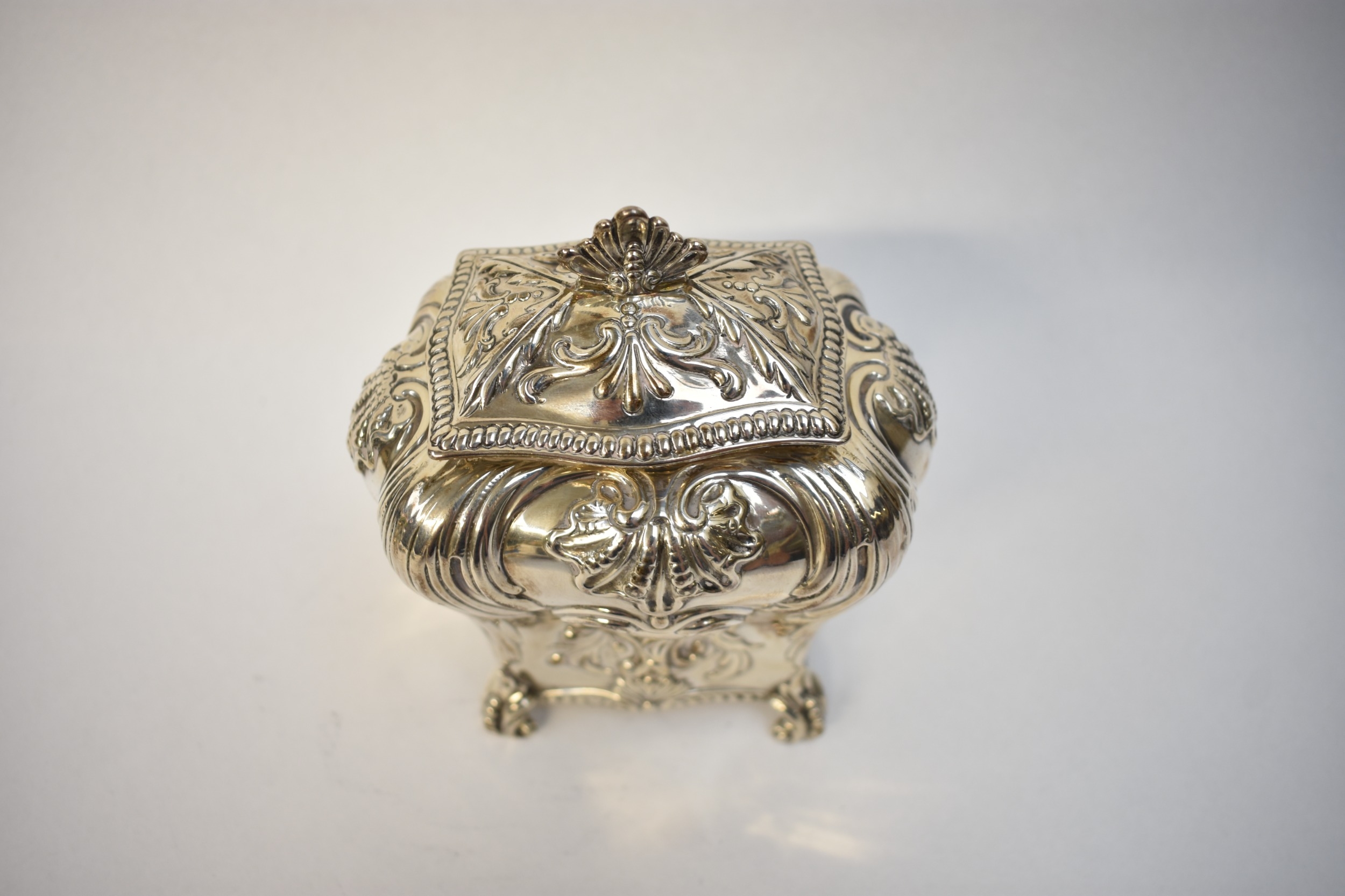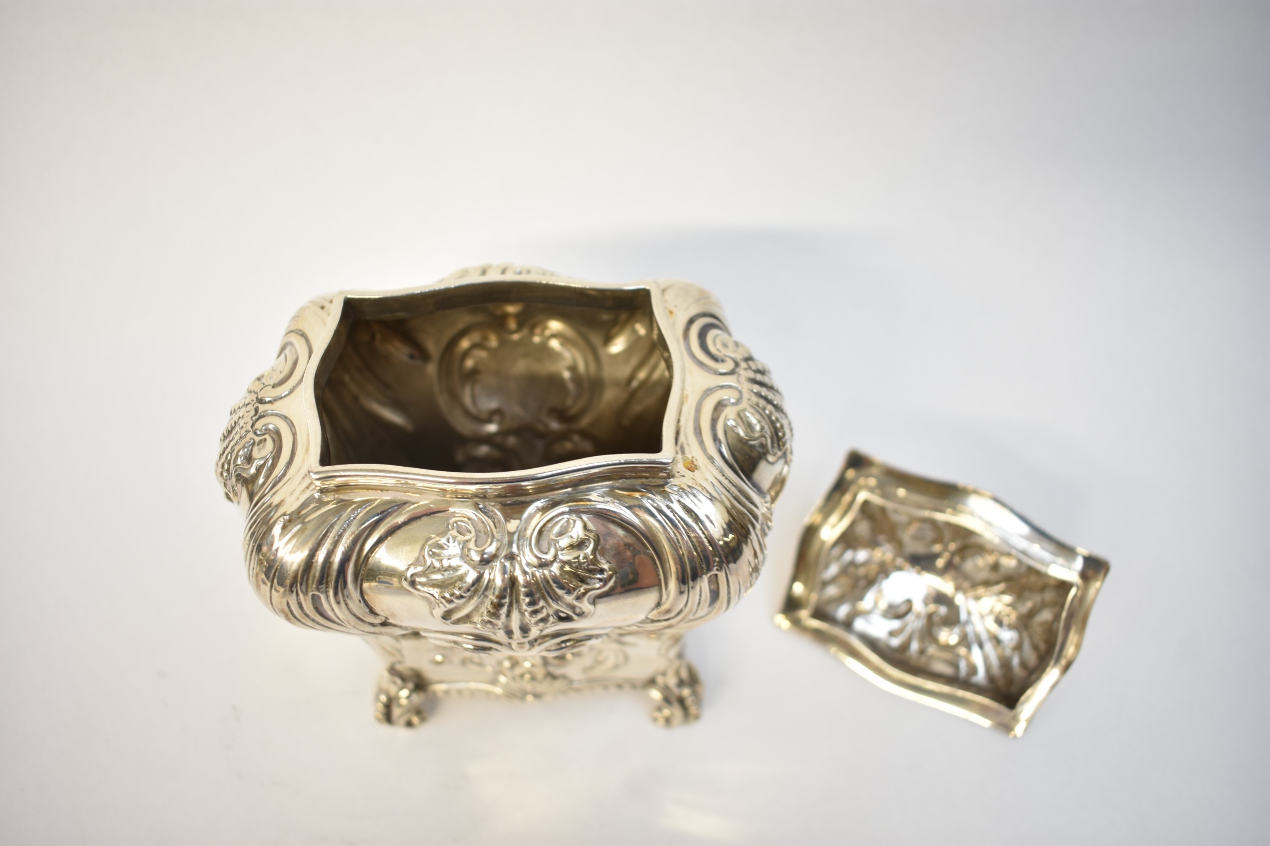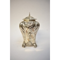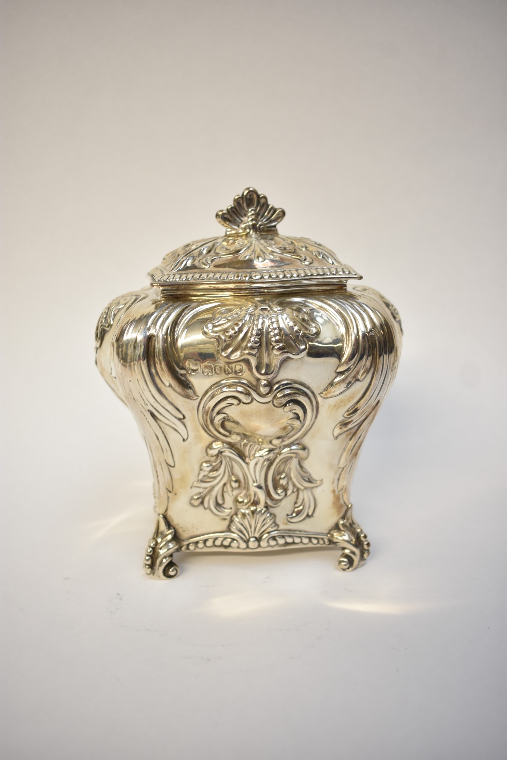 A George Fox Victorian silver tea canister, repoussé decoration of foliate swags over four scrolled feet, central cartouche engraved "Louise", London 1888, maker's mark heavily rubbed to the body, 13.5cm tall. 353g