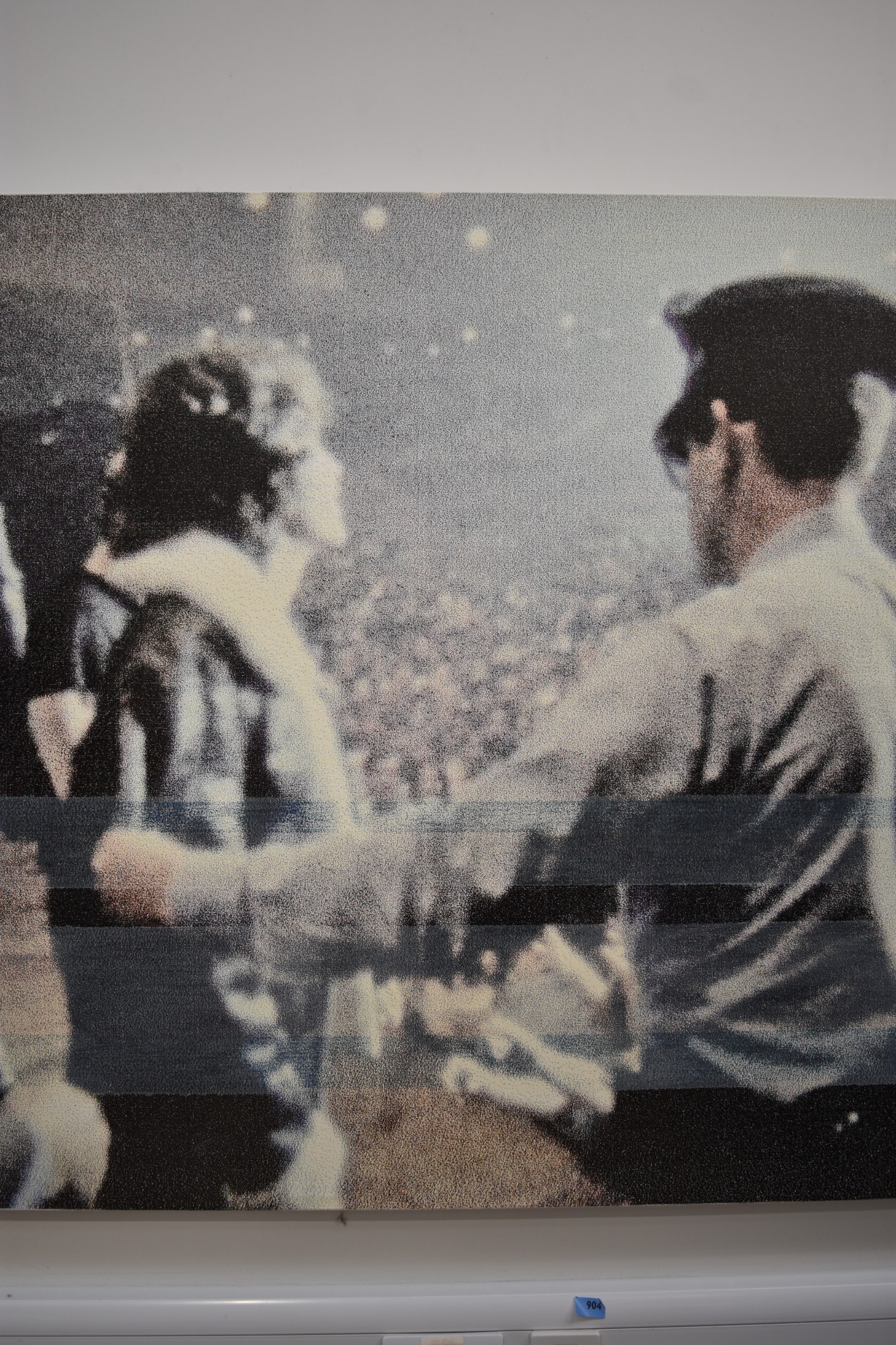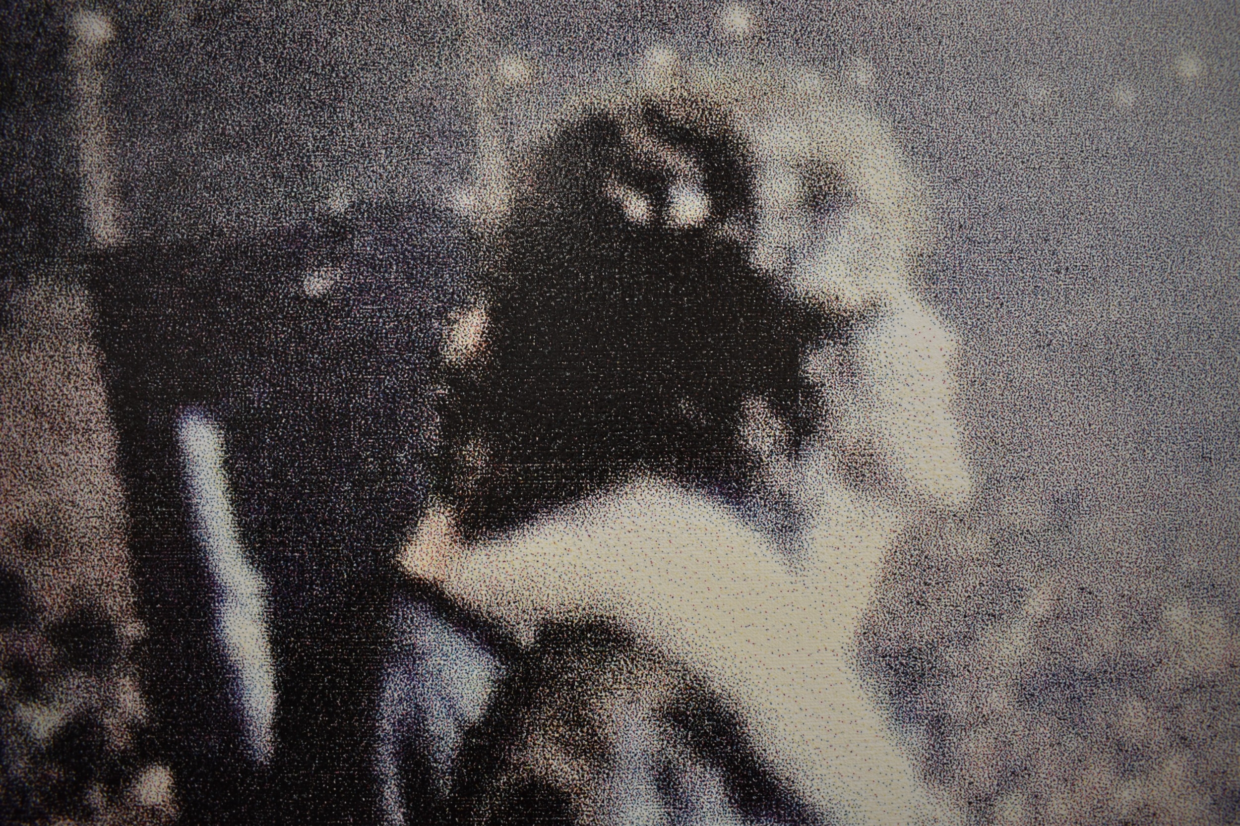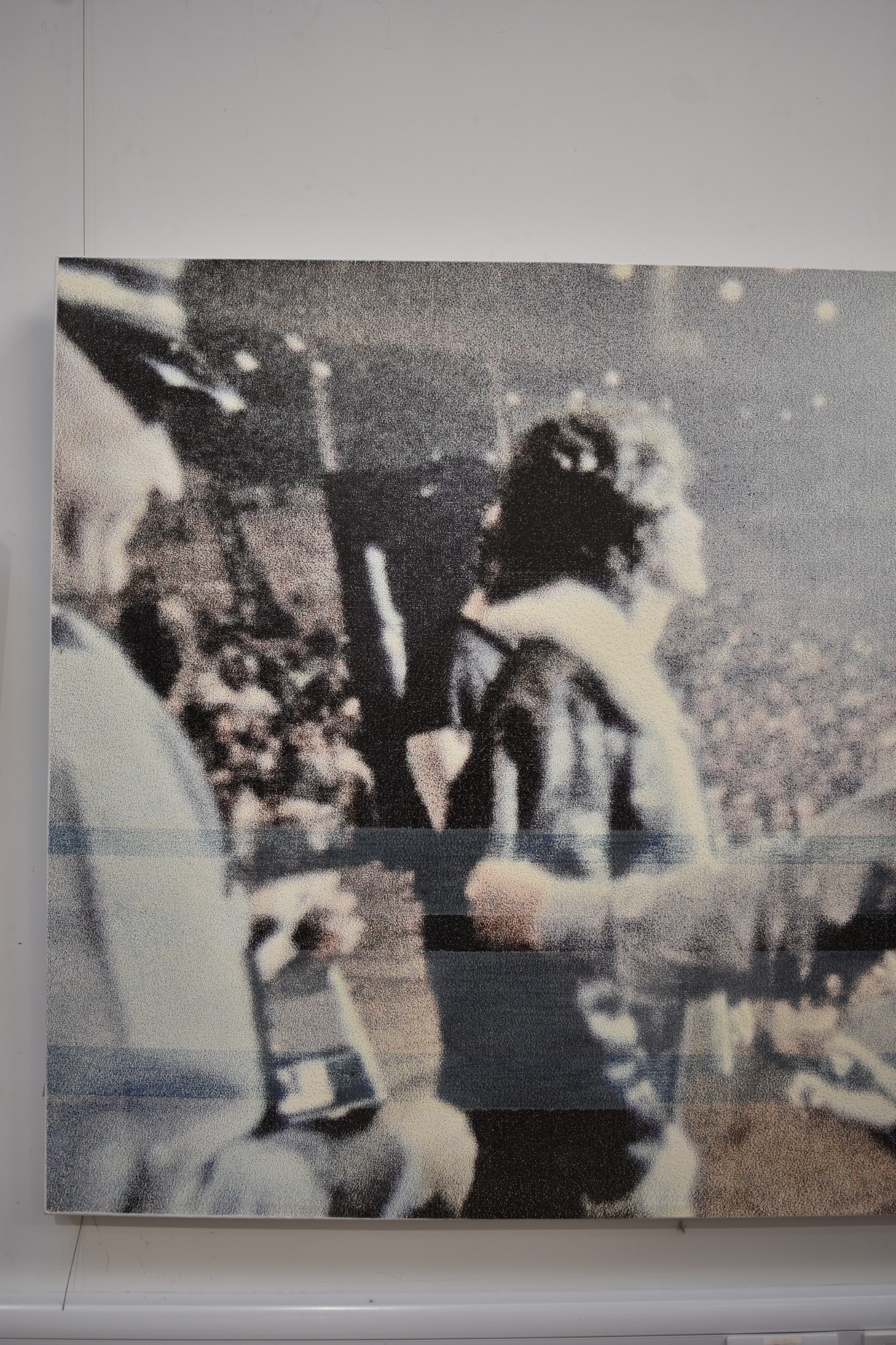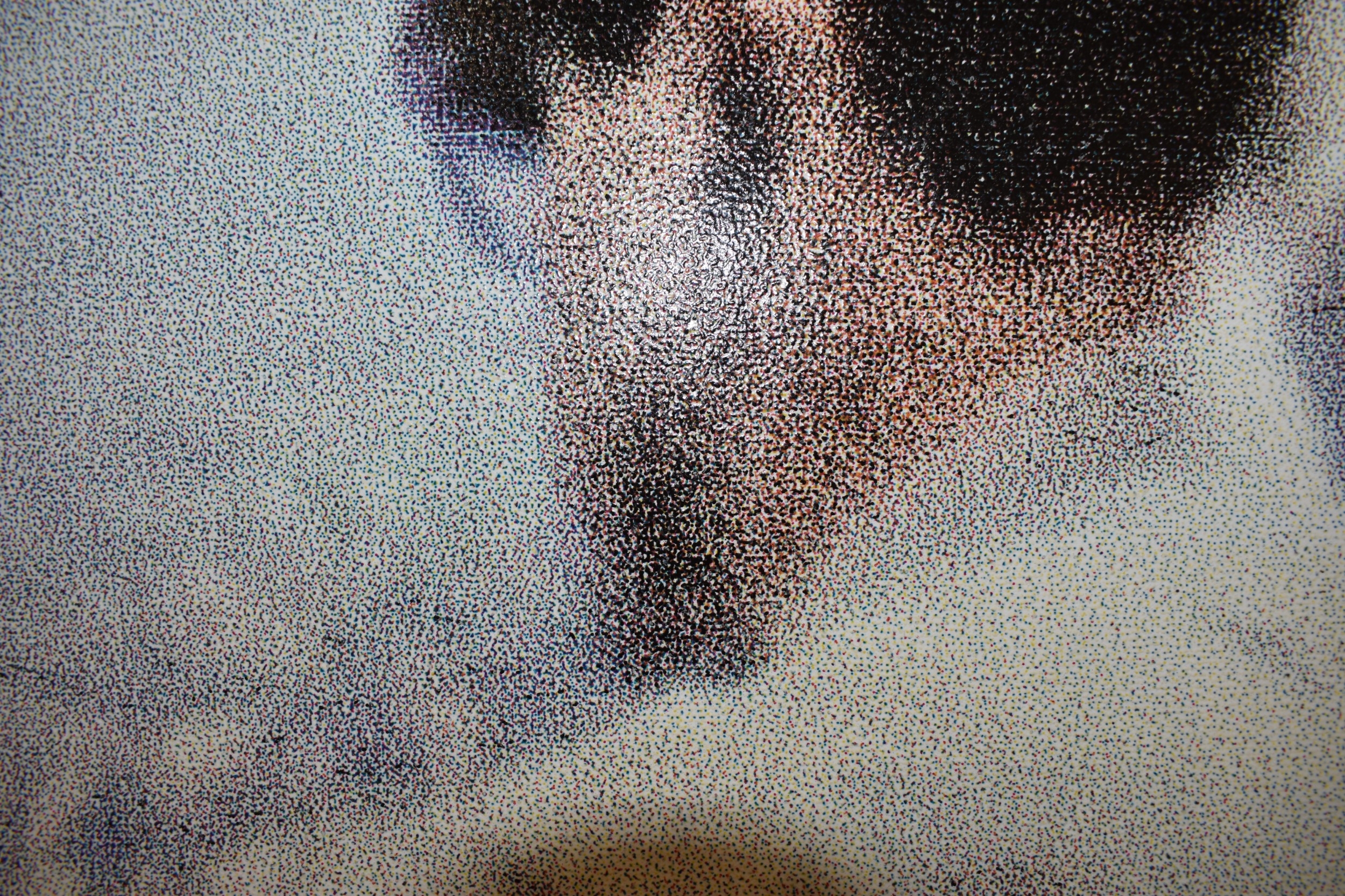 DOUGLAS STEWART (b.1960) US-based contemporary artist: "Morrison" from the "As seen on TV" series of oil paintings painted in the technique of pointillism. The artists image which is distorted like a old TV scene evokes a feeling of disquiet or apprehension partly produced by the artists natural tremor due to Parkinson's, oil on canvas, 122cm x 182cm