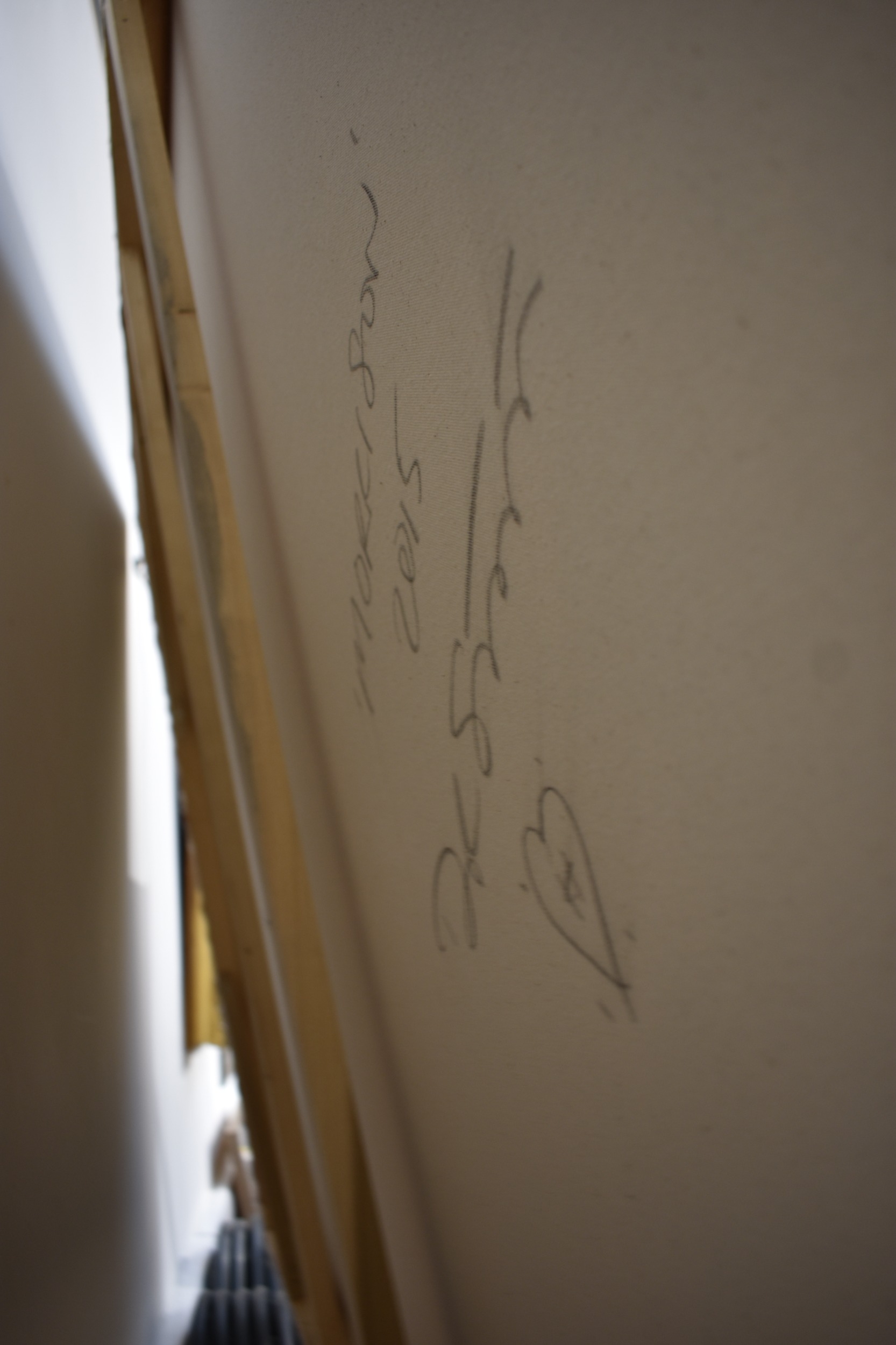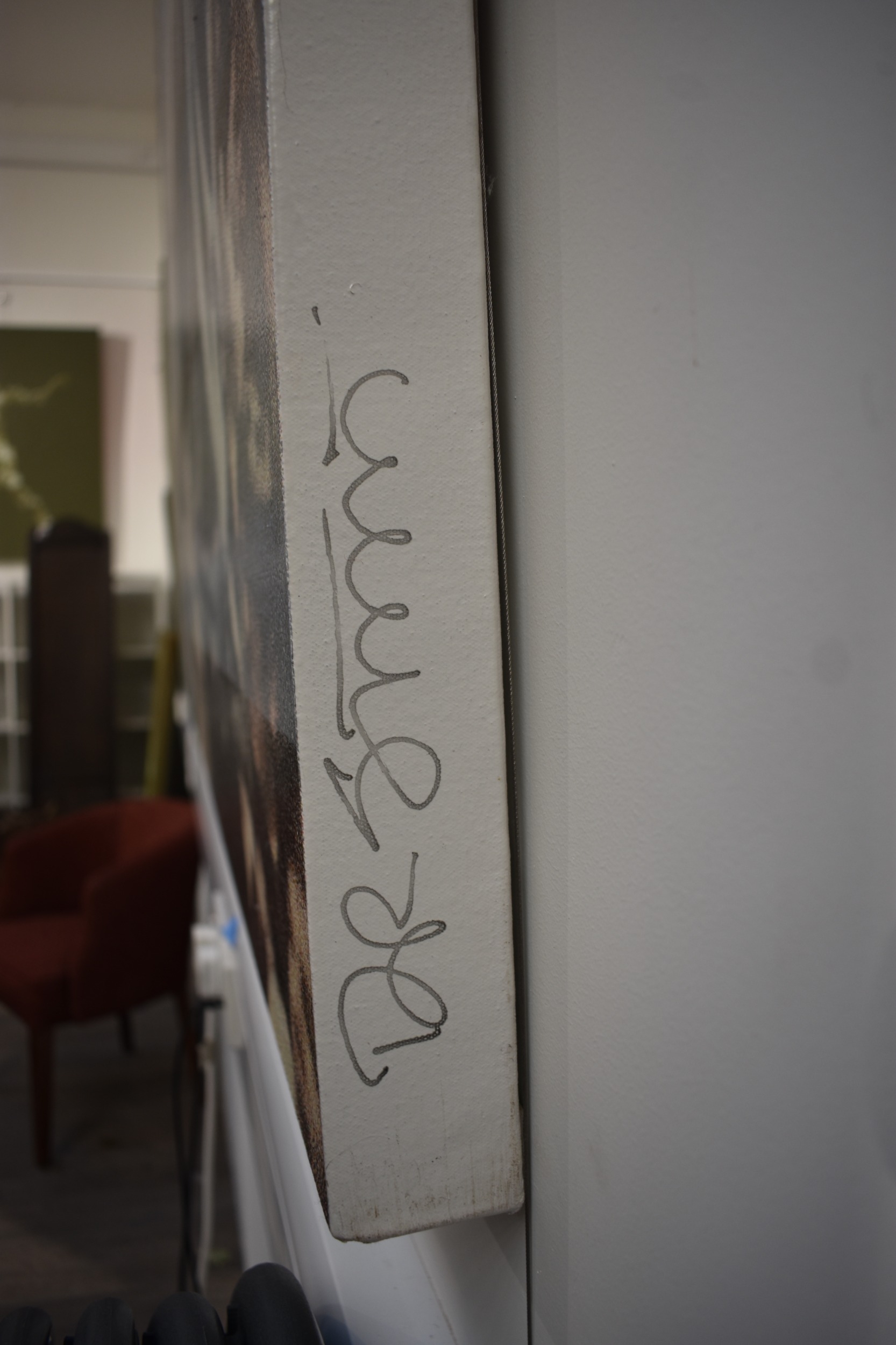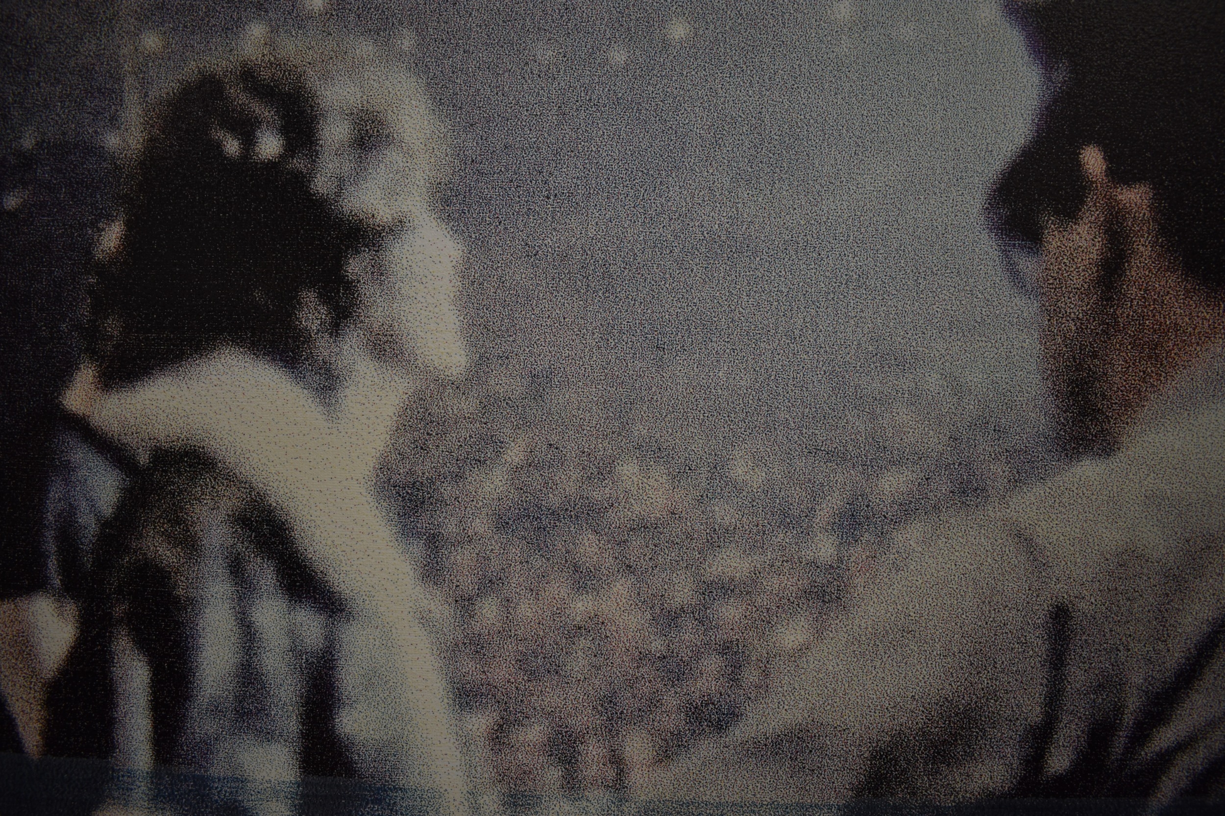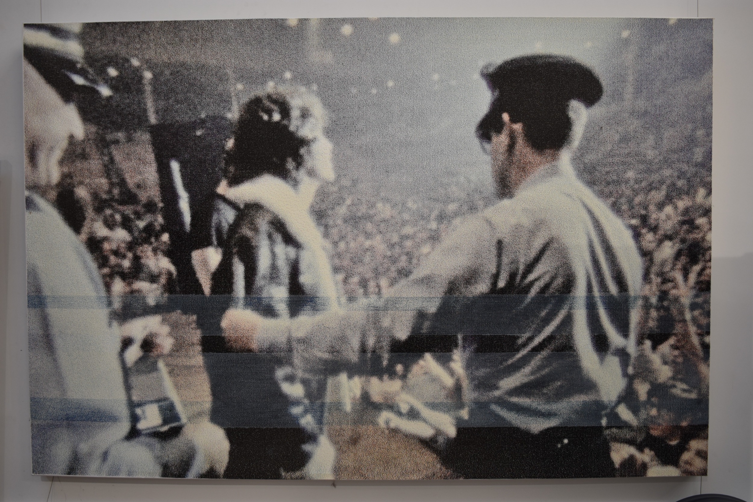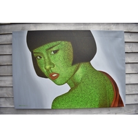 DOUGLAS STEWART (b.1960) US-based contemporary artist: "Morrison" from the "As seen on TV" series of oil paintings painted in the technique of pointillism. The artists image which is distorted like a old TV scene evokes a feeling of disquiet or apprehension partly produced by the artists natural tremor due to Parkinson's, oil on canvas, 122cm x 182cm