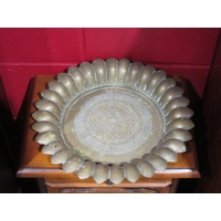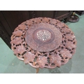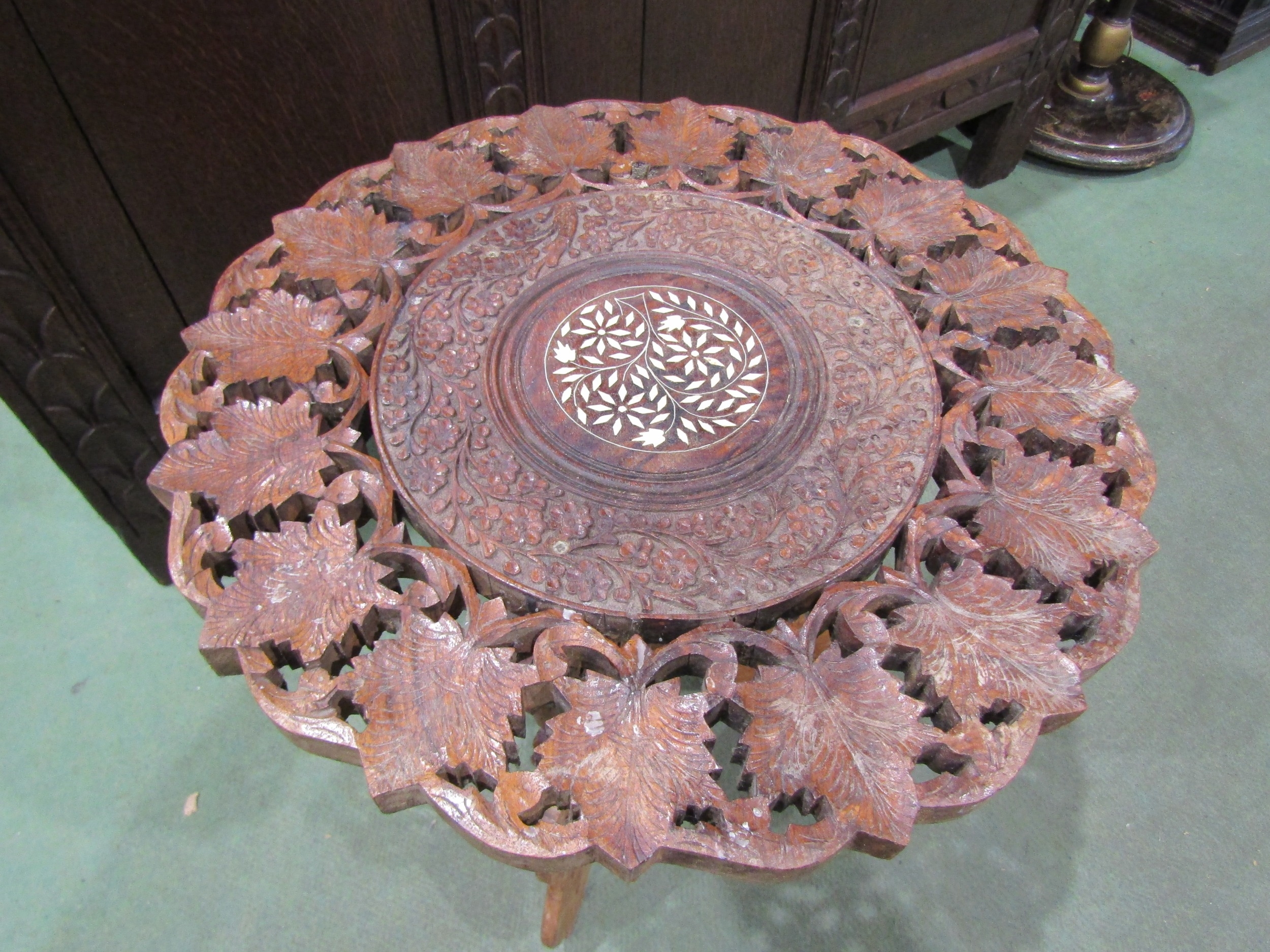 An Indian foliate carved folding occasional table, bone inlay to top, 46cm tall x 45cm diameter