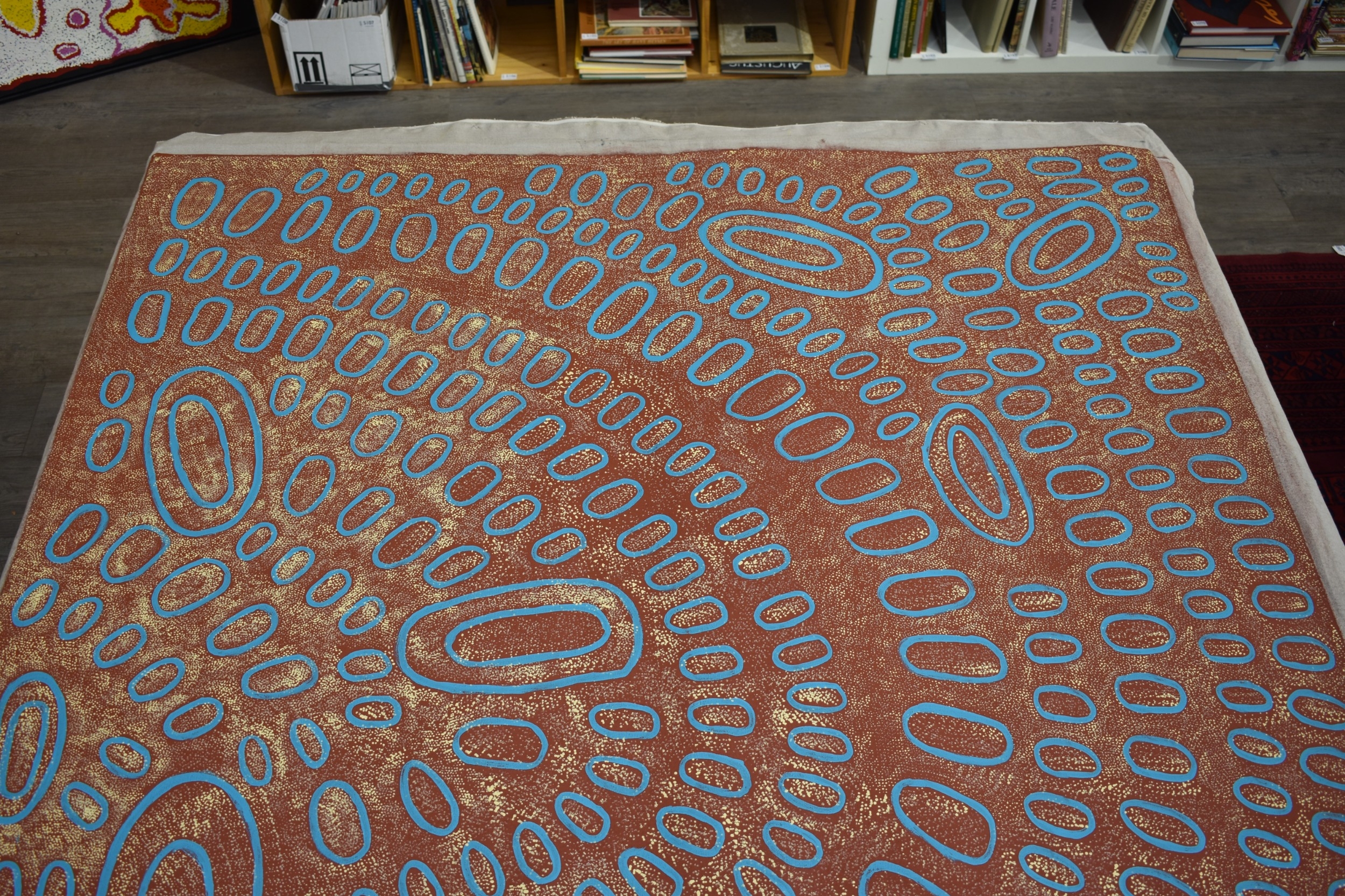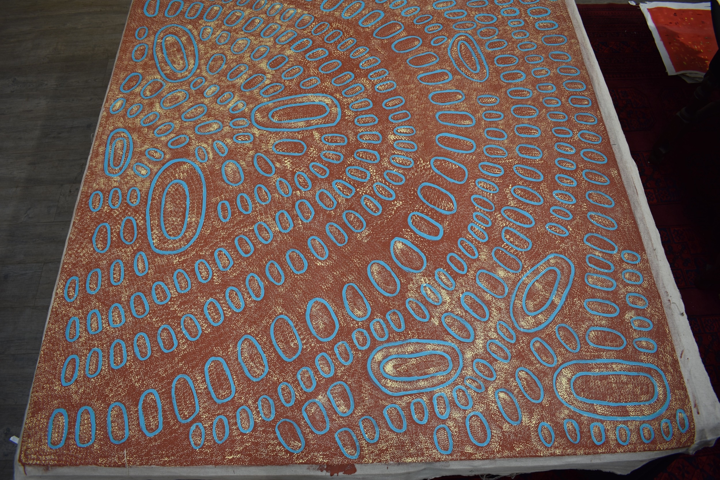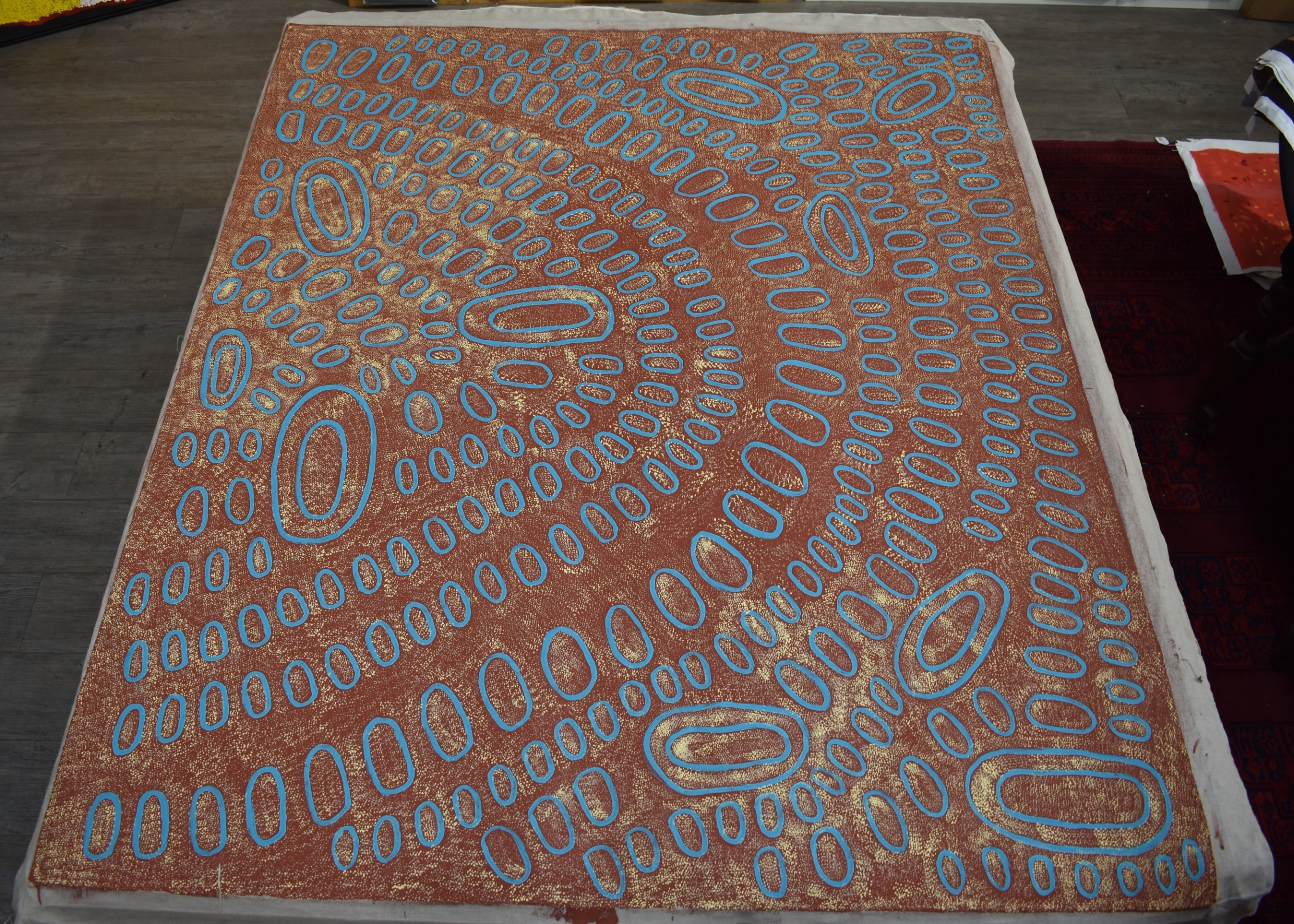 NGOIA POLLARD NAPALTJARRI (c1948-2022) Australian Aboriginal Contemporary Artist. Her works focus on her father's country around Yamunturrngu (Mount Liebig) and Nyrripi (Talarada), which is sacred Warlpiri territory associated with the "Water Snake" dreaming. unstretched polymer on canvas image size 180 X 149cm