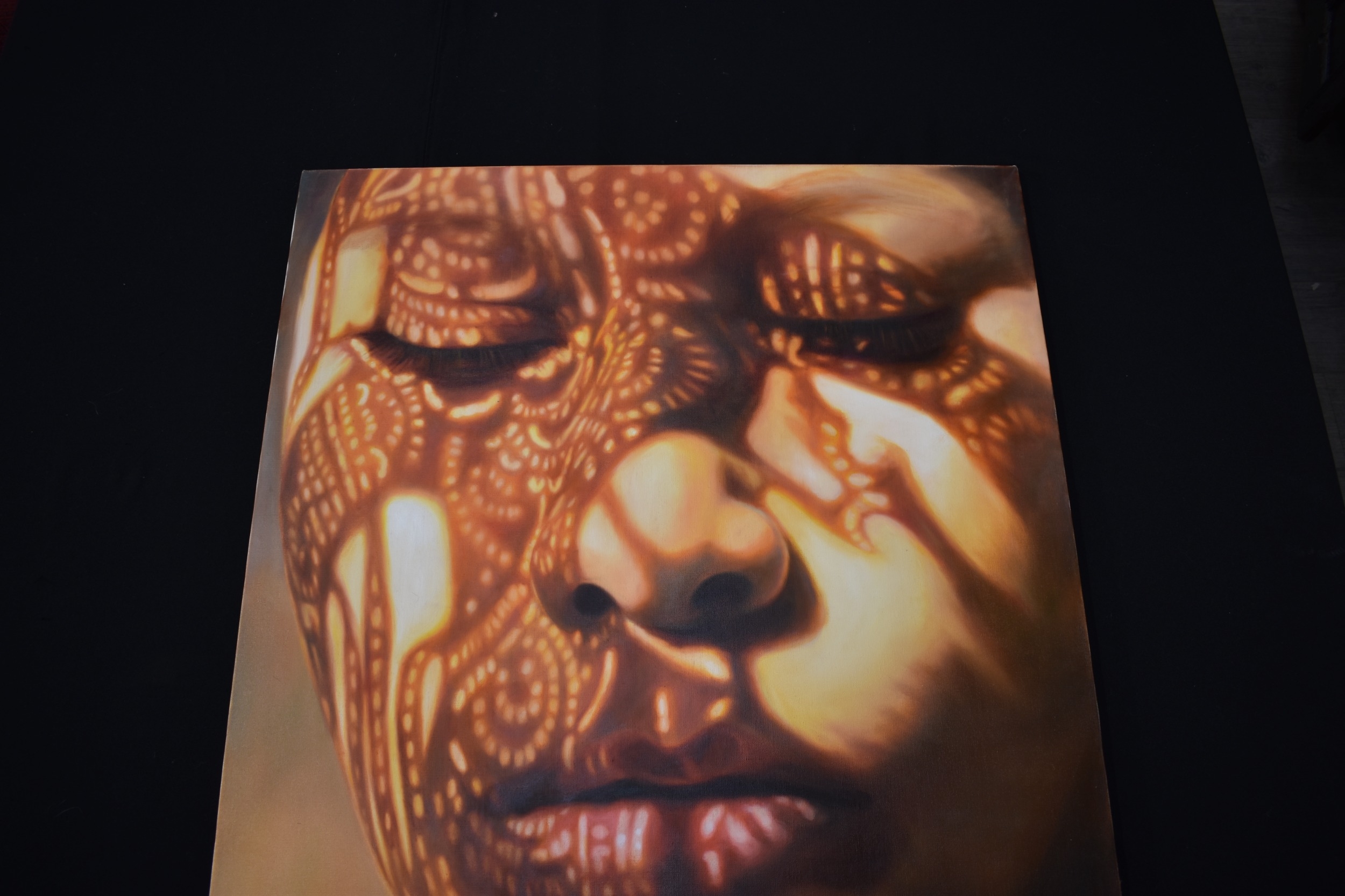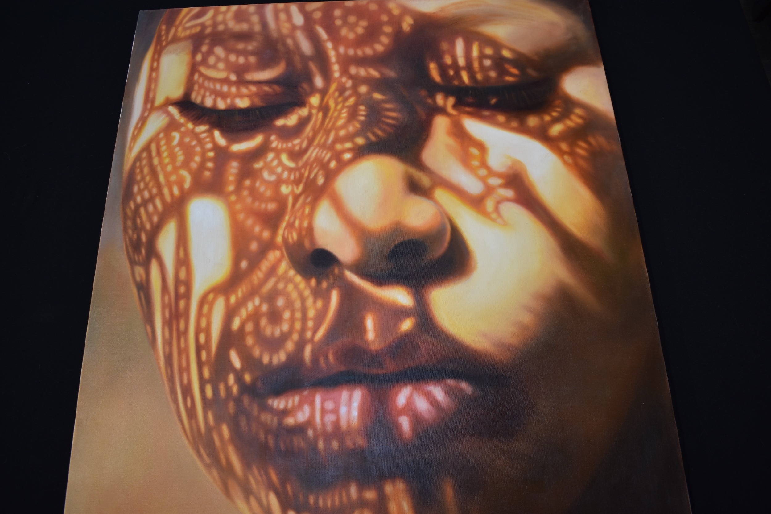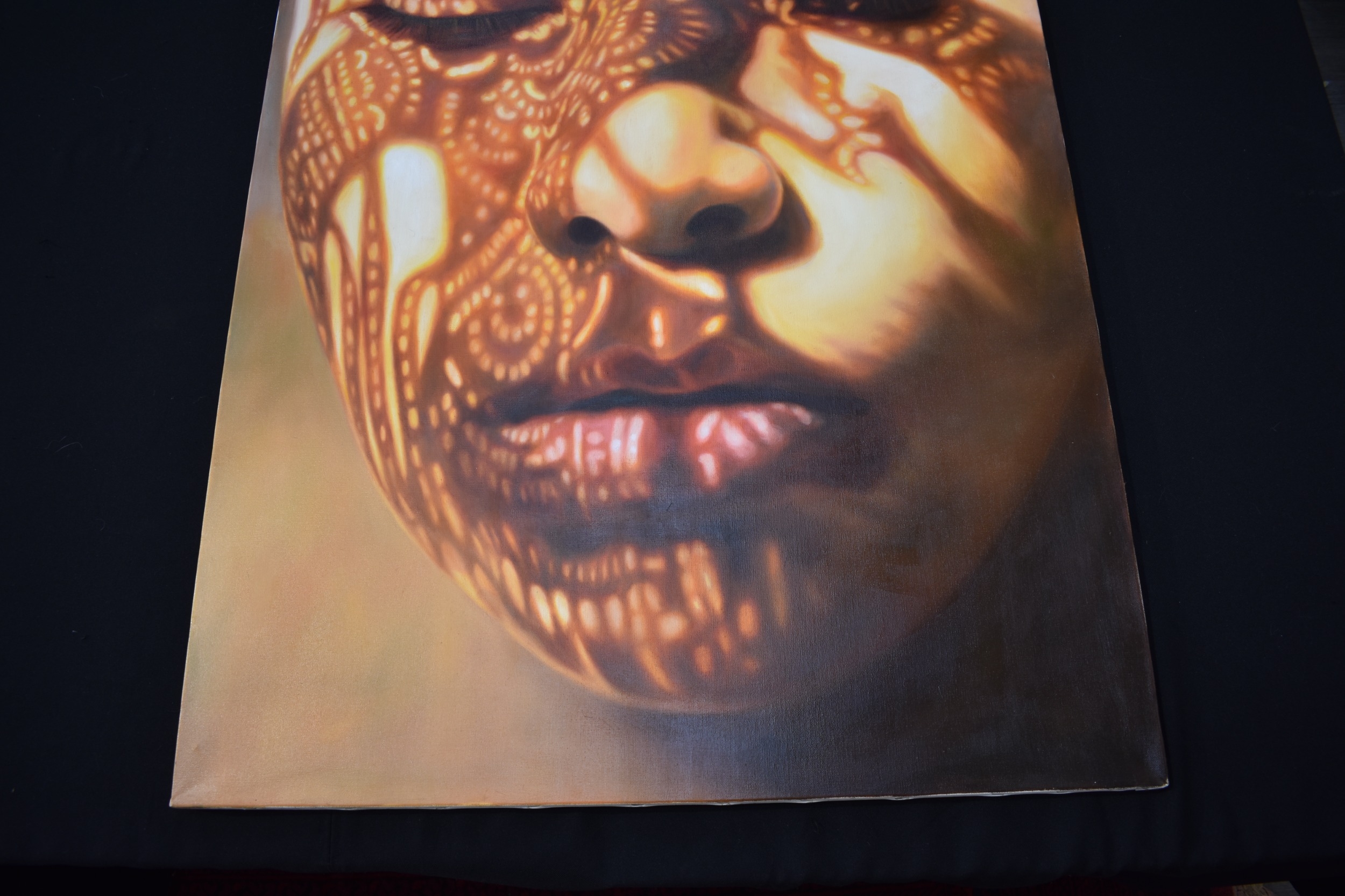 KARUNA PANUMES (b. 1967) Thai Contemporary Artist: Self-portrait executed in oils on canvas, in meticulous detail that make them stunningly life-like, they articulate her emotions with a spiritual intensity that's compelling and honest. Mysterious shadows and light patterns fall on her impassive features. These are rich in the symbolism of Thai culture. the canvas is untitled, not dated, stretched on a stretcher, no frame, 100cm x 80cm
