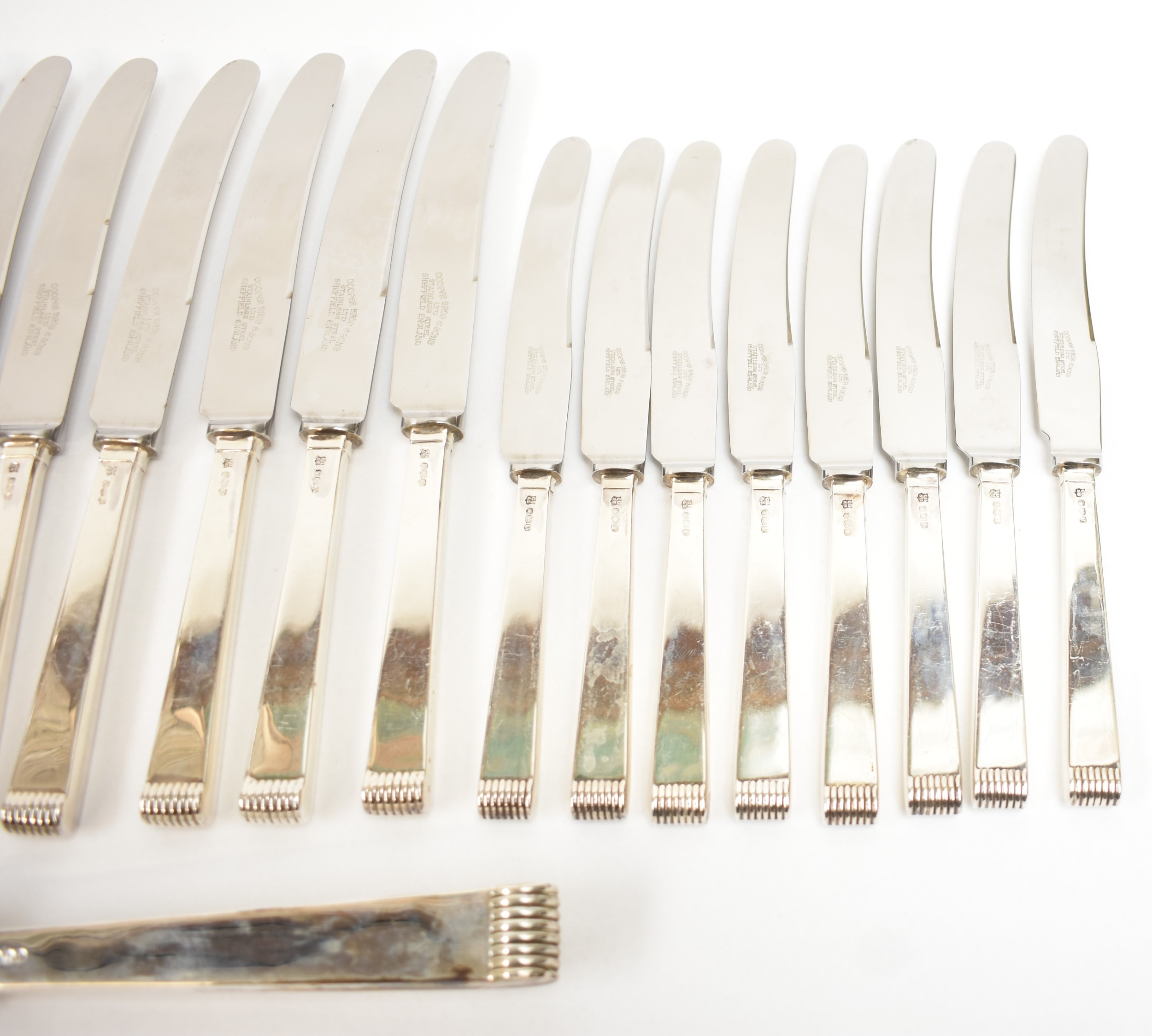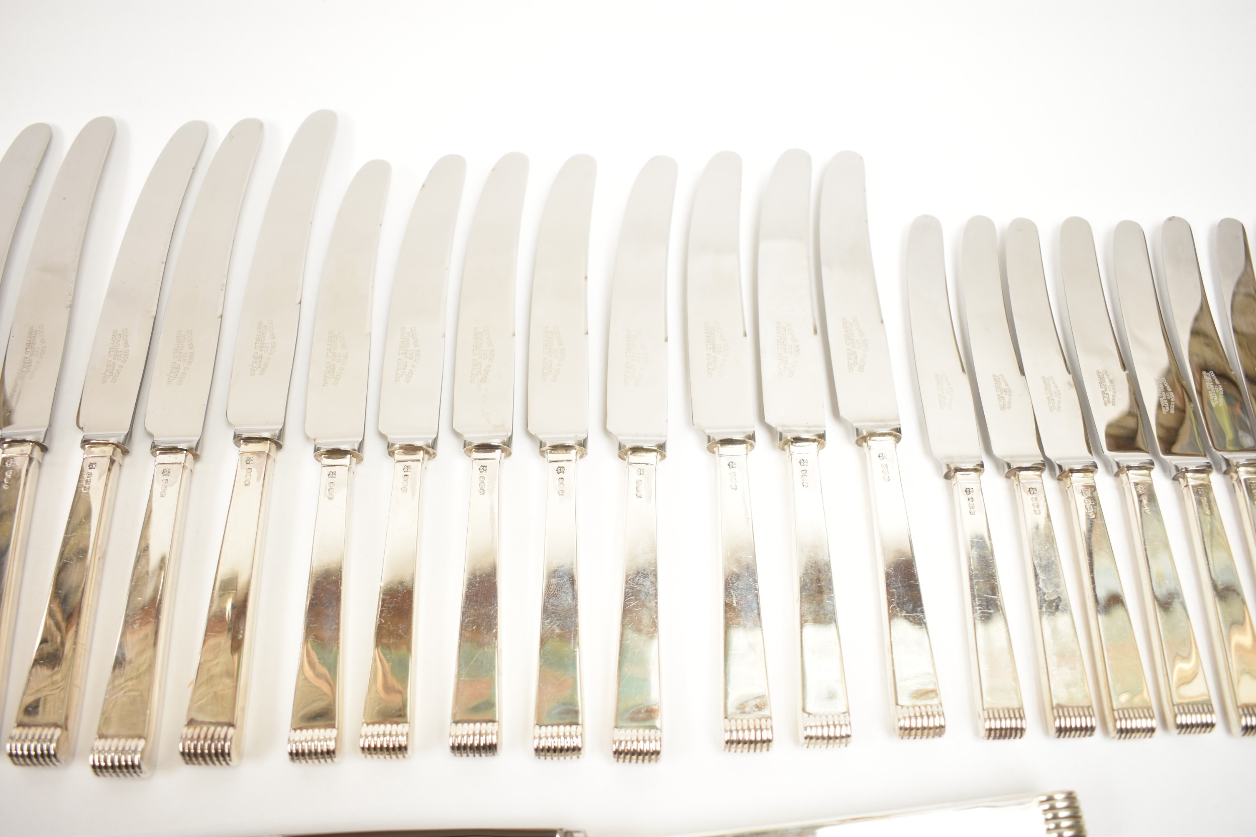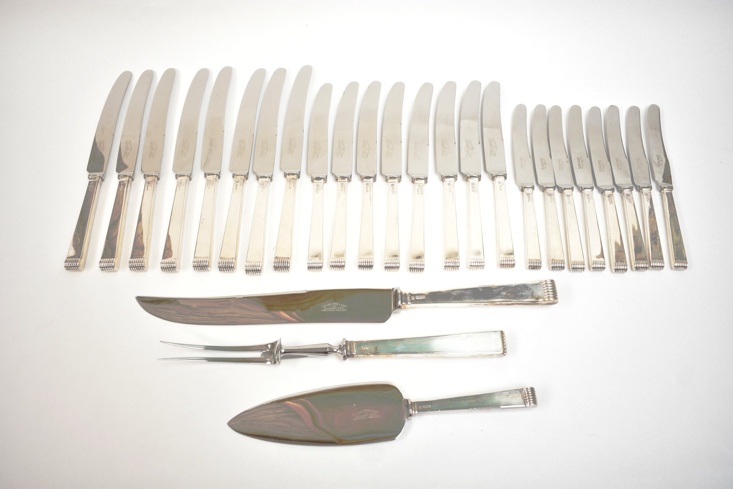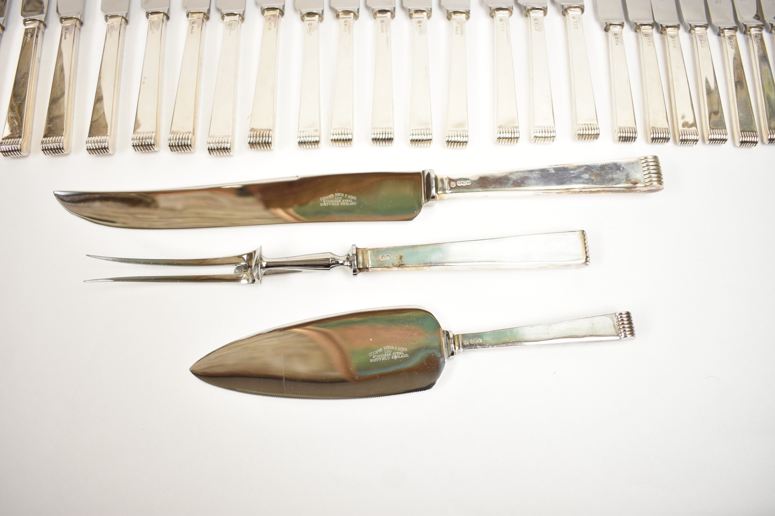 A Cooper Brothers & Sons Ltd silver eight place canteen of cutlery comprising four serving spoons, eight dessert spoons, eight small soup spoons, eight large soup spoons, eight cake forks, eight large forks, eight small forks, eight large knives, eight medium knives and eight small knives, carving set, cake slice and four other items, Sheffield 1963. Total weight of solid silver items is 2350g