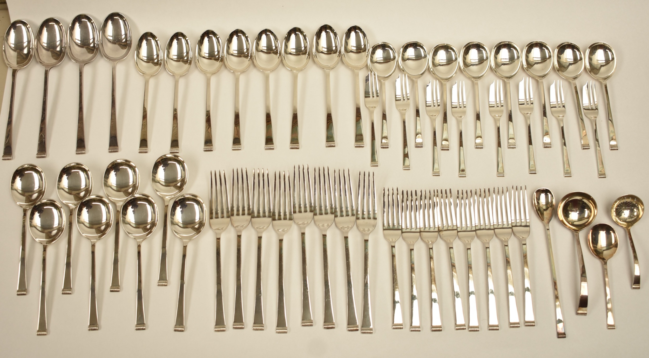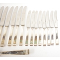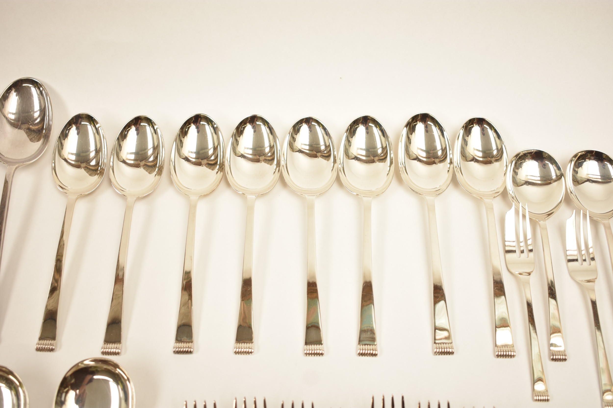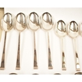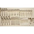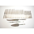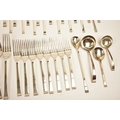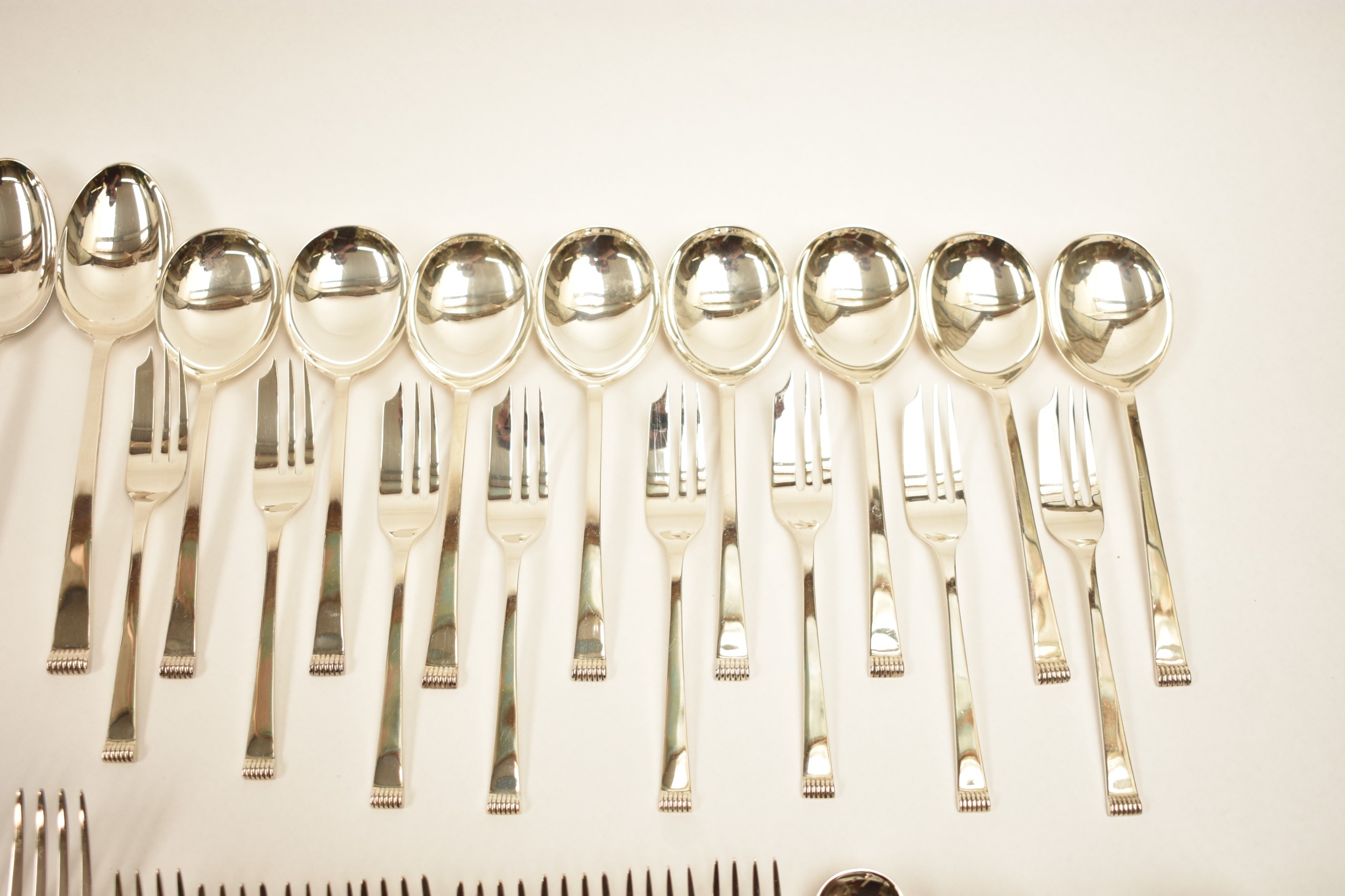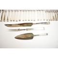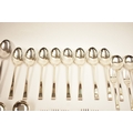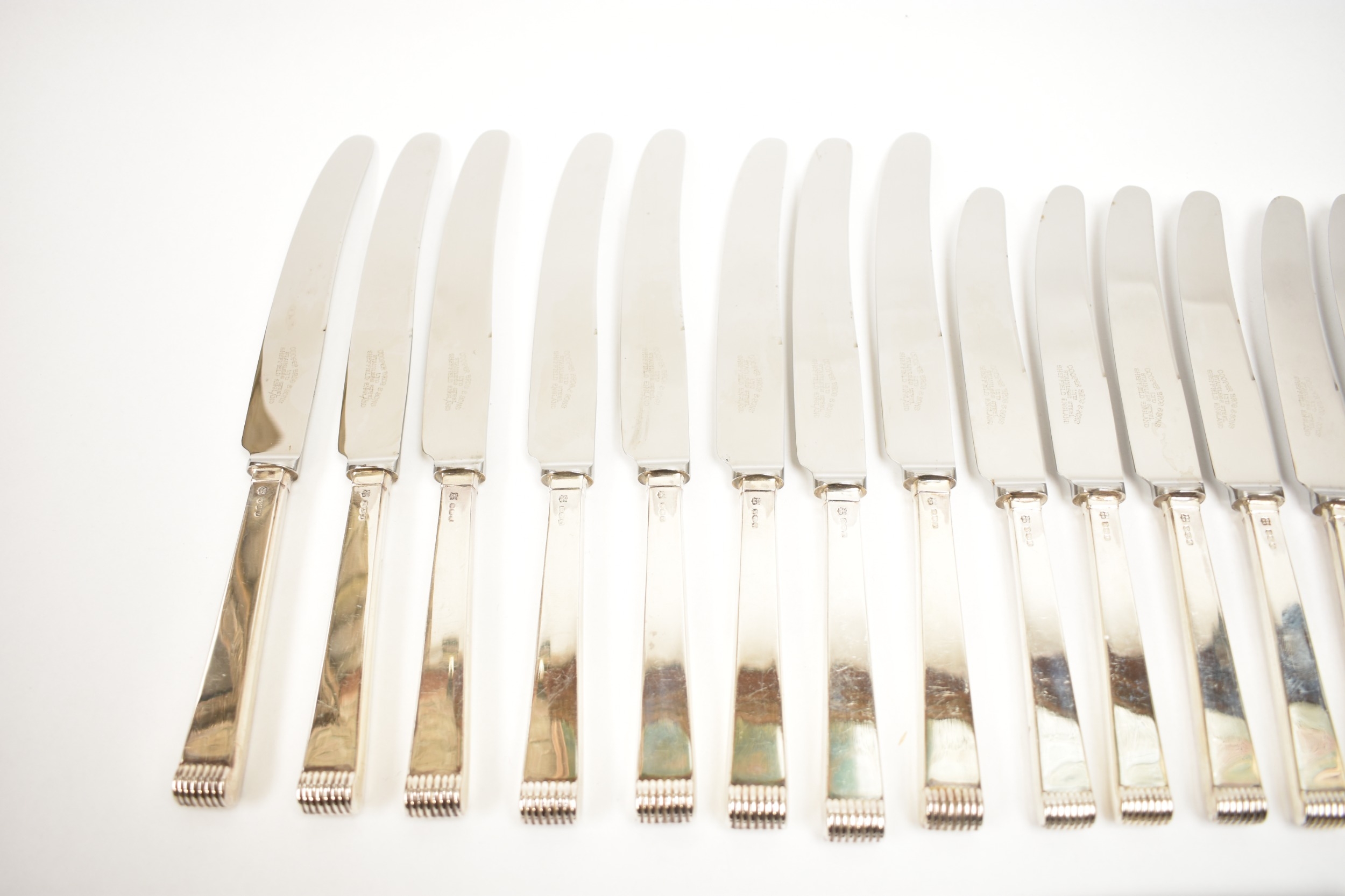 A Cooper Brothers & Sons Ltd silver eight place canteen of cutlery comprising four serving spoons, eight dessert spoons, eight small soup spoons, eight large soup spoons, eight cake forks, eight large forks, eight small forks, eight large knives, eight medium knives and eight small knives, carving set, cake slice and four other items, Sheffield 1963. Total weight of solid silver items is 2350g