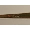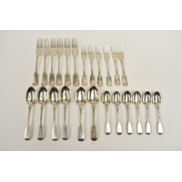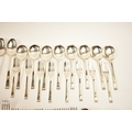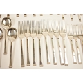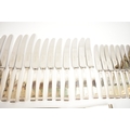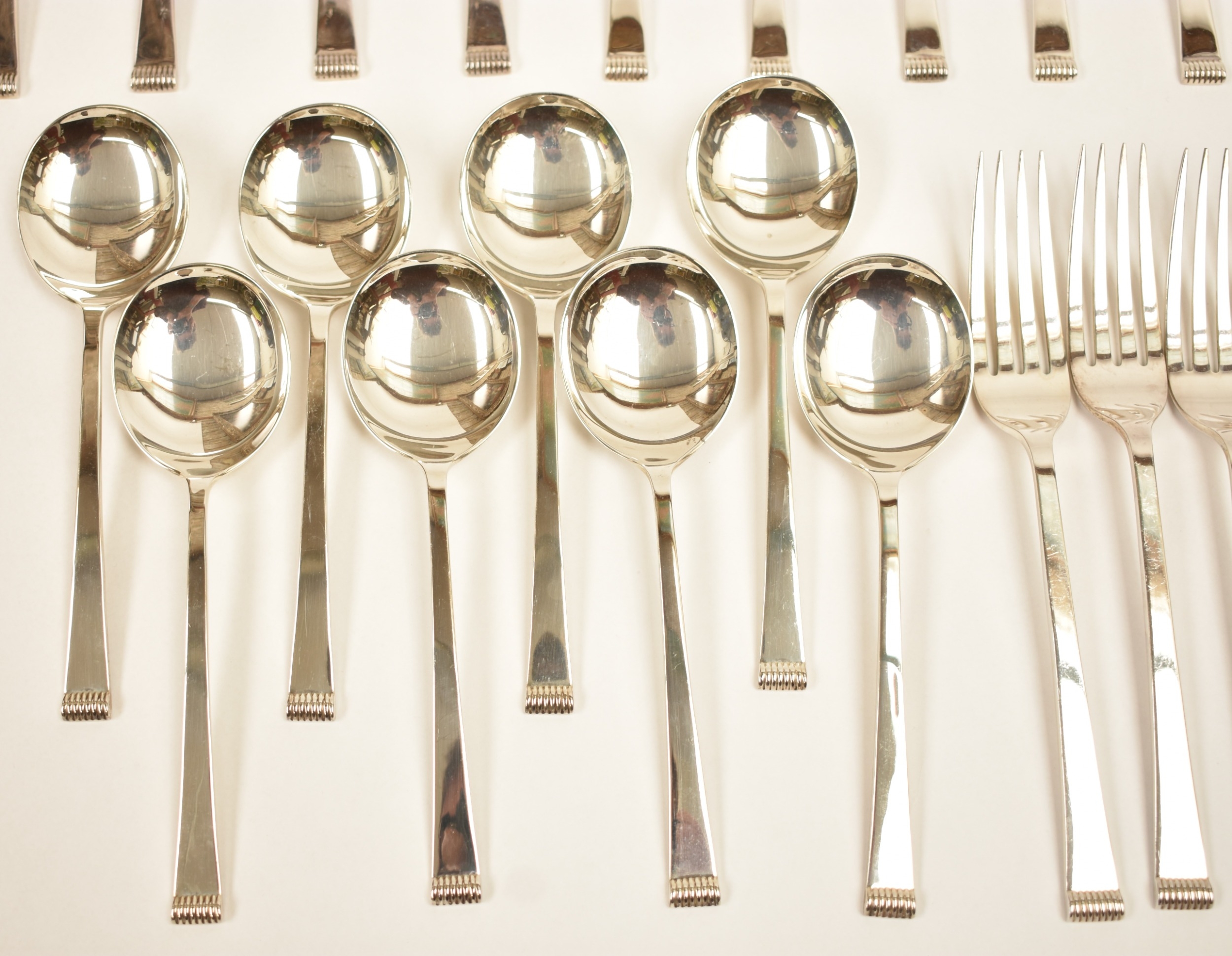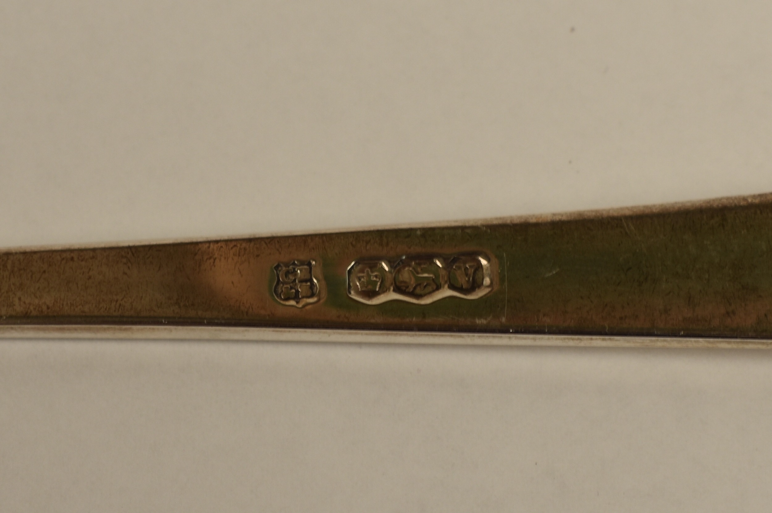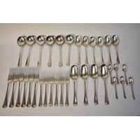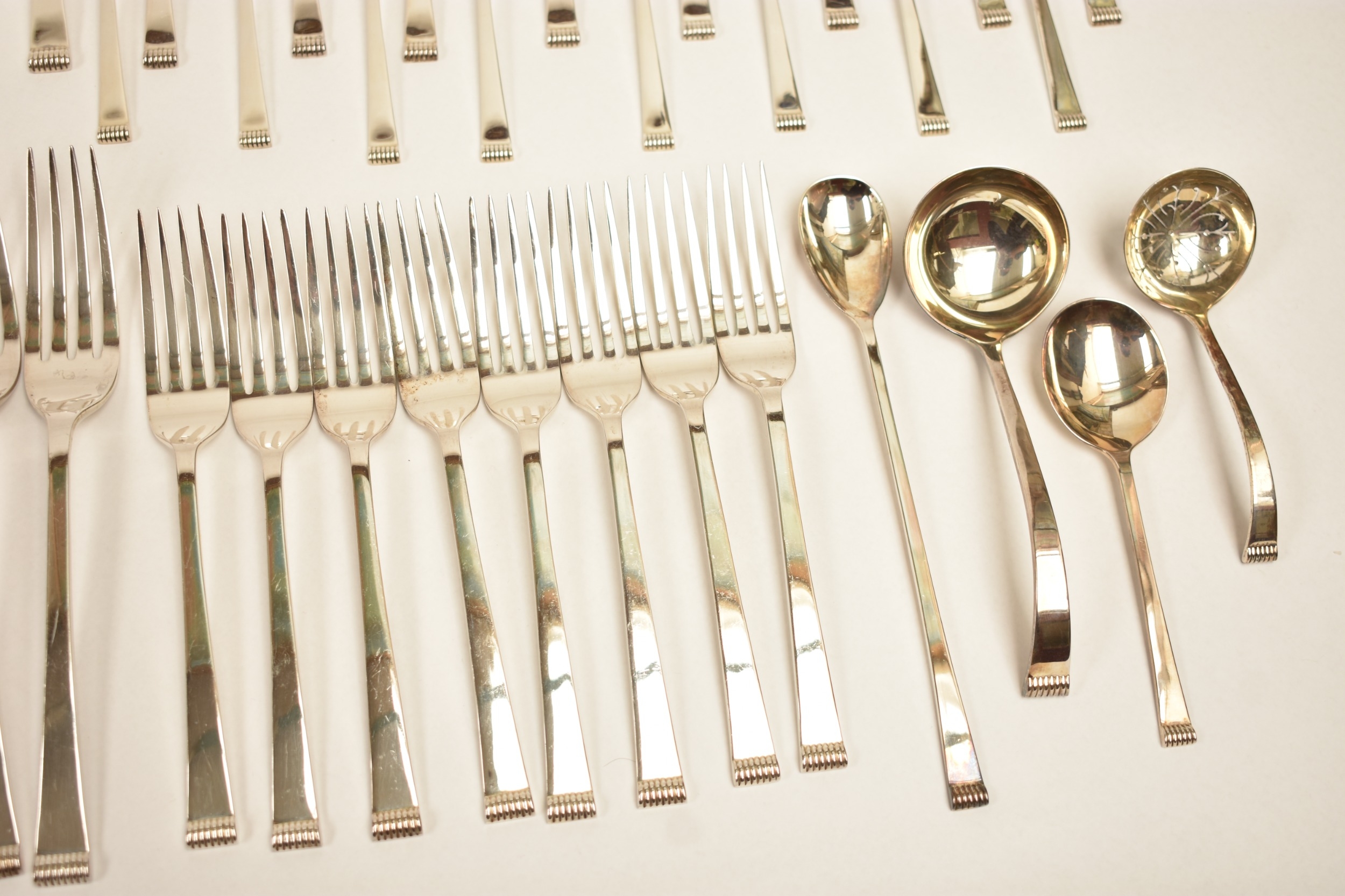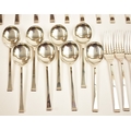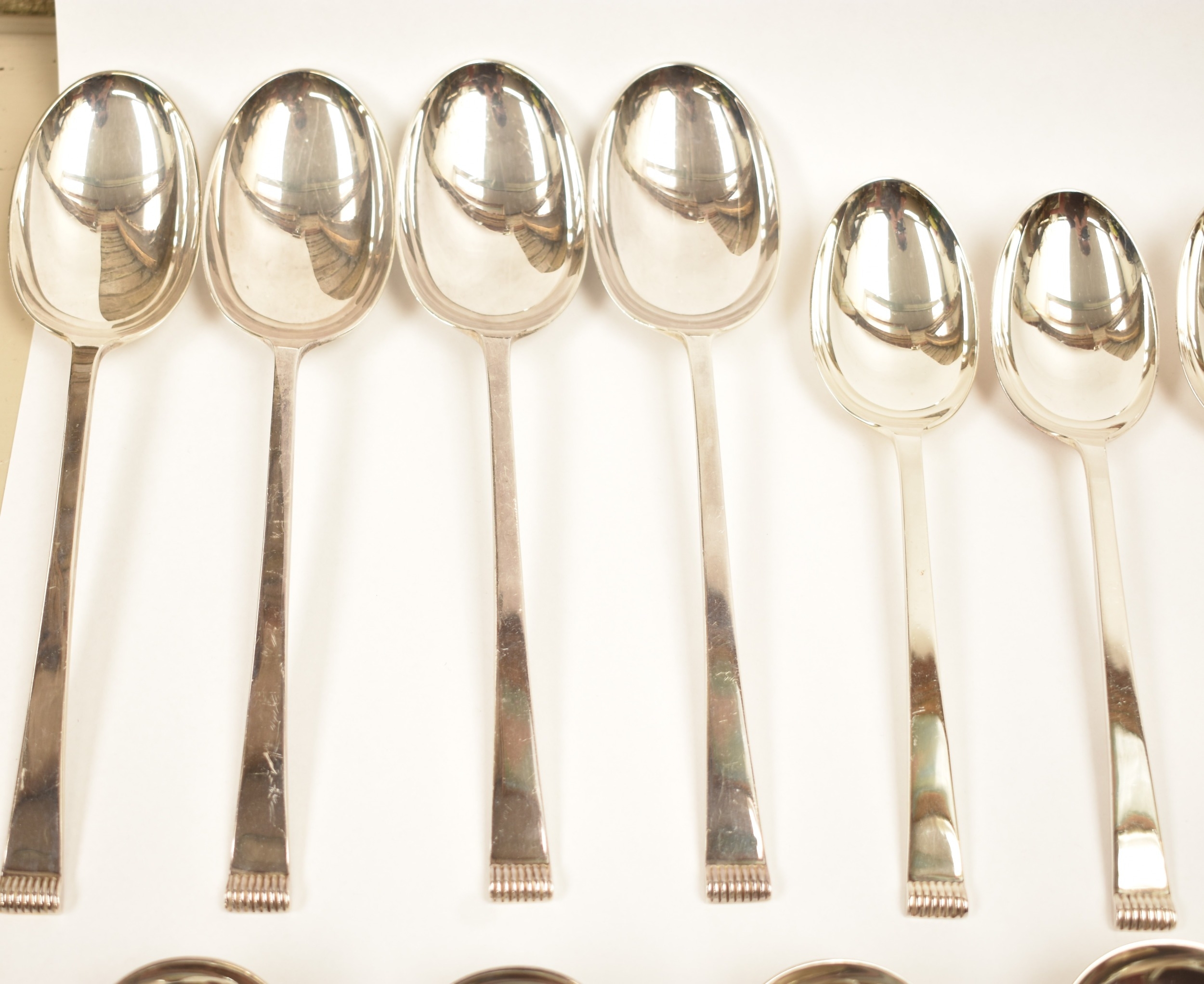 A Cooper Brothers & Sons Ltd silver eight place canteen of cutlery comprising four serving spoons, eight dessert spoons, eight small soup spoons, eight large soup spoons, eight cake forks, eight large forks, eight small forks, eight large knives, eight medium knives and eight small knives, carving set, cake slice and four other items, Sheffield 1963. Total weight of solid silver items is 2350g