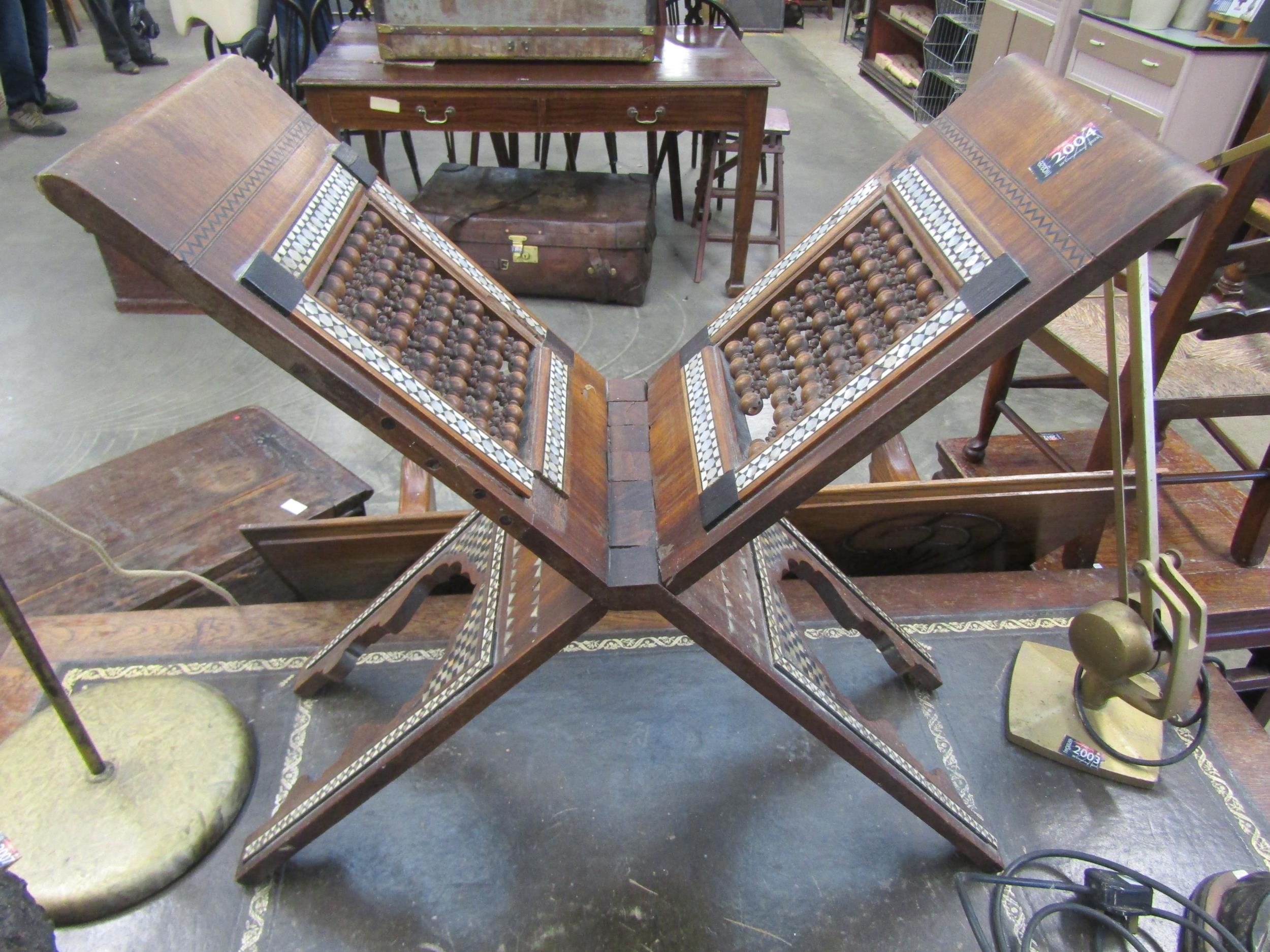 An ebonised and bone Quran stand with mother of pearl