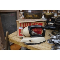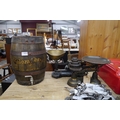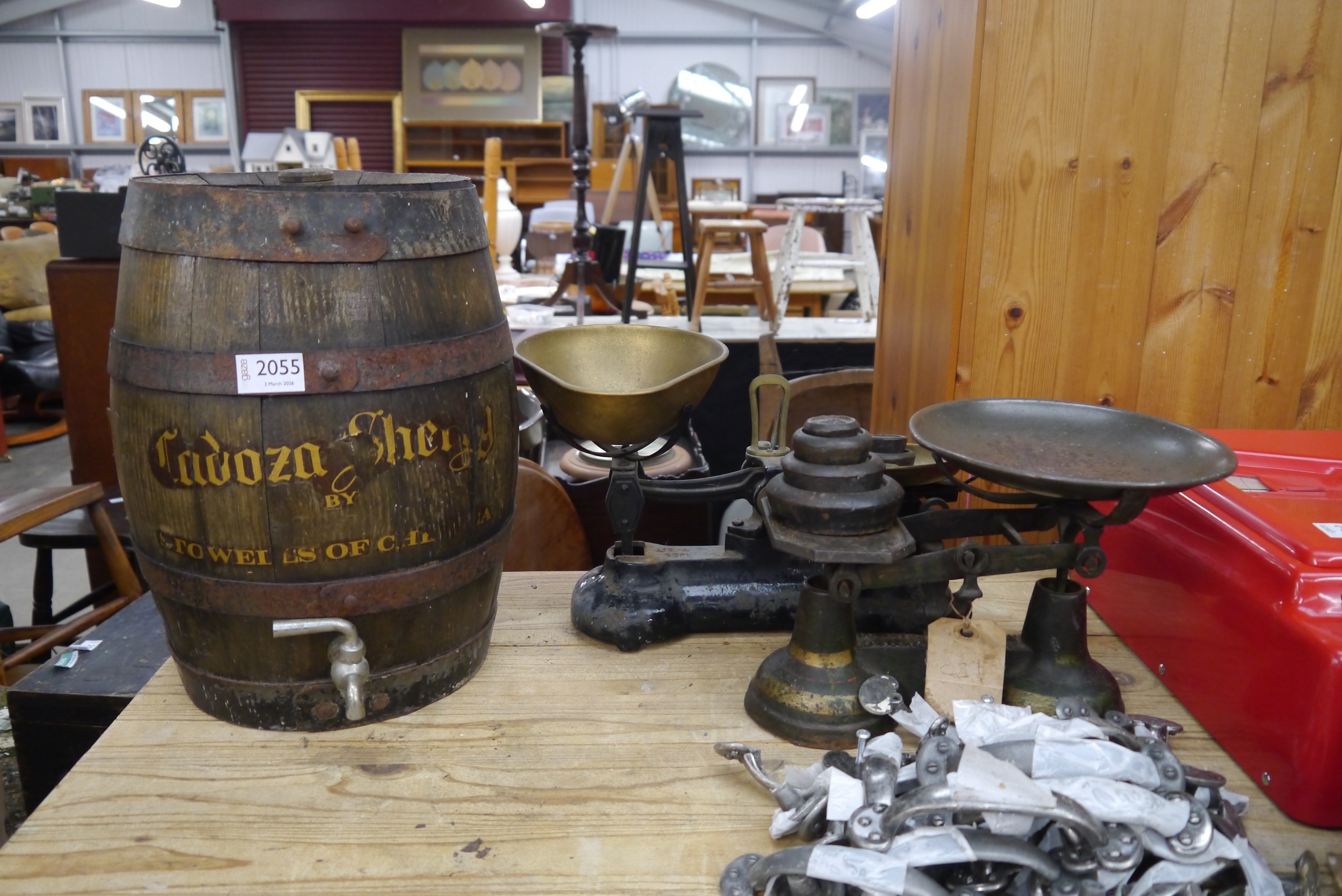 Two cast iron kitchen scales and a Sherry barrel